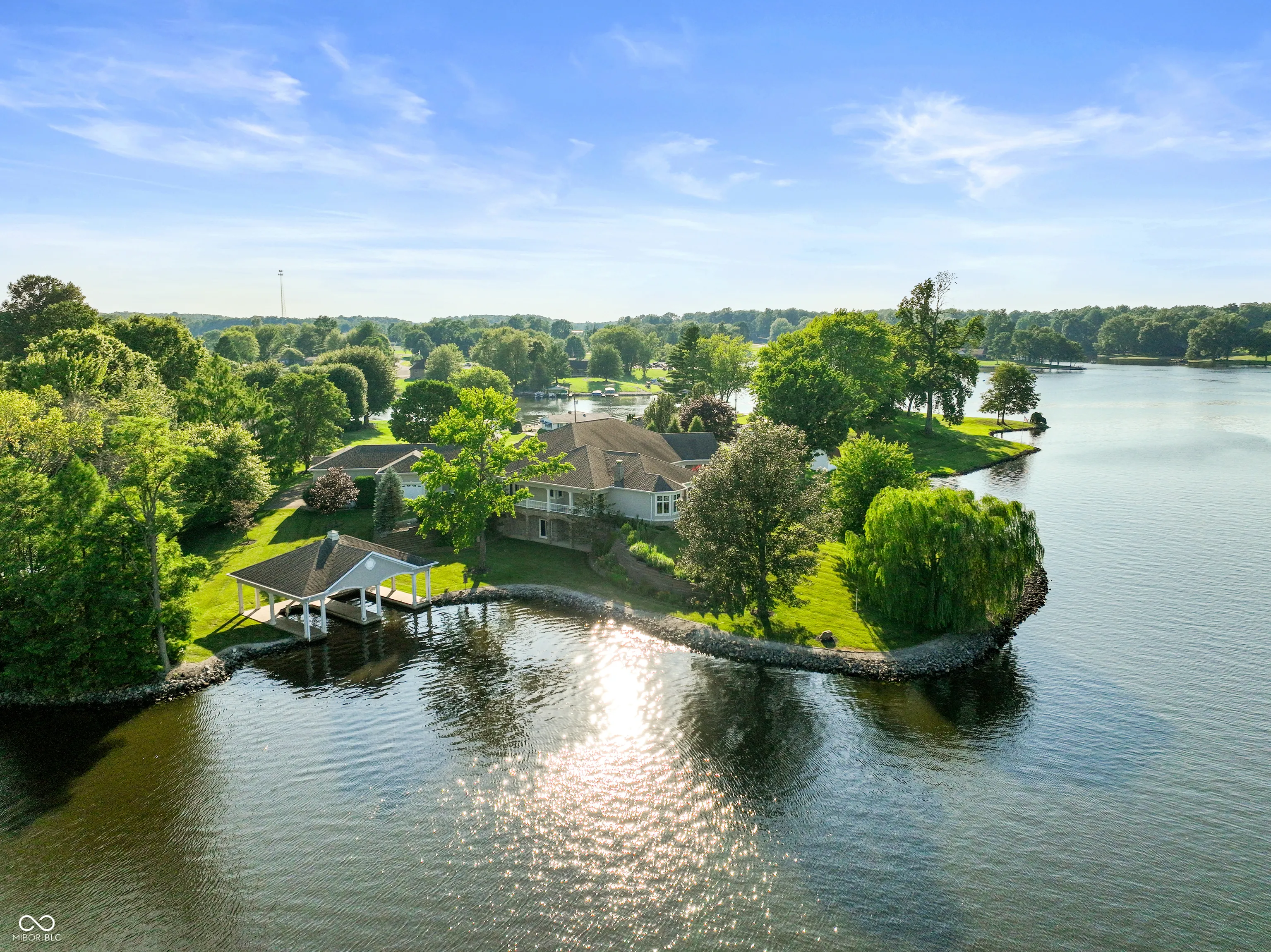 A premier Lake Santee home with panoramic water views and 4700 sq ft on the main level is now for sale. The home opens with a ceramic tile foyer, dining room and sitting area. The main level offers high ceilings, 3 bedrooms, 3.5 baths, an office with built-ins, a den with coffered ceiling, laundry/hobby room and a spacious kitchen with walk-in pantry, breakfast bar, prep island, double ovens and pull-out shelving. A breakfast nook adjoins the kitchen and has a beautiful lake view. The living room connects to a 11’x18′ screened porch, stamped concrete patios and the outdoors. The owner’s suite features stunning lake views, cathedral ceilings, a spa-like bath with a double sided fireplace, double vanities, makeup counter, a large shower and a spacious 12’x15′ ft walk-in closet. Two private entrances to the wraparound terrace offering peaceful outdoor space. The lower level of the home is easily accessed by a wide staircase or elevator and can accommodate large gatherings. The great room has sliding doors to the lake and a roughed-in fireplace while the rec room is prepped for a wet bar and has ample space for a pool table and more. Two more bedrooms offer private lake access; one features a full bath, room for a sitting area and walk-in closet. In addition, there is a family room with easy access to the lake or boat dock. This level also has 2 storage rooms and storm shelter. The oversized 3 car garage features built-in cabinets, half bathroom and one bay with a four foot bump out. There is a 4th bay to accommodate a utility vehicle. Home also has a full house Generac generator and 400-amp electric service. The double-slip boathouse includes an electric boat lift and an additional bay for a second boat. The property, just shy of 1.25 acres, is located on a cul-de-sac, with approximately 500 feet of protected shoreline. Seller is offering a $125,000 allowance with an acceptable offer due to the age of the roof and to assist with replacement of flooring on main level.