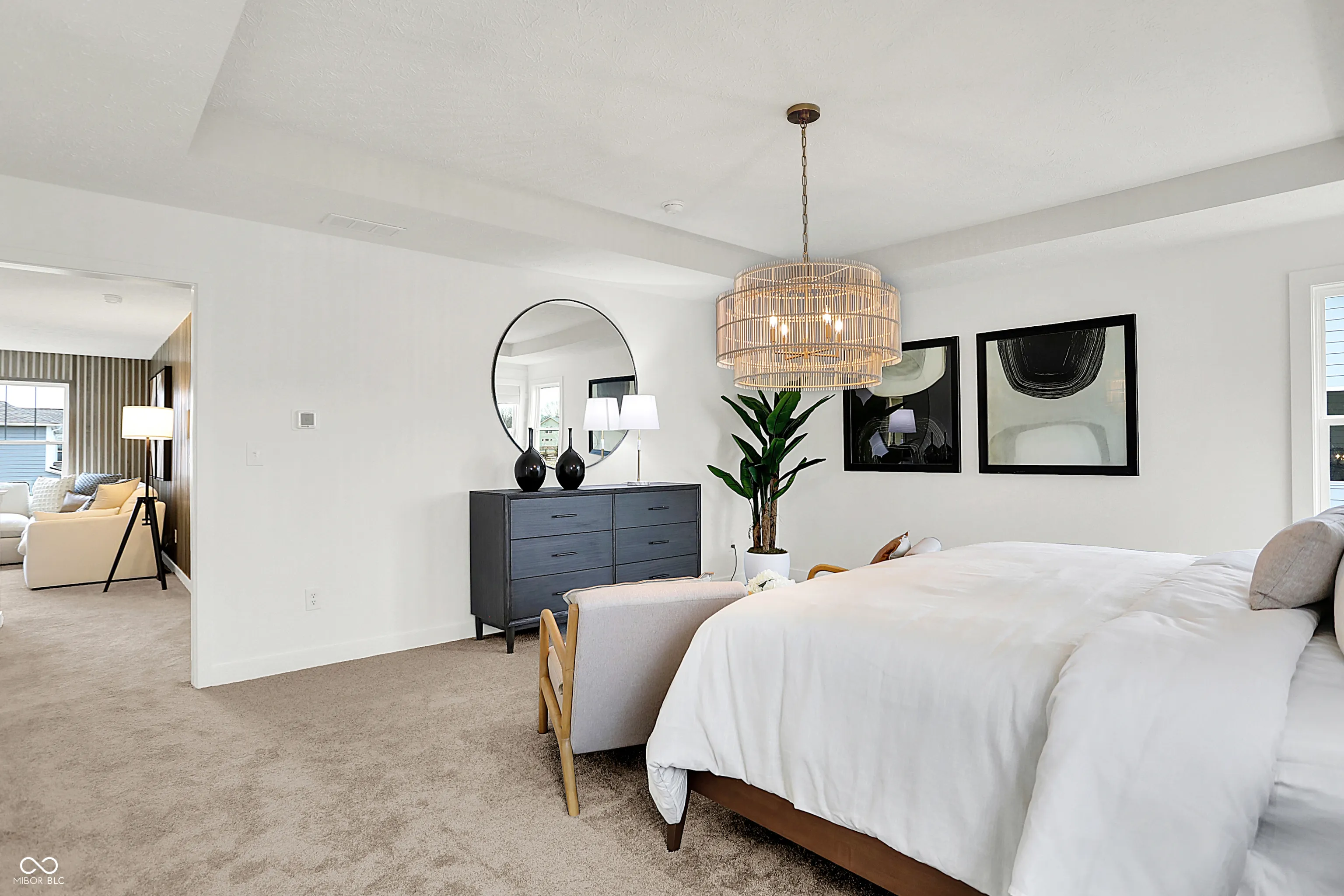 Architecture SL offers some of the largest single-family homes available at Ravinia, a lavish master-planned community coming soon to Westfield, IN. Built with a focus on active living, onsite amenities include a swimming pool, playground, walking trails, a basketball court and pickleball court. Westfield is home to a charming downtown district, highly regarded Westfield Washington schools, championship golf courses and excellent city parks. Within three miles of Ravinia is the 29.6-acre Freedom Trail Park, featuring a playground, natural trails and a fishing pond. Less than six miles away is Clay Terrace shopping center, which offers a convenient grocery store, exclusive brands, specialty shops and over 30 yearly public events. A sophisticated take on a modern layout, this spacious two-story home offers endless possibilities. The main level features an expansive open-concept living area with the kitchen and dining area opening into the Great Room, ideal for entertaining. The study with French doors creates a private space for work or hobbies, and a guest suite offers a restful retreat for overnight visitors. A covered porch off the main living space provides an extension of the entertaining space or a comfortable space to relax outdoors. Residing upstairs is the lavish owner’s suite and three secondary bedrooms, each with a walk-in closet. A versatile loft adds additional space for activities or relaxation. Rounding out the home is a desirable three-car garage. *Photos/Tour of model may show features not selected in home.
