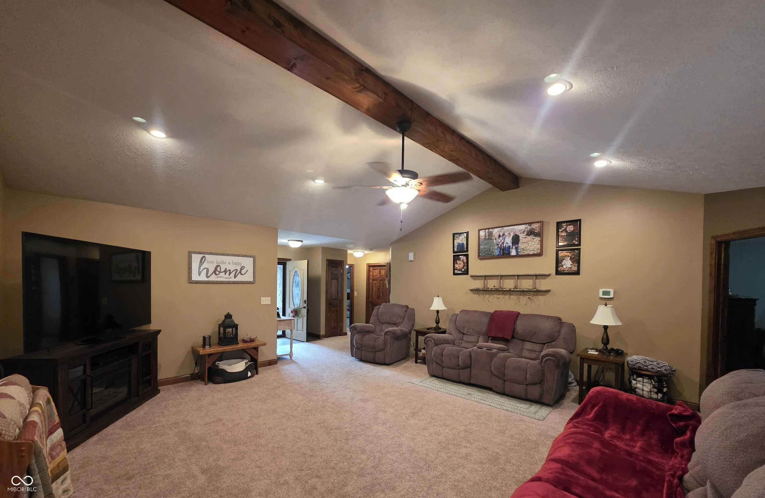 Lakefront Living on a Quiet No Exit Drive 201 S Westwood Drive | Westport, IN Welcome home to this beautifully maintained brick, lakeside retreat, perfectly situated on a peaceful no exit drive. Offering the rare combination of privacy, water views, and functional design, this single story home is an exceptional opportunity for relaxed, everyday living. Step inside and you’re greeted by a spacious living room designed to impress, featuring a distinctive beamed ceiling and soaring vaulted height that creates an airy, open feel-ideal for both quiet evenings and entertaining guests. The open floor plan flows seamlessly into the kitchen, where thoughtful design meets everyday practicality. Enjoy shaker style cabinetry with ample storage, a tasteful backsplash that adds visual appeal, and a convenient peninsula perfect for meal prep, casual dining, or gathering with friends. This home offers three comfortable bedrooms and two full bathrooms across 1,556 square feet, delivering a smart and efficient layout that maximizes livability. A dedicated laundry room adds convenience, while the single level design supports easy day to day living. Outside, the lifestyle truly shines. A welcoming patio extends your living space, creating the perfect spot to relax, entertain, or simply take in the surroundings. The home sits on an expansive near half acre lot, providing room to enjoy the outdoors while embracing the tranquility of lakefront living.