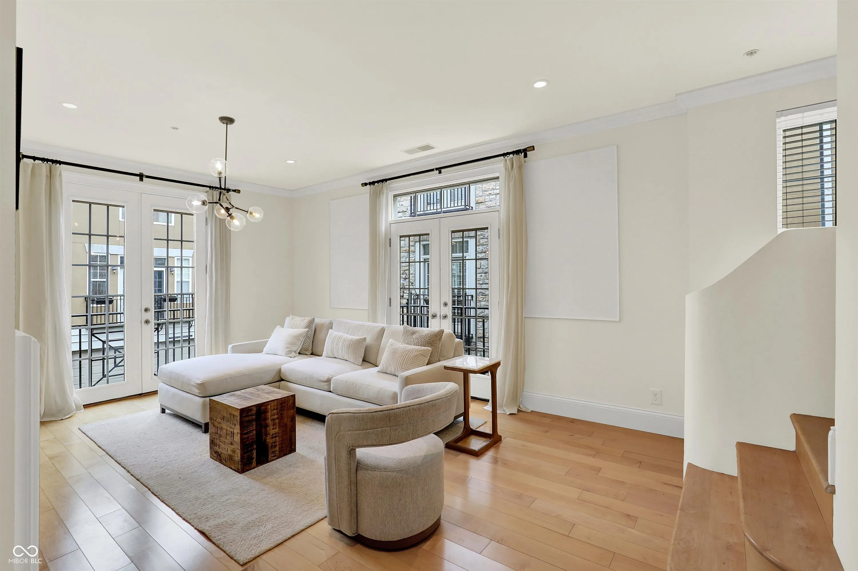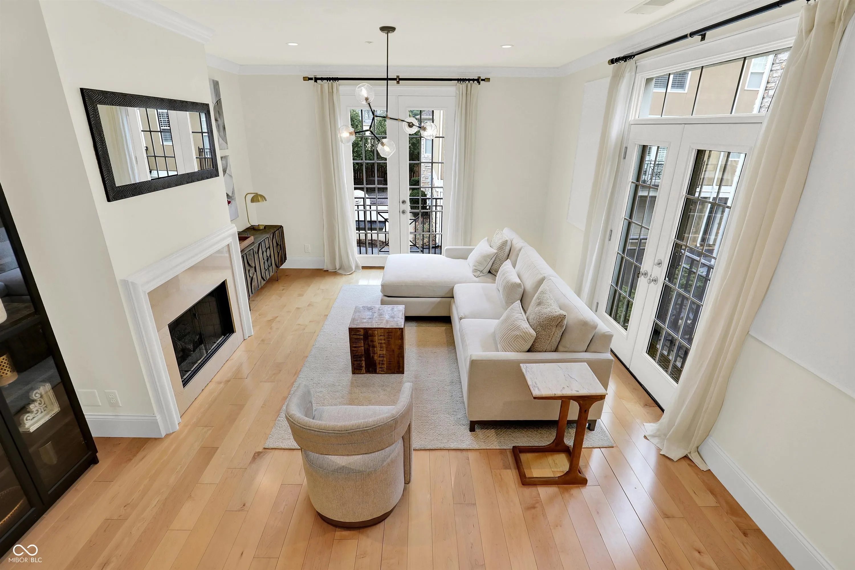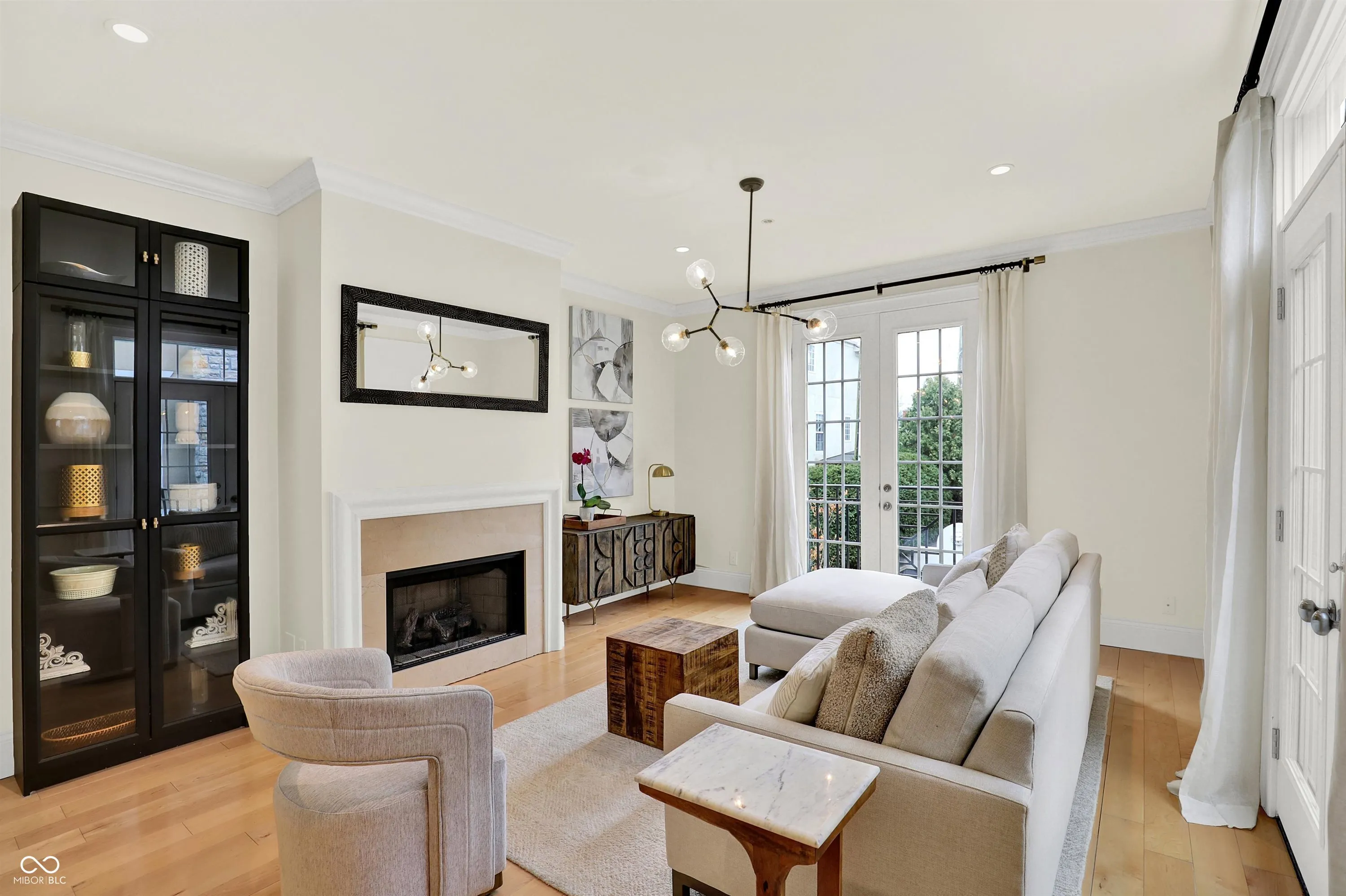 A beautifully designed residence at Monon Row, this architectural townhouse is filled with natural light and effortless sophistication. Dramatic floor-to-ceiling windows pour sunlight into every level, while elegant French doors and charming Juliet balconies invite fresh air and create a seamless connection to the vibrant surroundings including the soft sound of the European fountain. Its European-inspired character, the community feels like a tucked-away enclave, and this home lives like a Parisian pied-a-terre – intimate yet refined, stylish yet wonderfully comfortable. It is a space that feels elevated yet welcoming from the moment you enter. The open, airy interiors are designed for living well. Morning coffee feels brighter in the sunlit living spaces, evenings are perfect for gathering with friends, and quiet nights feel cozy within thoughtfully layered textures and custom millwork. Each room flows naturally into the next, creating a sense of ease and intention throughout. The recently finished lower level offers exceptional versatility – ideal for a private home office, creative studio, or quiet retreat – complete with a thoughtfully tucked-in sleeping space for overnight guests. Designer finishes and bespoke details are integrated at every turn, blending timeless architectural elements with modern convenience. Clean lines are balanced by warm materials and curated selections, giving the home a polished yet personal feel. Built with high quality materials, including sound proofing considerations…pin drop quiet on this end unit. More than a townhouse, this is a refined urban retreat both cosmopolitan and intimate – a true designer residence in the heart of the city, where beauty, comfort, and lifestyle come together effortlessly. An extensive list of curated enhancements has transformed this residence into a turnkey retreat. The details are best appreciated in person – arrange your exclusive private tour today.