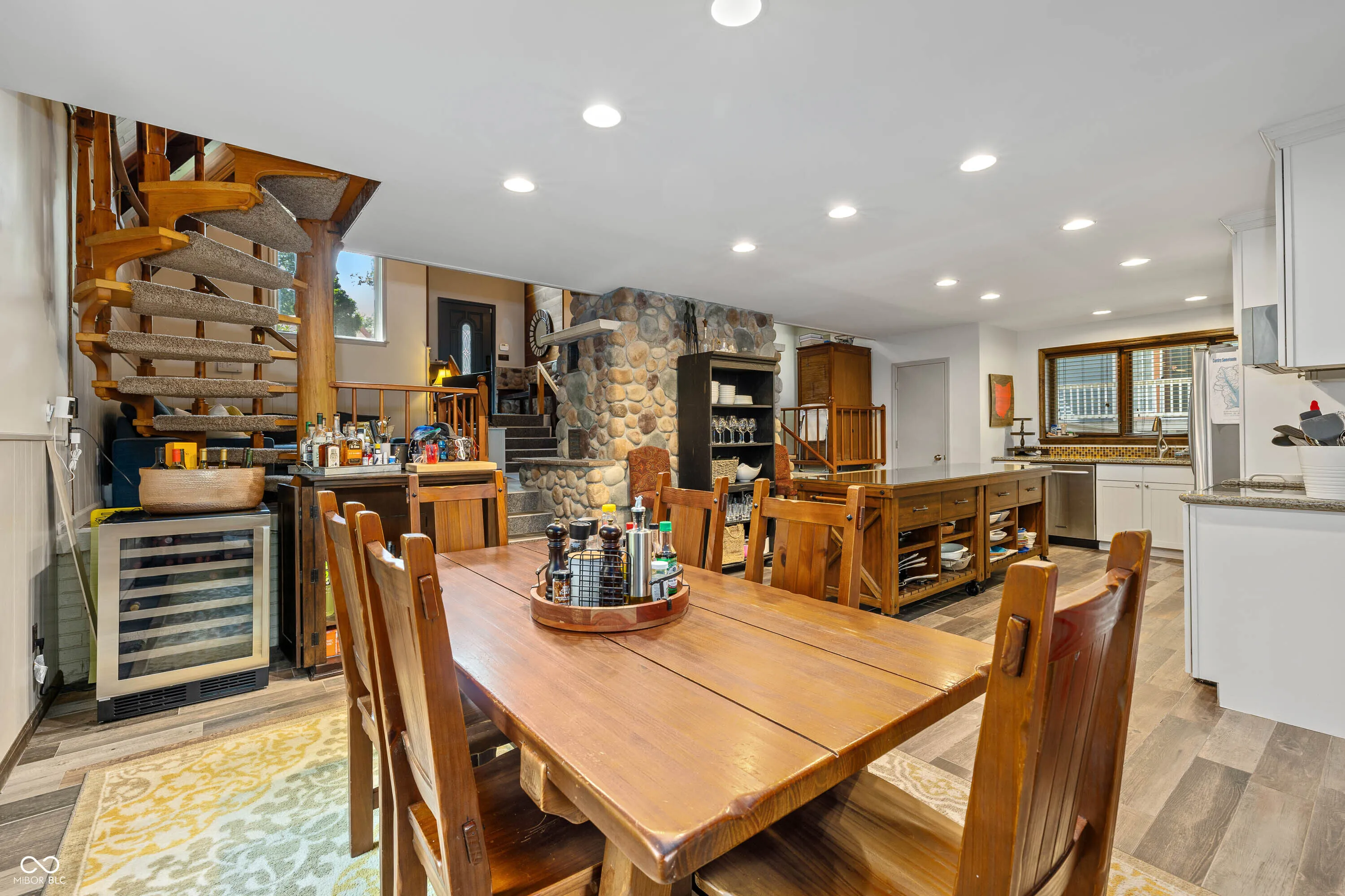 This 2424 sq. ft. home is loaded with exceptional amenities and thoughtfully designed spaces, this stunning private lake property offers comfort, character, and endless opportunities to entertain. The expansive great room features a vaulted natural wood ceiling, a striking stone masonry wood-burning fireplace, beautiful stained-glass accents, and a dramatic spiral staircase that anchors the space with architectural charm. The fully updated kitchen and dining area showcase a large center island, oversized refrigerator, separate built-in ice machine, and a spacious walk-in pantry – ideal for hosting family and friends. The adjacent laundry area includes premium washer and dryer units, a utility sink, and abundant storage. Upstairs, the natural wood spiral staircase leads to the private primary suite, complete with an oversized walk-in shower and dual-sink vanity. Guests will appreciate the additional bedrooms, including one with direct access to a massive second-story screened-in porch overlooking breathtaking lake views. The lower level provides the perfect bunk room or recreation space for kids and guests. Outdoor living is equally impressive. Relax on the screened porch just off the kitchen, enjoy dinner on the back deck, or unwind by the fire pit in the evenings. The terraced backyard features custom boulder landscaping, adding both beauty and function. For water enthusiasts, this deep lake is one of the clearest bodies of water in all of Indiana. This property includes two separate covered boat slips, a large lakeside garage for storing all your water toys, and an expansive sundeck with ladder and stair access to the water. There is also a covered waterside deck equipped for TV viewing and entertaining. With power conveniently available throughout for audio and TV, this home is fully equipped for both relaxation and recreation. This property truly has it all – lake living at its finest. Make it yours today!