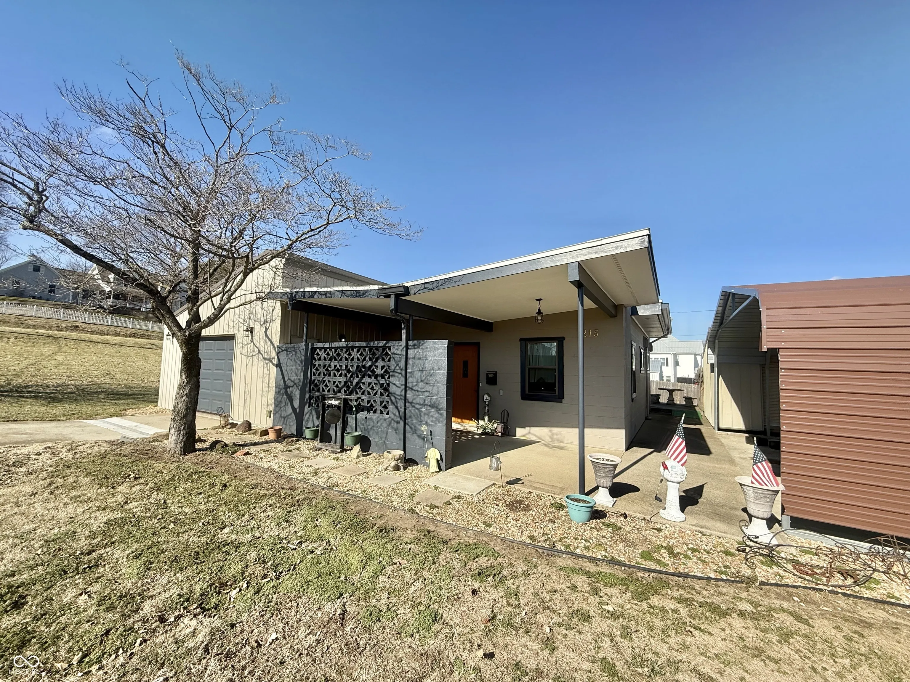 A Must see Mid-Century Modern Located within walking distance to restaurants, shopping. etc. Many updates to be found in this compact and efficient living Flex/bedroom, 2 bath, with attached Garage and Storage buildings. Situated On a spacious corner Lot with an additional 1/2 Lot behind the home, with alley access. Home has some updated Windows, flooring, Paint, bathrooms and fully Applianced Kitchen. Large Owner’s Suite offers vaulted ceiling, 2 closets, private bath, and access to rear covered porch/patio. Spacious garage with storage, work bench. Additional Buildings offers plenty of storage, shelving and a roll up garage door. A covered private front porch welcomes you to Home and attached Garage. So many possibilities with this property. Current Owners reconfigured layout and eliminated 2 bedrooms to make larger living room. Could be made back and add additional bedroom. Added Privacy fence 1/2 lot in rear with additional shed and a carport added. Listing agent is related to sellers and is Power of Attorney.