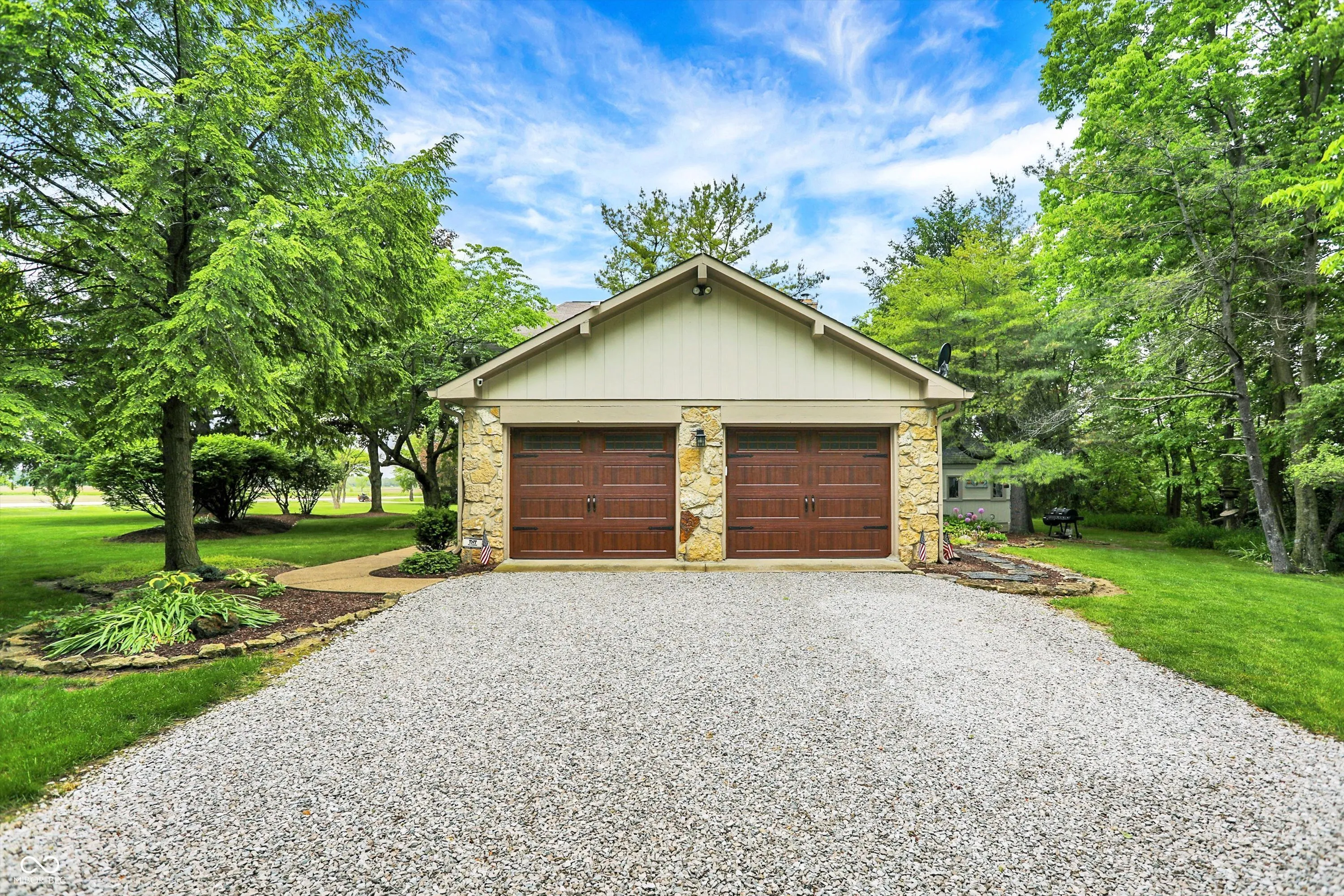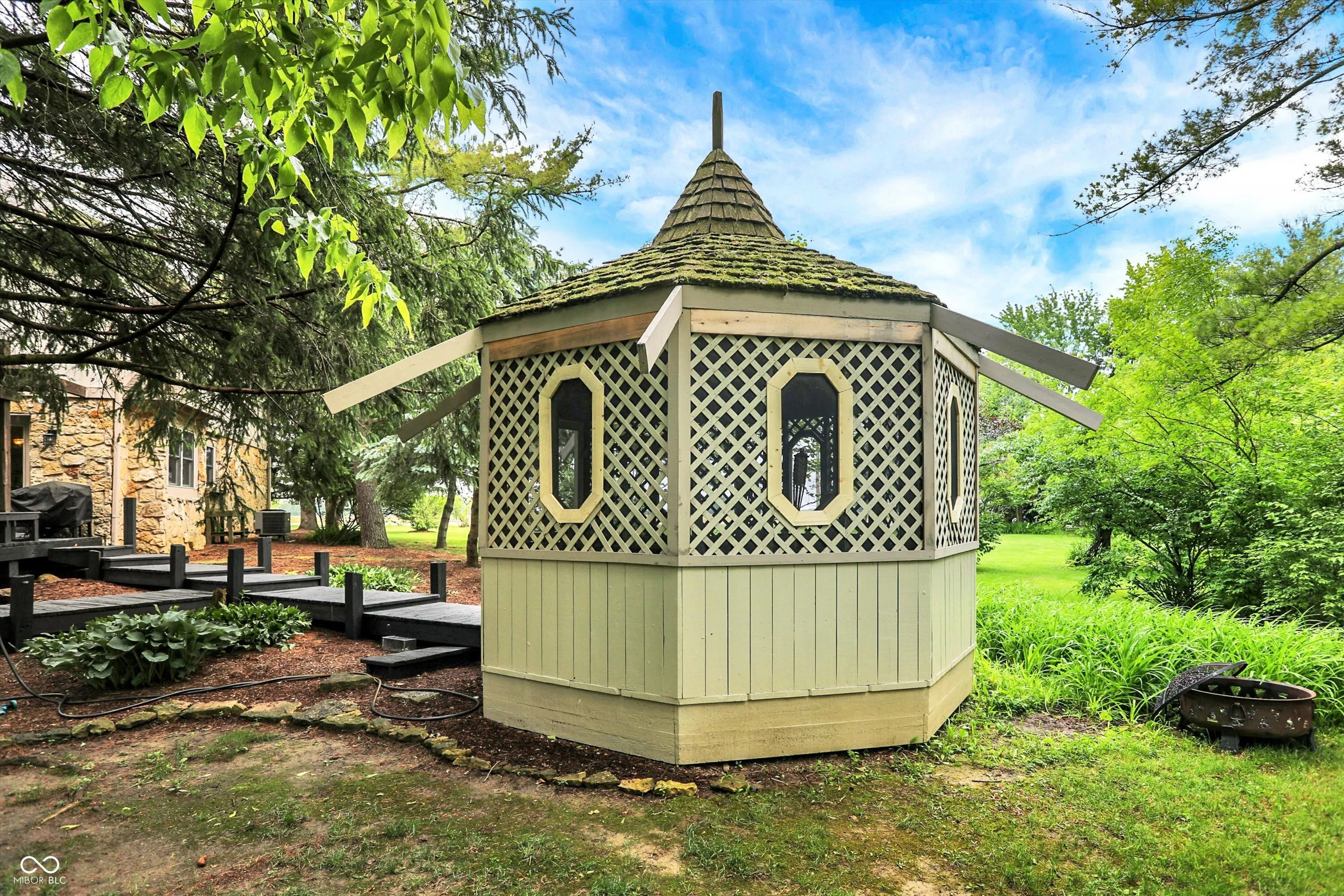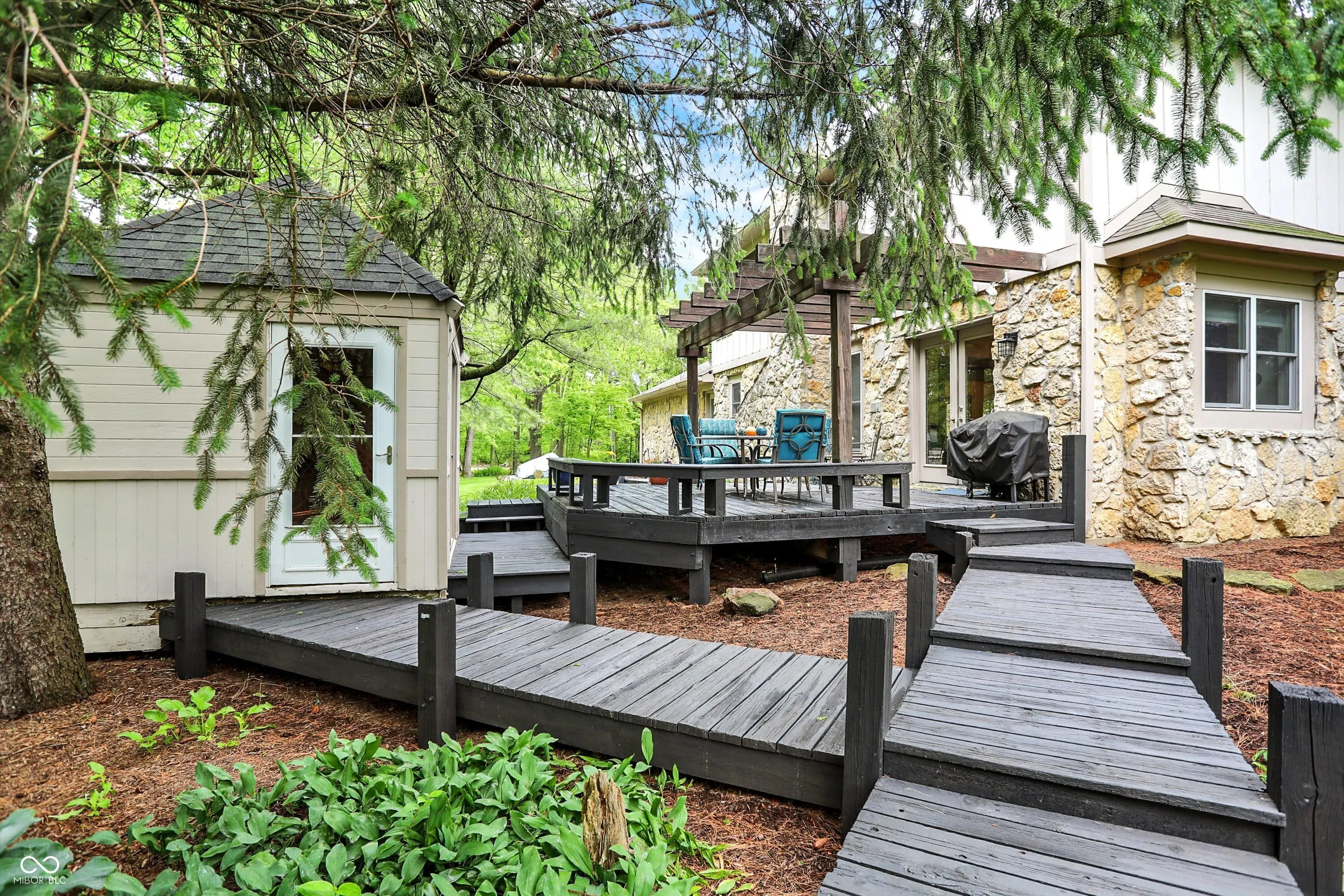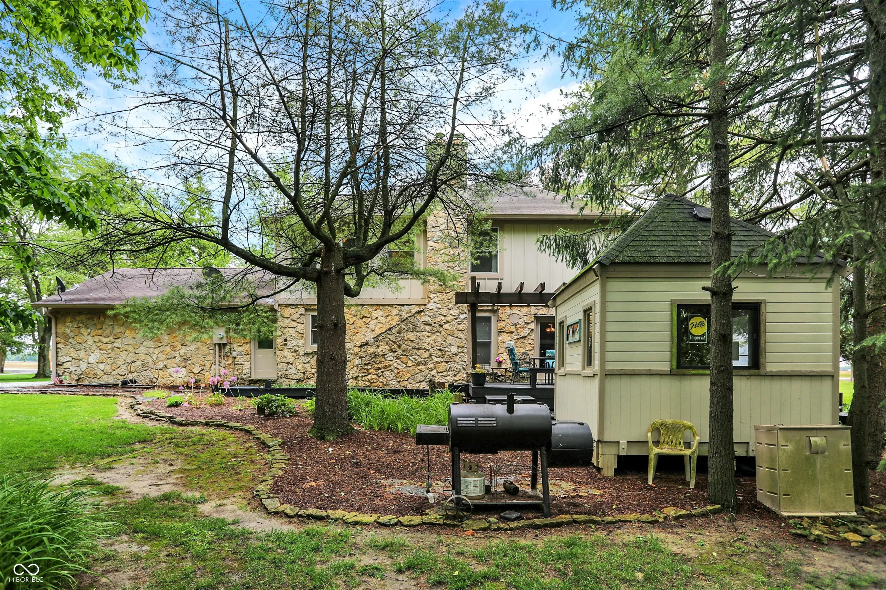 Nestled on 4.5 picturesque acres, this wonderful 3-bedroom, 2.5-bath home offers a tranquil retreat surrounded by mature trees and a winding creek. Hardwood floors flow throughout the main and upper levels, lending warmth and character to every room. The main level welcomes you with an inviting family room anchored by a unique stone fireplace with high-efficiency wood burning insert that heats the entire main level, a spacious kitchen with large center island, and a dining room wrapped in a wall of windows that bring the outdoors in. The open floor plan provides the ideal space for entertaining family and friends. Upstairs, the spacious master suite features an en-suite bath with double vanities, granite countertops, a tiled shower, and a large walk-in closet. Two additional generously sized bedrooms complete the upper level. Step outside onto the expansive deck, where you’ll be surrounded by the beauty of mature trees. A charming koi pond adds to the serenity, while a quaint gazebo invites you to sit back and relax. The 36′ x 26′ pole barn offers plenty of space for recreational vehicles and extra storage.(2) 14′ doors and 30 AMP RV plug in allow for your largest toys! Also on the property, a delightful cottage could serve as the perfect greenhouse or a whimsical children’s playhouse. Wander the trails that wind through open fields, beneath the canopy of old-growth trees, and along the gentle flow of the creek-an idyllic setting for those who appreciate nature, privacy, and the comforts of home.