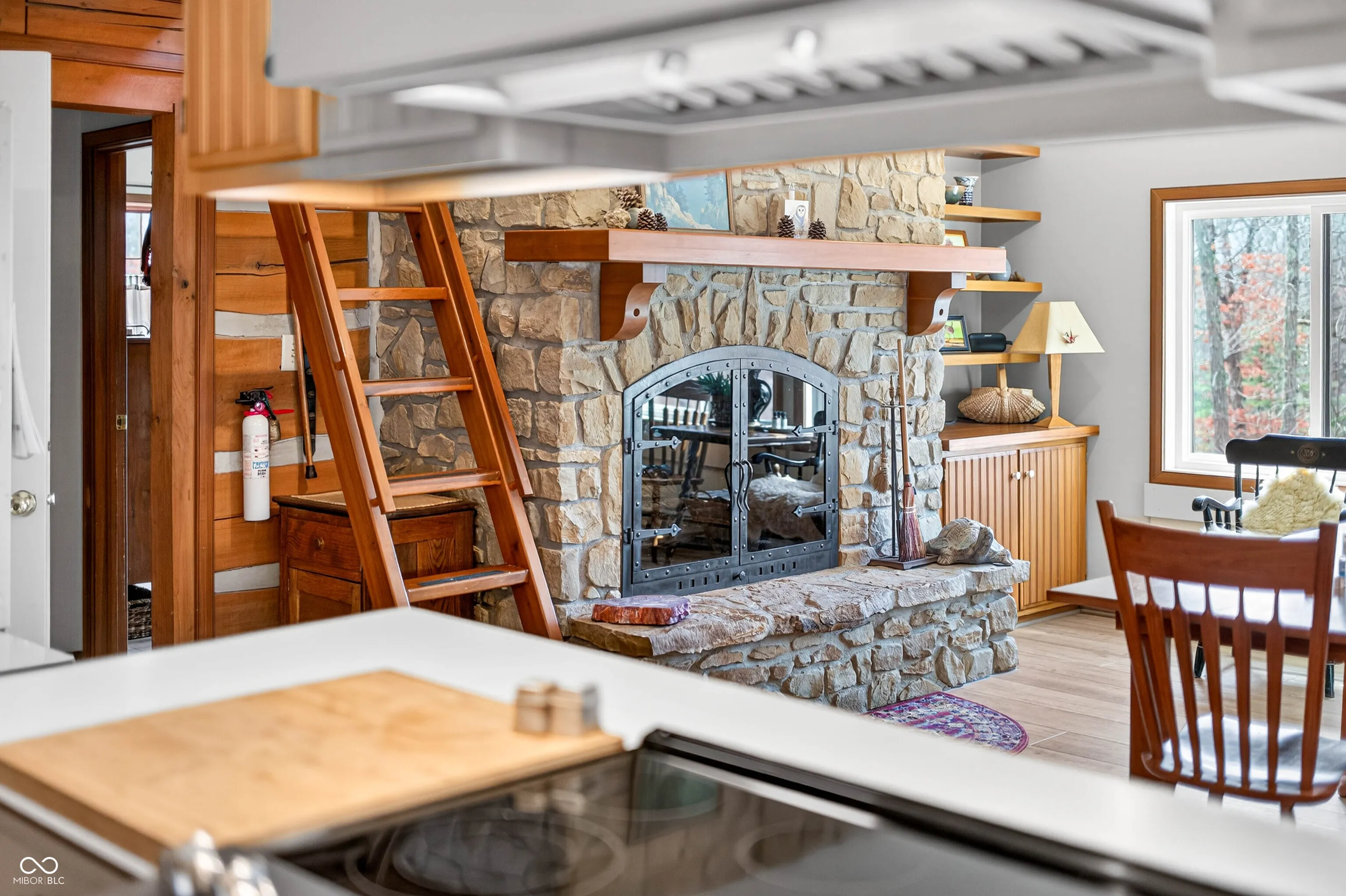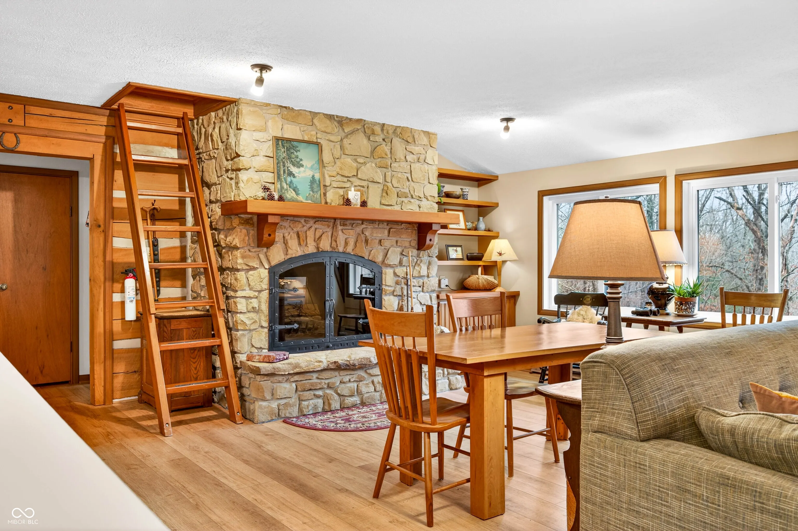 Less than a mile from downtown Nashville, this unique and meticulously maintained Brown County home has been lovingly owned by the same family since it was built. Originally designed as a 3-BR home across two levels, thoughtful modifications created two separate living spaces, offering exceptional flexibility. Currently configured with a kitchen on each level, the home is ideal for hosting guests or generating income through long-term rental or short-term homestay. It can also be easily converted back to its original 3-BR layout if desired. Inside, the home features a striking double-sided fireplace shared between the living room and the primary bedroom, creating a warm and inviting atmosphere throughout the main level. Attractive high-quality laminate plank flooring runs through the home. Efficient mini-split heat pumps provide comfortable heating and cooling on both levels. One of the home’s most distinctive architectural features is the charming cupola, adding character while providing stunning 360-degree views of the surrounding landscape. Outdoors, a covered deck on the main level and covered patio below overlook the shared stocked lake, creating peaceful spaces for relaxing with morning coffee, entertaining guests, or simply enjoying the natural beauty of Brown County. The property also offers exceptional workspace and storage options. A detached two-car garage includes extra storage, a dedicated office area, and a craft room ideal for hobbies, a workshop, or creative studio space. The barn/outbuilding with electricity features an enclosed sitting room that could easily serve as a workshop or studio. With its unique architectural charm, flexible living spaces, beautiful outdoor areas, and versatile outbuildings, this property offers a rare opportunity to enjoy the Brown County lifestyle just minutes from downtown Nashville’s shops, dining, and entertainment.