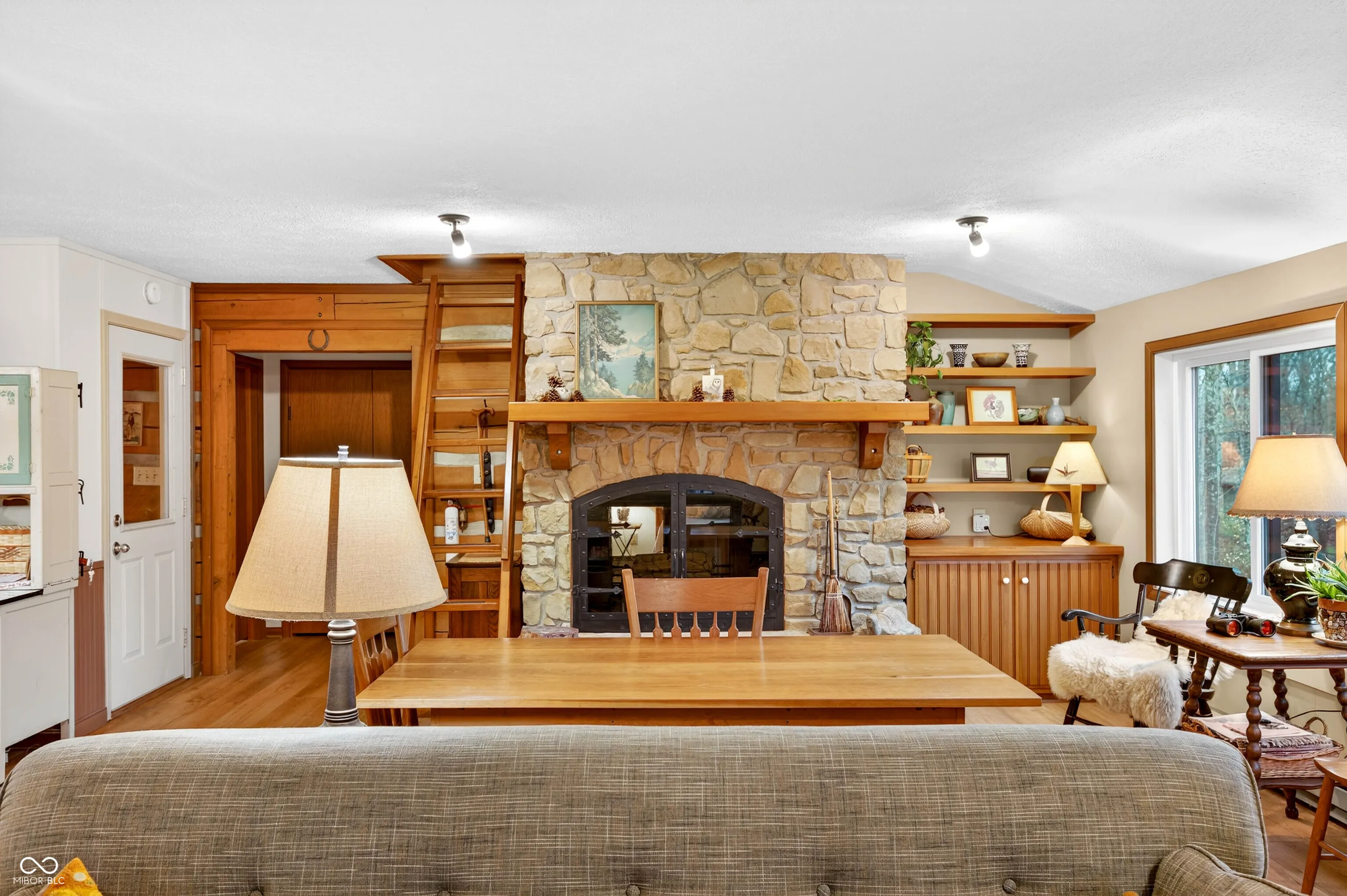 Less than a mile from downtown Nashville, this unique and meticulously maintained Brown County home has been lovingly owned by the same family since it was built. Originally designed as a 3-BR home across two levels, thoughtful modifications created two separate living spaces, offering exceptional flexibility. Currently configured with a kitchen on each level, the home is ideal for hosting guests or generating income through long-term rental or short-term homestay. It can also be easily converted back to its original 3-BR layout if desired. Inside, the home features a striking double-sided fireplace shared between the living room and the primary bedroom, creating a warm and inviting atmosphere throughout the main level. Attractive high-quality laminate plank flooring runs through the home. Efficient mini-split heat pumps provide comfortable heating and cooling on both levels. A beautiful wood stove in the lower level offers an additional cozy and efficient heating option. One of the home’s most distinctive architectural features is the charming cupola, adding character while providing stunning 360-degree views of the surrounding landscape. Outdoors, a covered deck on the main level and covered patio below overlook the shared stocked lake, creating peaceful spaces for relaxing with morning coffee, entertaining guests, or simply enjoying the natural beauty of Brown County. The property also offers exceptional workspace and storage options. A detached two-car garage includes extra storage, a dedicated office area, and a craft room ideal for hobbies, a workshop, or creative studio space. The barn/outbuilding with electricity features an enclosed sitting room that could easily serve as a workshop or studio. With its unique architectural charm, flexible living spaces, beautiful outdoor areas, and versatile outbuildings, this property offers a rare opportunity to enjoy the Brown County lifestyle just minutes from downtown Nashville’s shops, dining, and entertainment.