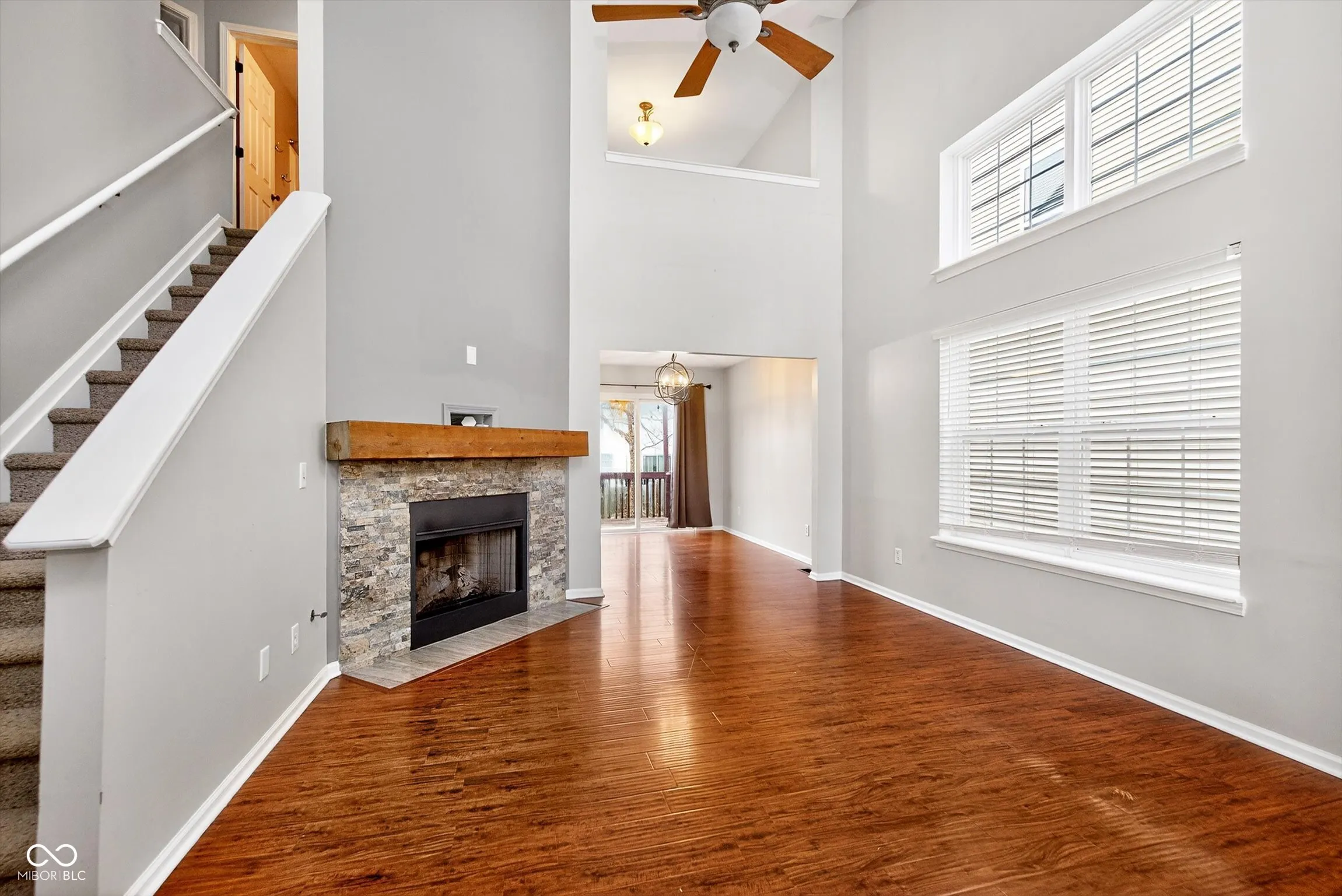 This 3-bedroom, 2.5-bath home offers a functional layout with a main-level primary suite and a 2-car attached garage. The two-story living room with fireplace creates an open and inviting space filled with natural light. Upstairs features two additional bedrooms, a full bathroom, and a spacious loft that can serve as a second living area or home office. The finished basement with electric fireplace provides additional room for relaxing or entertaining. Recent mechanical updates include a new furnace / AC in 2021 and a new water heater in 2025. Roof replaced in 2025. Washer and dryer are included! Conveniently located just minutes from Fort Harrison State Park, offering easy access to trails, outdoor recreation, and nearby amenities.