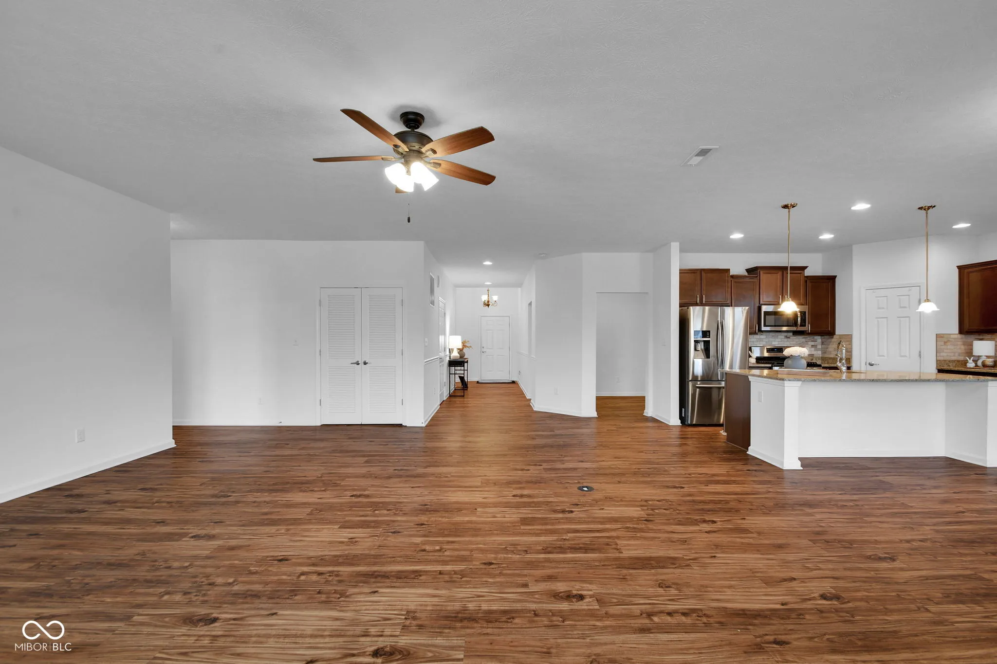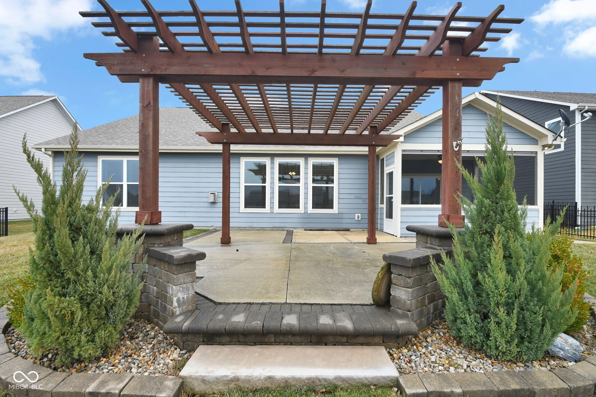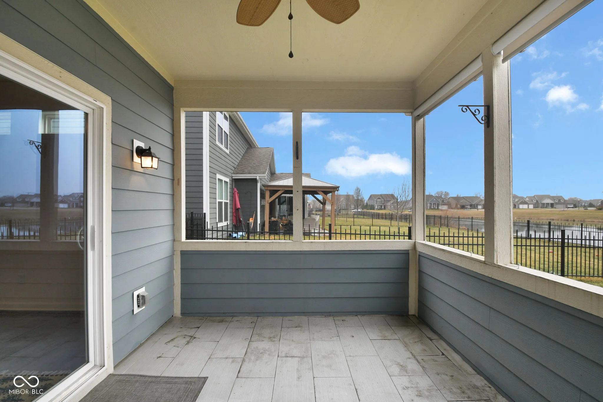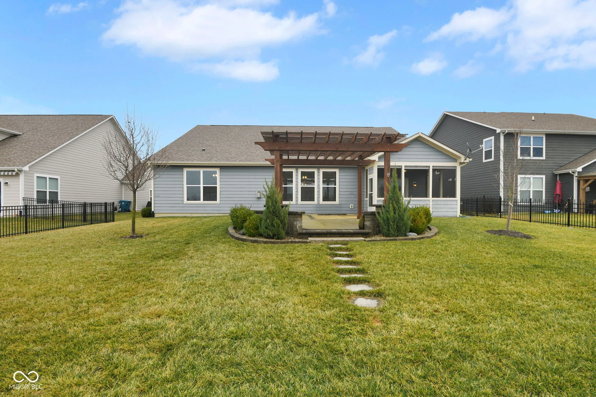 Rare 4-bedroom accessible ranch with serene pond views, screened porch, and a split guest wing-designed for bright, spacious one-level living and effortless entertaining. This beautifully maintained 8-year-old home offers 9-foot ceilings, a full-yard sprinkler system, incredible storage options, abundant natural light, and an open layout that feels both inviting and functional. Built with durable fiber cement siding and brick, it blends quality construction with timeless curb appeal. Thoughtfully designed for comfort and accessibility, the home features 36-inch doorways, consistent flooring throughout, and a roll-in shower, making it ideal for aging in place or multi-generational living. The primary suite includes double sinks and a spacious bath. A separate guest wing with three additional bedrooms provides excellent privacy for family or visitors. One bedroom features French doors, perfect for a home office or flex space. The bright kitchen features granite countertops, raised-panel cabinetry, gas range, walk-in pantry, and a breakfast bar island. The open great room includes a cozy gas fireplace, while a walk-in mudroom off the garage adds everyday convenience. Enjoy peaceful outdoor living from the screened porch or pergola-covered patio overlooking the pond. A walk-around sidewalk leads to the backyard, and the nicely sized yard offers space to relax and entertain. Additional highlights include a new water heater (2025) and a 1012 workshop area in the garage, perfect for hobbies, projects, or storage. Ideally located minutes from downtown Noblesville, Hamilton Town Center, Lowes, Meijer, misc dining and shopping, and major commuter routes, this home offers the perfect blend of peaceful surroundings and convenient access to everything you need. With its rare 4-bedroom ranch layout, private guest wing, pond views, and accessibility-friendly design, this home offers features increasingly difficult to find in newer construction