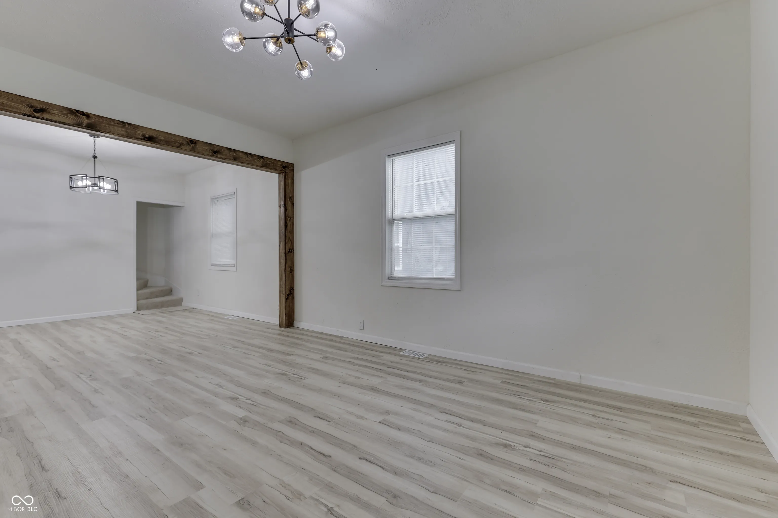 Welcome to this beautifully remodeled 3-bedroom, 2.5-bath home with a versatile bonus room-perfect as a fourth bedroom or home office-located just minutes from downtown Indianapolis! Step inside to be greeted by soaring 9-foot ceilings on the main floor and a spacious living room that flows seamlessly into the dining area, framed by a striking decorative wood-trimmed opening. Adjacent to the dining room, a charming pass-through breakfast bar with stylish light fixtures adds both character and convenience. The chef’s delight kitchen is a true centerpiece, featuring gorgeous countertops, a sleek tile backsplash, ample cabinet and counter space, and stainless steel appliances. An eat-in counter offers the perfect spot for casual meals or entertaining guests. The main floor also hosts a generous primary suite with a walk-in closet and a private bathroom showcasing a beautifully tiled walk-in shower. A half bath and laundry area complete the first level. Upstairs, step out onto a private deck-ideal for enjoying your morning coffee while watching the sunrise. Down the hallway are two additional bedrooms, the bonus room, and a spacious full bathroom with a tile-surround shower. One bedroom boasts a vaulted ceiling for added style and charm. Outside, enjoy a fully fenced backyard that’s perfect for entertaining, gardening, or giving pets plenty of space to roam. A rear gate and partial gravel area allow for convenient private parking. With updates including new waterproof flooring, light fixtures, appliances, electrical, plumbing, gutters, roof and more, this home ensures modern comfort and peace of mind. Located just minutes from Irvington, Fountain Square, Christian Park, and with easy access to I-65 and I-70. Don’t miss out-schedule your showing today and make this beautiful home yours!