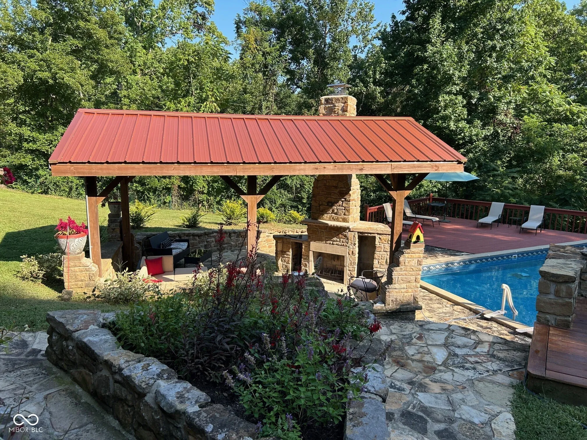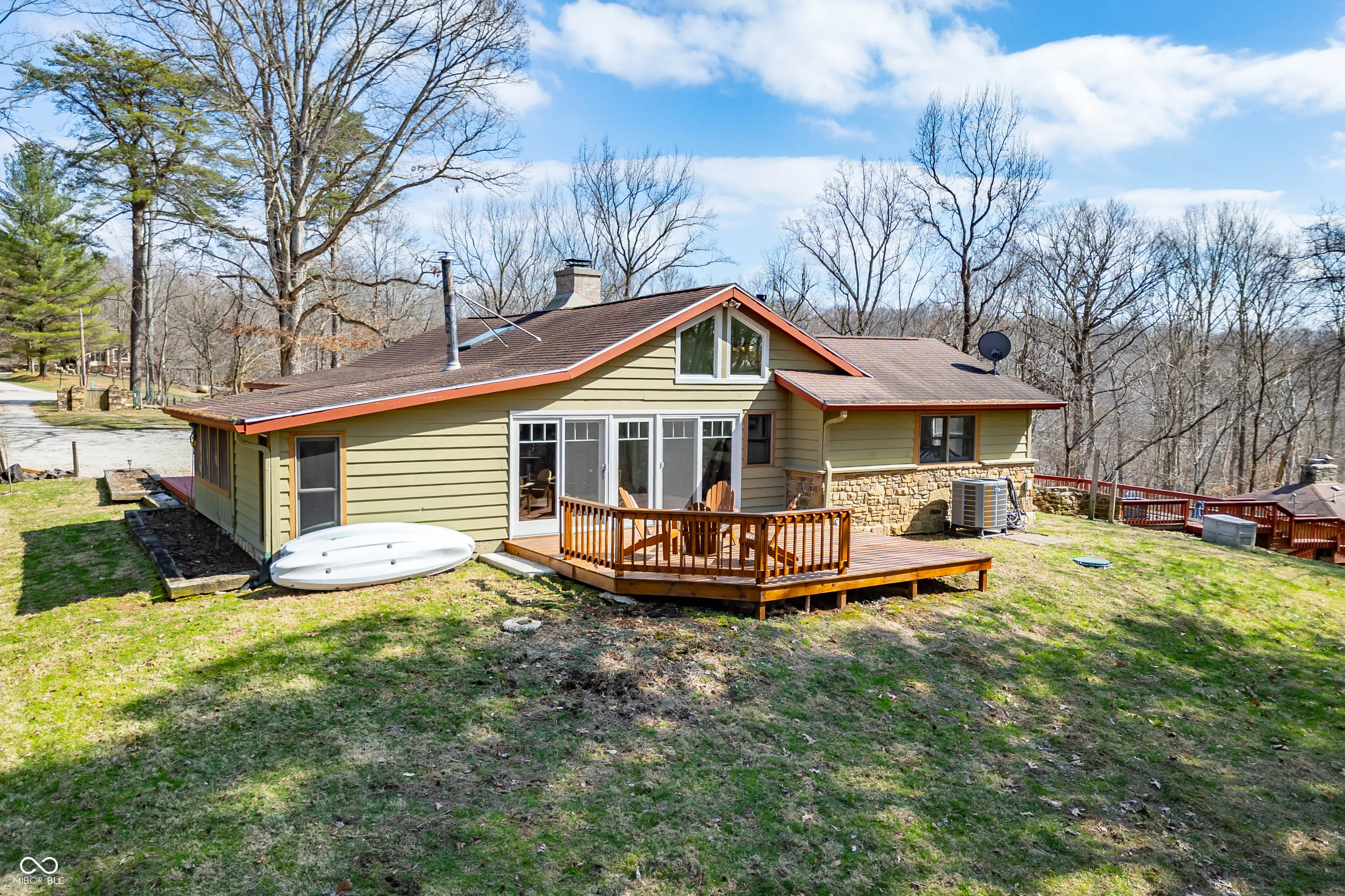 This beautifully remodeled rustic ranch home is located off the beaten path for ultimate privacy. The 1,935 sq ft home offers character, comfort, and outdoor living including an in-ground pool, beautiful timber-frame gazebo with Brown County stone outdoor fireplace and retaining walls, multi-level covered and open decks, and a cozy guest house that could be used for hobbies or additional living arrangements, with beautiful landscaping all around. The main house features a large great room with a beautiful Brown County stone fireplace that creates a warm and inviting focal point in the main living area, separate wood-burning stove, and contemporary skylights. Just off the great room, the dining and sunroom area offers a bright space for gathering and enjoying meals while taking in views of the surrounding property and leads to an expansive deck off the side of the home and a 3-seasons room and deck on the front side. Two bedrooms provide private comfortable spaces on opposite sides of the home, each designed for quiet personal sanctuary. The updated combined kitchen and breakfast area provides modern convenience while complementing the home’s timeless character as well as access to the pool and outdoor living spaces. Step outside and discover spaces designed for relaxation and entertaining. Sit just outside the kitchen on the deck with your morning coffee. Cool off during warm summer days in the outdoor pool, gather with friends and family on the pool deck or gazebo featuring a unique outdoor fireplace, and enjoy the peaceful rural setting that surrounds the property. Set on 5 acres, the property offers privacy, room to explore, and plenty of opportunities to enjoy the outdoors while still being within a short drive to Nashville and surrounding communities.