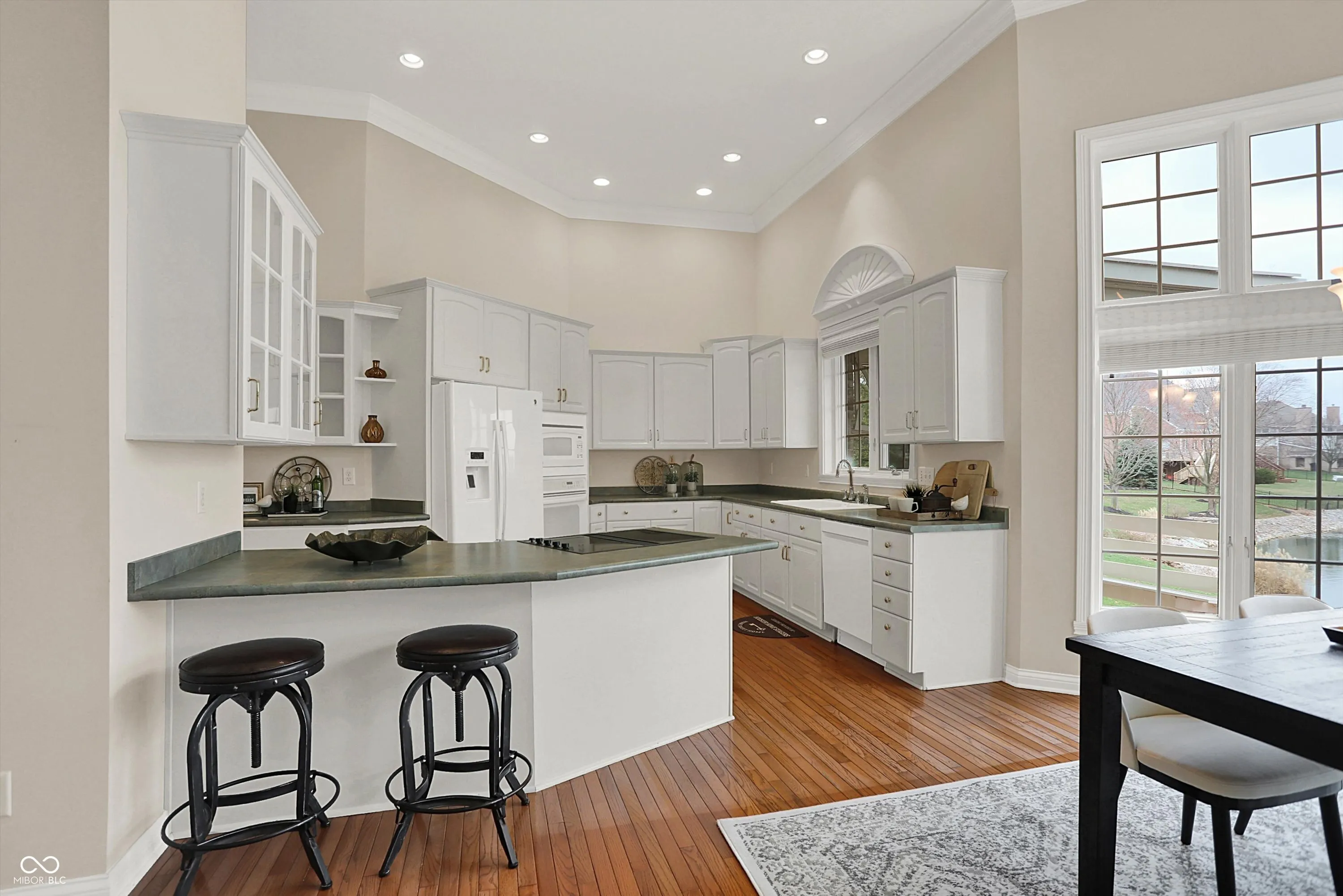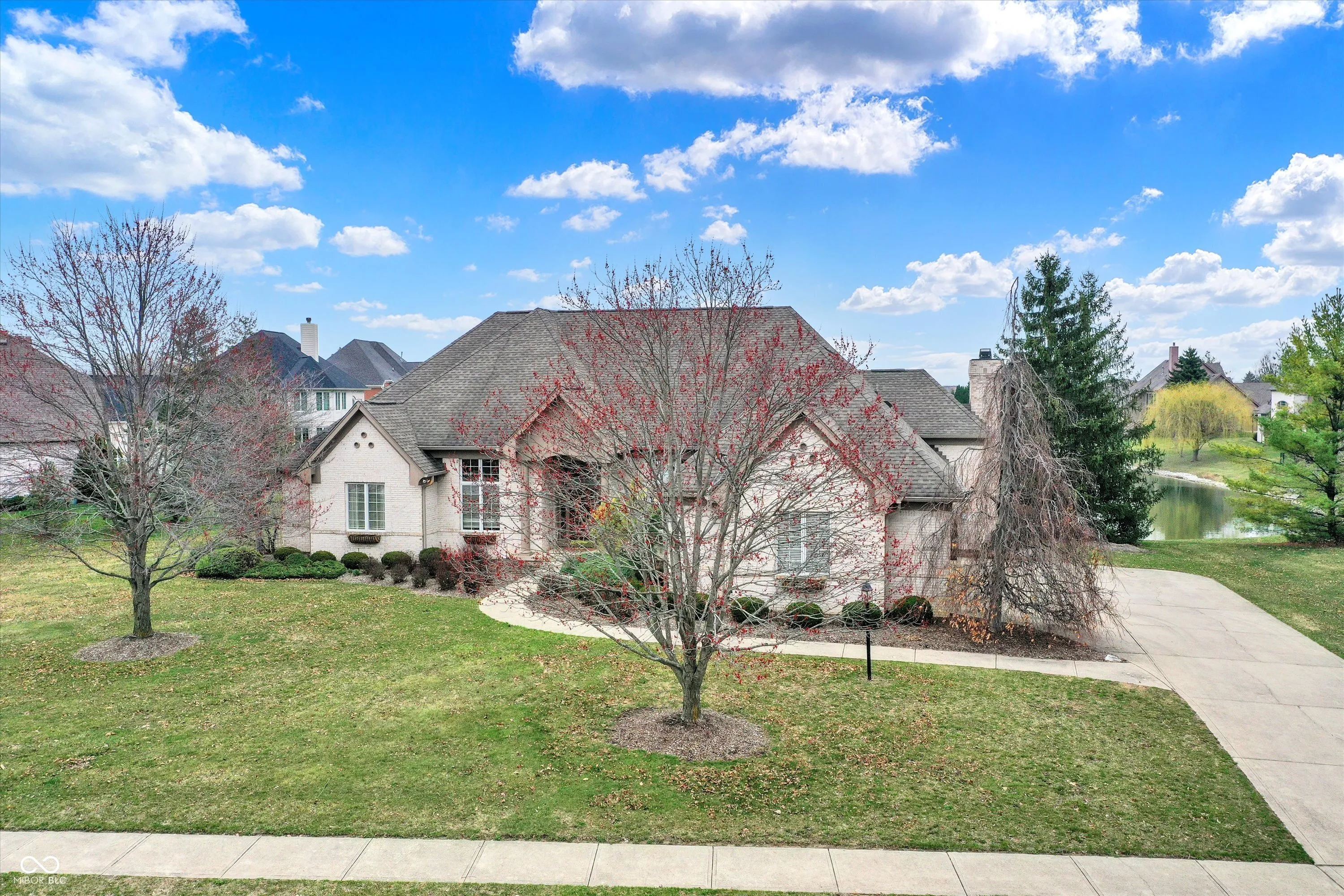 Sought-after Laurel Lakes in Carmel – on the water! This thoughtfully designed 4-bedroom, 3.5-bath brick ranch was custom-built in 1998 and sits on a half-acre pond view lot with 3,851 finished square feet of living space. A welcoming foyer with hardwood floors opens to a formal dining room and a spacious living room with 12 foot raised ceilings and a wall of windows overlooking the pond. The kitchen, breakfast room, and family room with gas fireplace, and primary suite all span the back of the home with pond views throughout – a great layout for everyday living and entertaining. The kitchen features abundant cabinetry including some glass-front uppers and a peninsula with cooktop and bar seating. A private home office with custom wainscoting and built-ins is a standout feature. The main-level owners suite includes a tray ceiling and an ensuite bath with soaking tub, dual vanities, walk-in shower, and a large walk-in closet with built-in shelving. The finished lower level adds a fourth bedroom with full bath and an open rec area – perfect for a home gym, media space, or guest retreat. Outside, a brick paver patio and screened porch overlook the pond, making for a wonderful outdoor living space. A three-car side-load garage completes the package. Residents enjoy a neighborhood pool and clubhouse, award-winning Carmel Clay Schools, and the convenience of being just minutes from the restaurants and shops of the Village of West Clay. Schedule your private showing today!