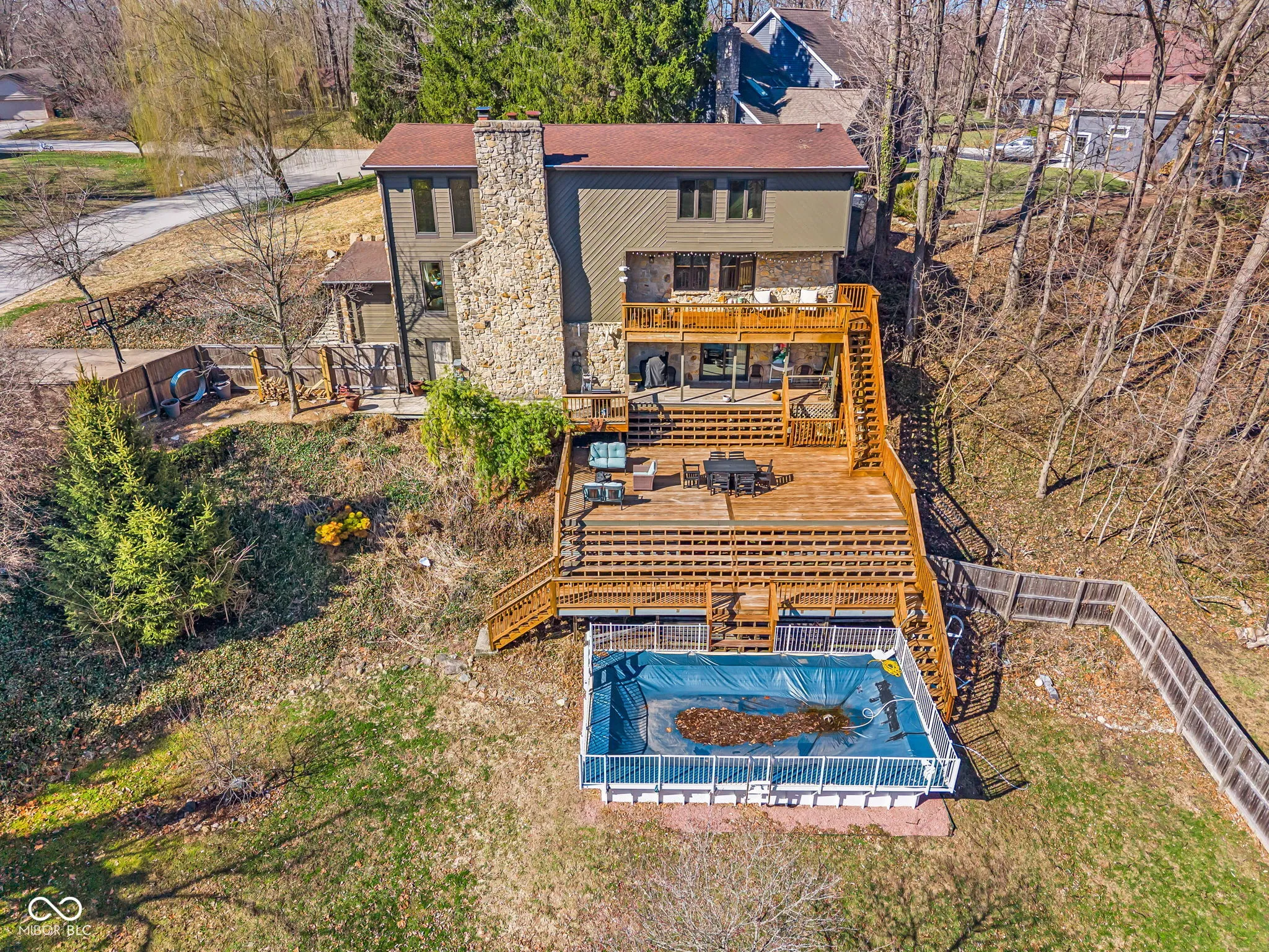 Welcome home to 6338 Wings Ct where your fabulous backyard awaits you! Its almost impossible to find a 1.34 Ac property in Brownsburg like this one. Imagine relaxing on your three-tier deck overlooking a sparkling pool, a tree-lined creek, and peaceful natural views-all while being just minutes from everything Brownsburg has to offer. This beautifully maintained 4-bedroom, 3-bath home blends character, thoughtful updates, and flexible living space. Inside, the family room is anchored by a stunning floor-to-ceiling stone fireplace, creating a dramatic focal point and cozy gathering space. Original hardwood floors add warmth and timeless charm throughout the home. The remodeled kitchen offers modern finishes and functionality, while the updated primary bathroom provides a comfortable, spa-like retreat. The walkout basement expands the possibilities with a private in-law suite and its own kitchen, making it ideal for multi-generational living, extended guests, or added privacy. Hobbyists, and/or fitness enthusiasts will appreciate the oversized, heated two-car garage with an extra room perfect for a workshop, gym, or additional storage. Located in the highly sought-after Brownsburg School District, this home also offers direct access to scenic walking trail access to Williams Park and its Splash Pad. No HOA. Yes…you can bring your chickens! Homes with this kind of setting, flexibility, and location rarely come available-don’t miss your opportunity to make it yours.
