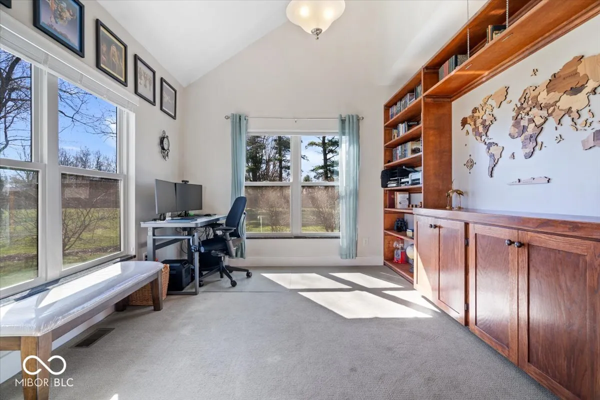 Some homes are built. Others are imagined first – carefully and thoughtfully – then brought to life piece by piece. This is one of those homes. Designed by the seller themselves, every architectural detail was intentionally chosen to create a place that feels warm and welcoming from the moment you arrive. The covered front porch, framed by beautiful stone and wood plank siding, invites you in. Inside, rich wood floors, abundant natural light, and soaring cathedral ceilings create a living space that feels both grand and comfortable. This is the kind of home where memories unfold naturally – cozy winters beside the wood-burning stove and summer evenings outside under the enormous covered patio on nearly two acres. The primary suite on the main level offers a peaceful retreat with a gorgeous walk-in shower, soaking tub, and exceptional walk-in closet. The office features custom built-ins and French doors, creating a beautiful and functional workspace. Upstairs you’ll find two generously sized bedrooms with impressive closet space, along with a theater room ready for movie nights and entertaining. At the heart of the home, the kitchen was designed for gathering, with granite countertops, abundant cabinetry, generous prep space, and a large center island. Outside, enjoy your mornings beside the swim spa, afternoons tending to the greenhouse and flower beds, or time spent working in the shop. With five garage spaces, there’s room for every vehicle, hobby, and adventure. And for added peace of mind, the home includes a top-of-the-line storm shelter in the garage.