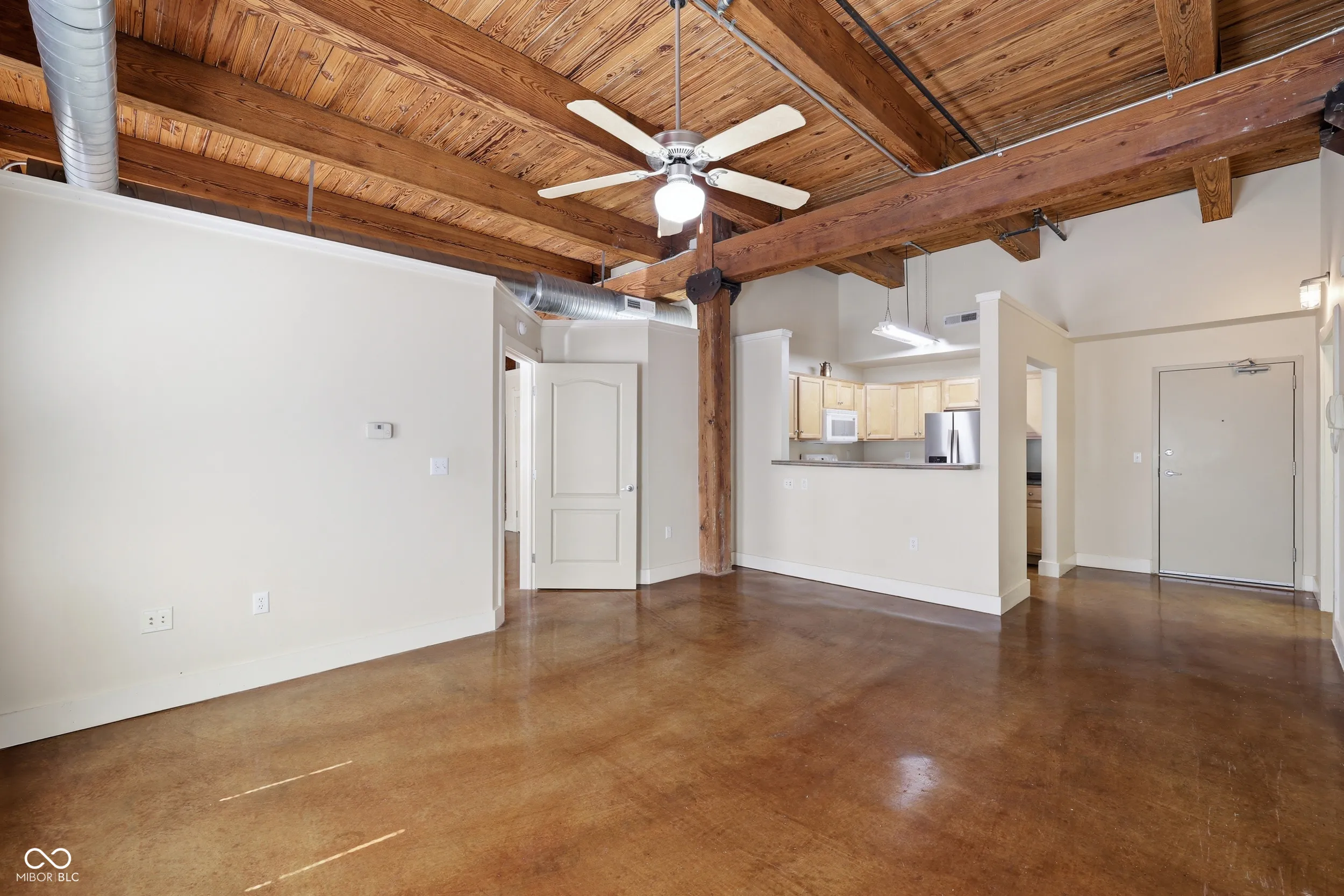 Welcome to H. Lauter Lofts, one of Indianapolis’ most distinctive historic conversions, where 100-year-old industrial character sets the stage for everyday downtown-adjacent living. Unit 208 is a loft-style 1-bedroom, 1-bath condo with real character, featuring 12-foot wood beam ceilings, exposed brick walls, exposed ductwork, and warm stained concrete floors that give the space a richness that newer construction simply can’t replicate. The open living area gets good natural light through large windows and opens directly to a private balcony. The bedroom is generously sized with the same soaring beams overhead, a closet, and direct access to the full bath. One of the standout features of this unit is the reserved underground parking space, something not every unit in the building includes. Combined with elevator access, a fob-secured lobby, and an intercom system for guests, the day-to-day logistics of city living are well covered here. Positioned just west of downtown, you’re close to IU Indianapolis, Riley and Eskenazi hospitals, and the growing medical and research corridor along the White River. Lucas Oil Stadium, Victory Field, Gainbridge Fieldhouse, the Indianapolis Zoo, and White River State Park are all just minutes away. Whether you’re a first-time buyer, a student, a medical professional, or simply looking for a low-maintenance place with genuine character, Unit 208 offers solid value in a building unlike anything else at this price point.