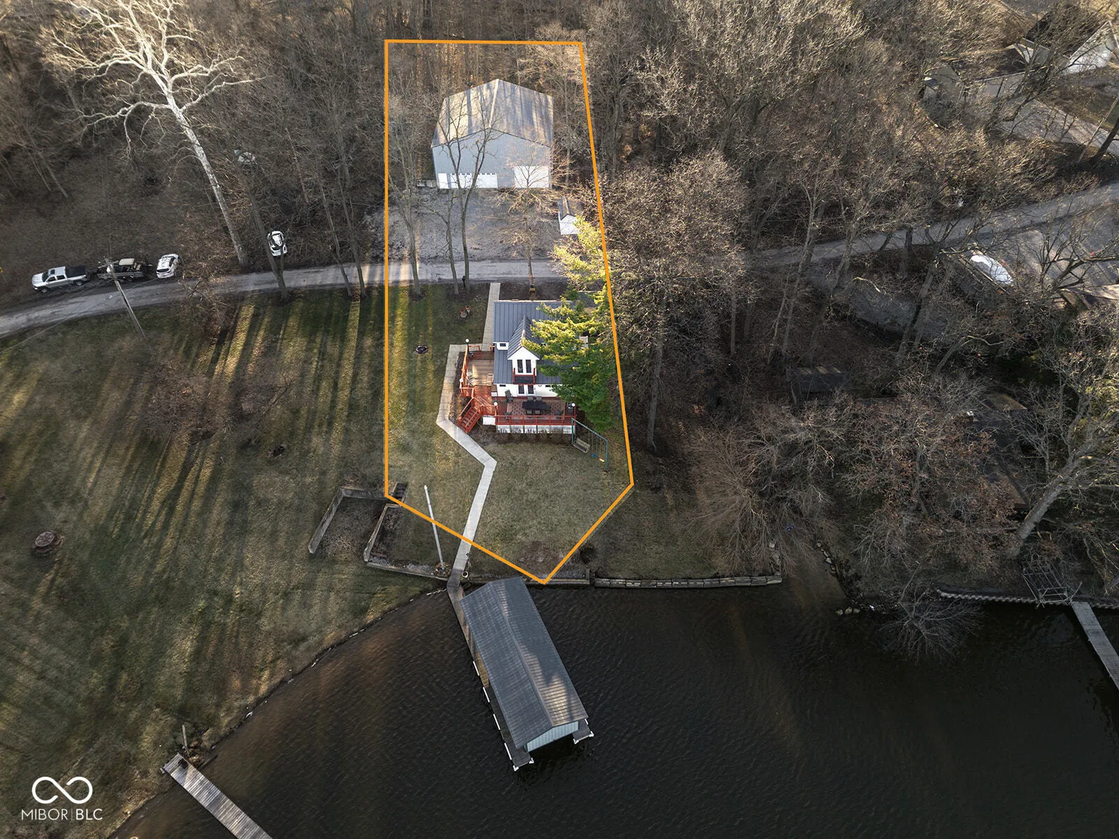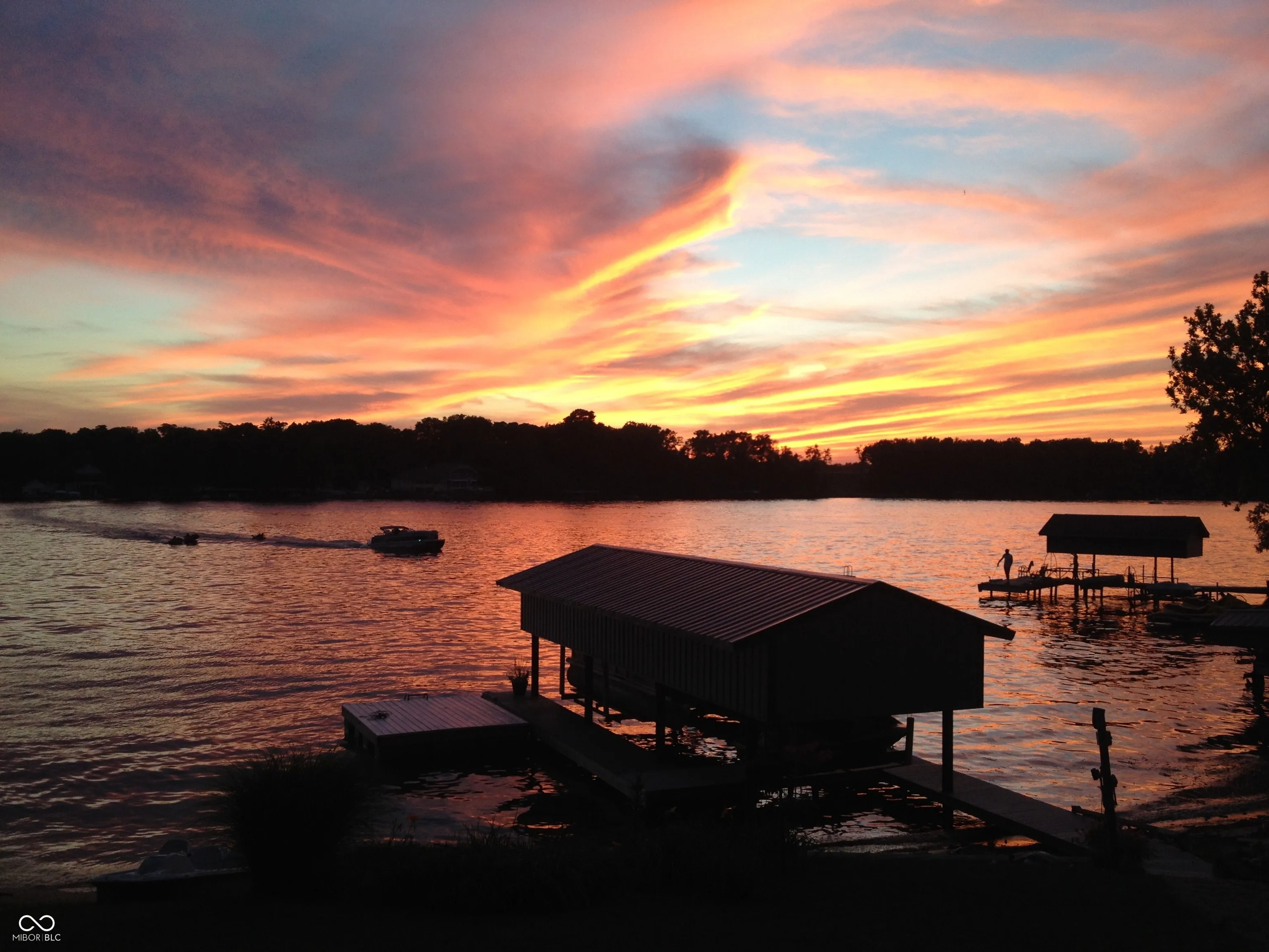 Lake level home with walk-in sandy swim area, and boathouse with pontoon and wave runner lifts. The Home features a dining room, kitchen, and living room overlooking the lake. A spiral staircase leads to the upper level with master bedroom and laundry. Two main-floor bedrooms include one with built-in bunkbeds and a second bedroom opens to a deck with a private hot tub, where you can listen to the spring-fed creek year round. A huge detached garage offers excellent storage for vehicles and watercraft. The concrete floor is 6 inches deep with 4 x 4 concrete pads for posts, with wall studs and trusses on 16 inch centers-all perfect for a second floor creating additional living space. This home and location are one of the most sought after on Lake Freeman. The sunsets are magnificent and the view of the 4th of July fireworks cannot be beat. Contents of the home and watercraft are negotiable.