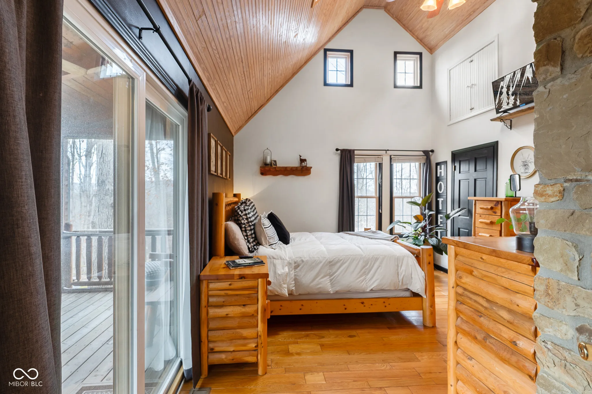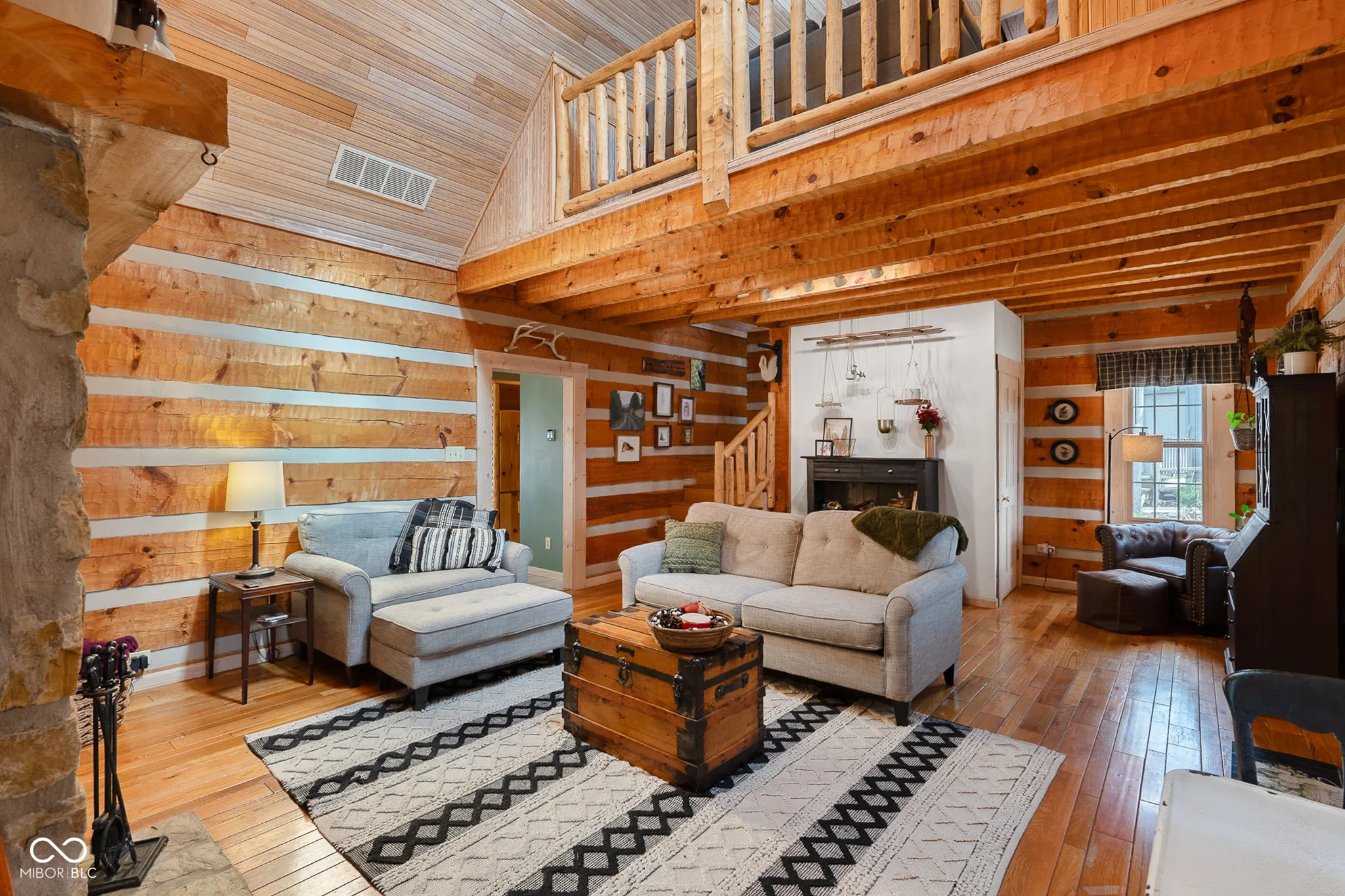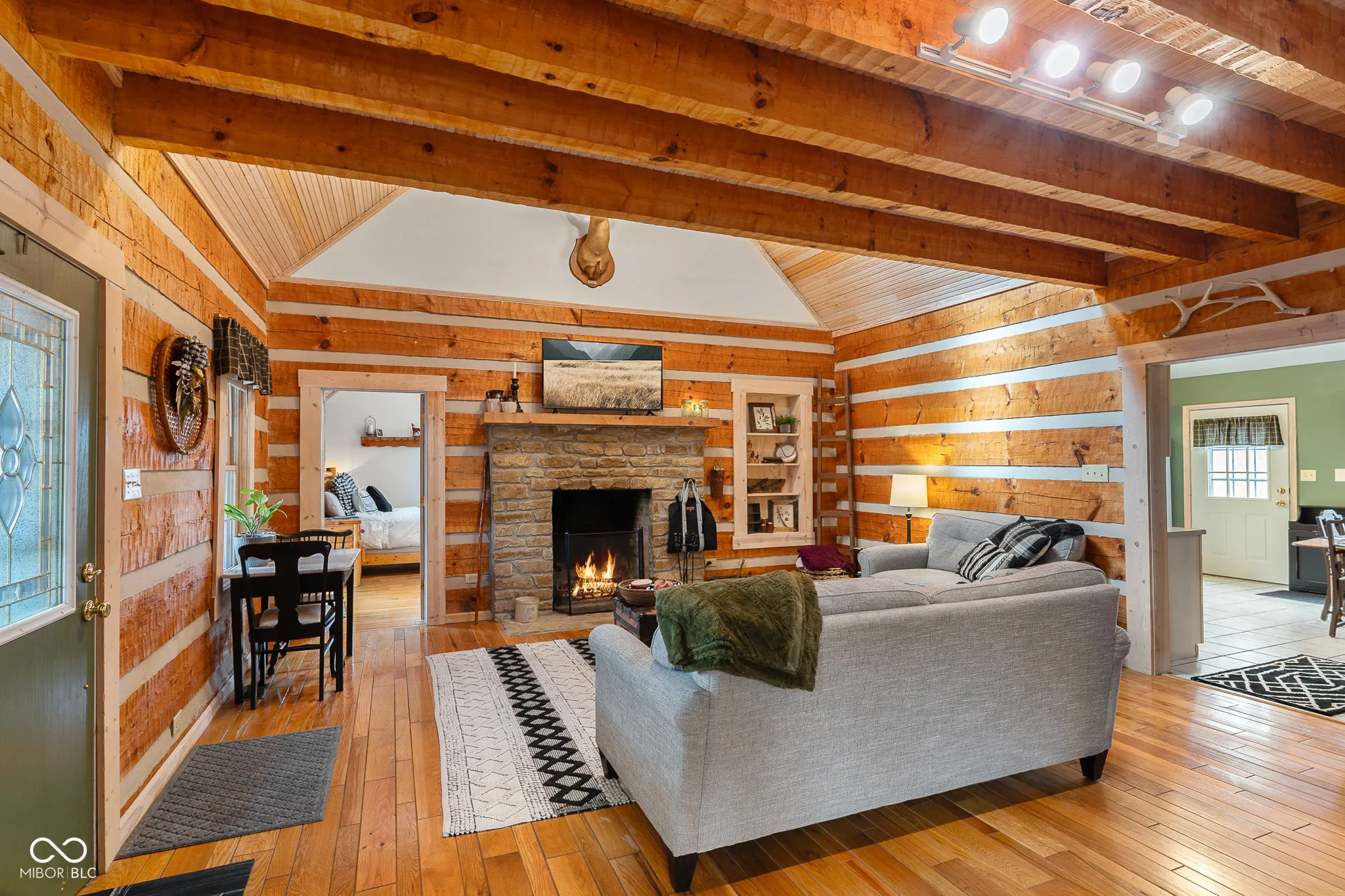 Nestled among five wooded acres and perfectly situated between Bloomington/Indiana University and Nashville/Brown County State Park, this 2BD/2BA hand-hewn log cabin offers rustic charm with all the comforts of home. A tree-lined walking path leads to a covered front porch – where the pace of life slows and the sounds of nature take over. The living room sets the tone with 12″ hand-hewn logs and a Rumford stone wood-burning fireplace, creating a warm and welcoming space year-round. The country kitchen features double-stacked cabinetry with plenty of storage for everyday living. The main-level primary suite includes an ensuite bath, walk-in closet, and patio doors opening to a screened porch. Down the hall, a convenient laundry area leads to the second bedroom and full bath – great for guests or family. Outside, a deck and firepit offer great spots to unwind, and a footbridge crosses to a detached crafter’s cabin ideal for a studio or workshop. The oversized 2-car garage provides ample storage, plus a covered area sized for an RV or boat. Peaceful and private, yet just minutes from the restaurants and galleries of Nashville and the energy of Bloomington – this cabin is a rare find. UPDATES: 2023: New paint throughout; 2024: New HVAC System; 2025: New Dishwasher and Garbage Disposal