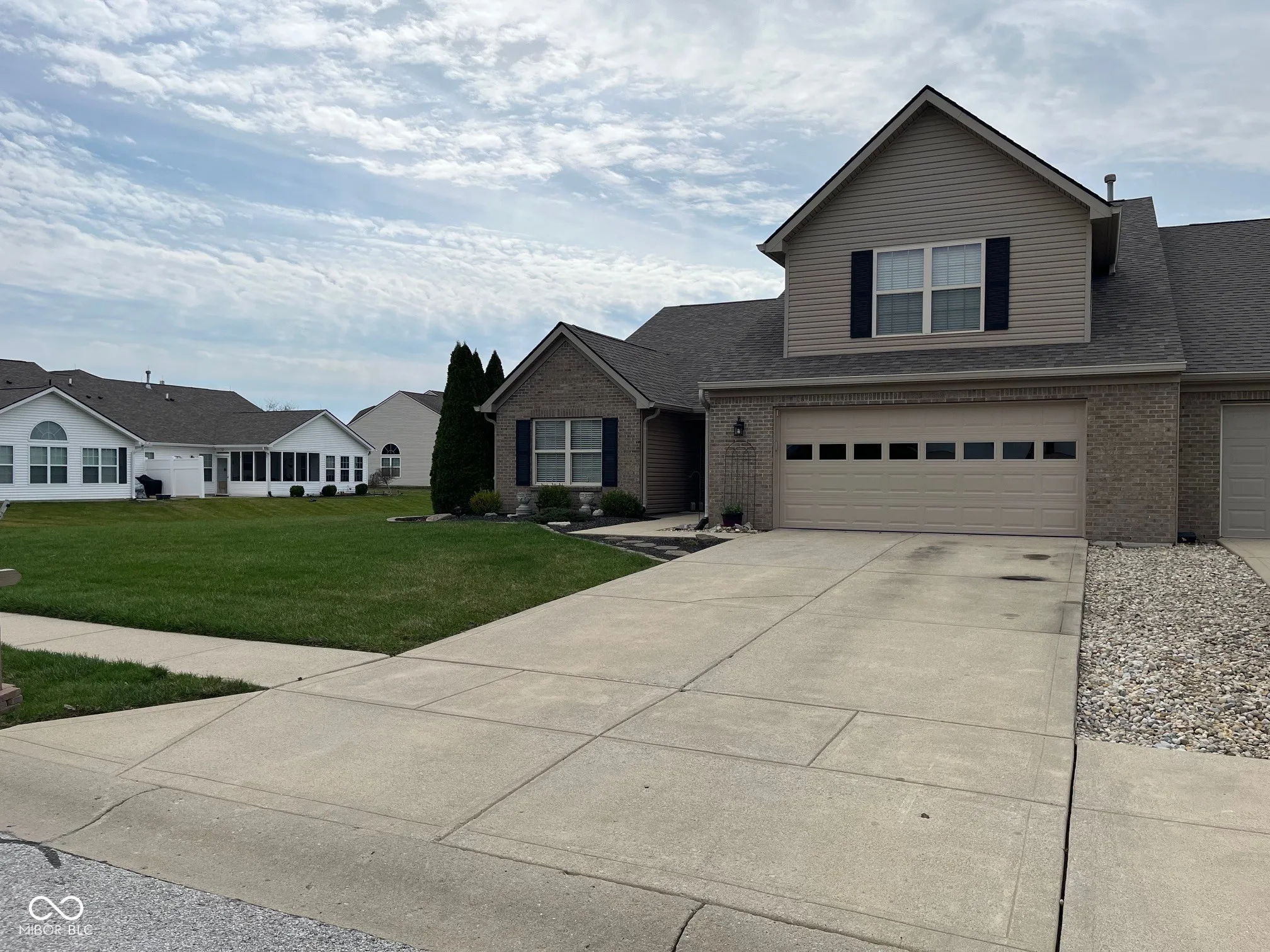 Enjoy the low-maintenance of a 2 bedroom, 2 bath, paired patio home in Greenwood’s Crooked Bend neighborhood. One of the larger homes in the community with a open great room, private office, sunroom and a large upper level bonus room. The vaulted ceiling in the great room and adds to the openness of this home. A large yard you don’t have to mow, and a cozy concrete semi-private patio off the sunroom. New roof in 2025, new laminate flooring installed in 2022, and a new water heater in 2021. Finished 2 car garage with attic access. Great location with convenient access to nearby dining, shopping, schools and more.