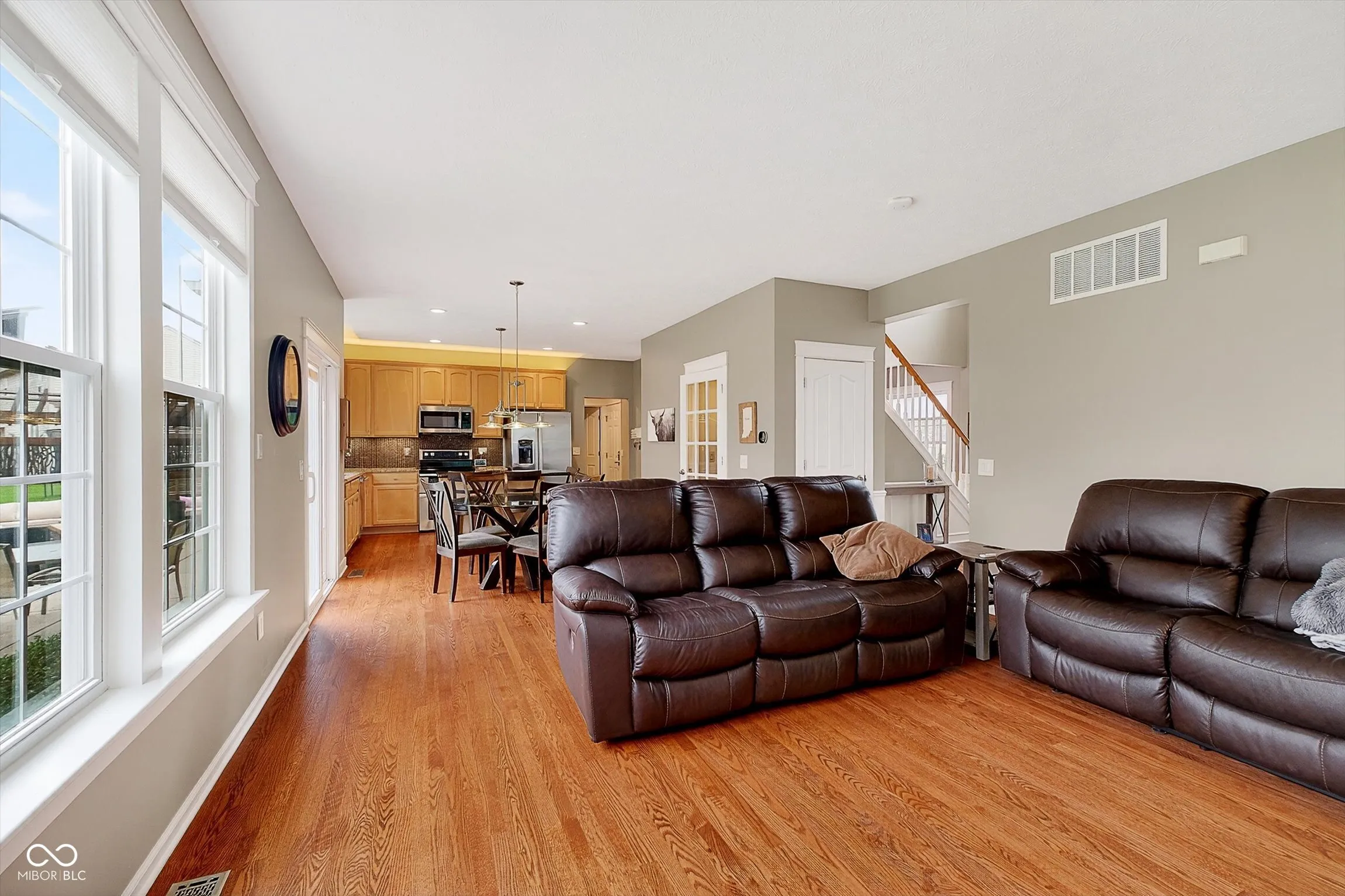 Extensively updated & well maintained, this home offers thoughtful improvements throughout. The backyard is designed for outdoor living with a wooded tree-lined setting for privacy and added landscaping. Enjoy the extended aggregate patio with decorative privacy screening, a covered patio area with ceiling fan, and a stone gas fire pit, with a concrete sidewalk connecting the driveway to the backyard for convenience. The exterior features a full brick front, maintenance-free siding, mature landscaping with fresh mulch, added landscape lighting, and an irrigation system with Rachio smart controller, while the oversized two-car garage includes a 6-foot extension for additional storage or longer vehicles. A newer front door with decorative glass and covered front porch creates a welcoming entry, while inside, the two-story entry showcases refinished hardwood floors (2026) and detailed trim work. A main-level office with glass French doors, hardwood flooring, and canned lighting provides a private workspace, and the formal dining room continues the hardwood flooring. The updated powder bath features a glass tile accent wall and new vanity. The great room offers hardwood flooring and a remodeled gas fireplace with stone surround and custom paneling. The kitchen includes granite countertops, center island, stained maple cabinetry, tile backsplash, pantry, under and above cabinet lighting, and stainless-steel appliances including a double oven and KitchenAid dishwasher. The eat-in area opens to the backyard through a newer slider. Mudroom with storage and main floor laundry add convenience. The finished lower level includes a family room, dry bar with fridge, and storage. Upstairs features hardwood hallway flooring, updated hall bath (2026), and a spacious primary suite with vaulted ceilings and an updated bath. Additional updates include roof (2020), light fixtures (2024-2025), water heater (2024). This house is a perfect 10!