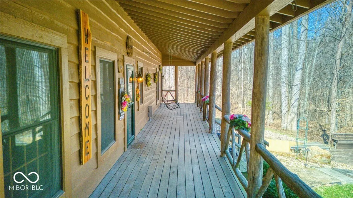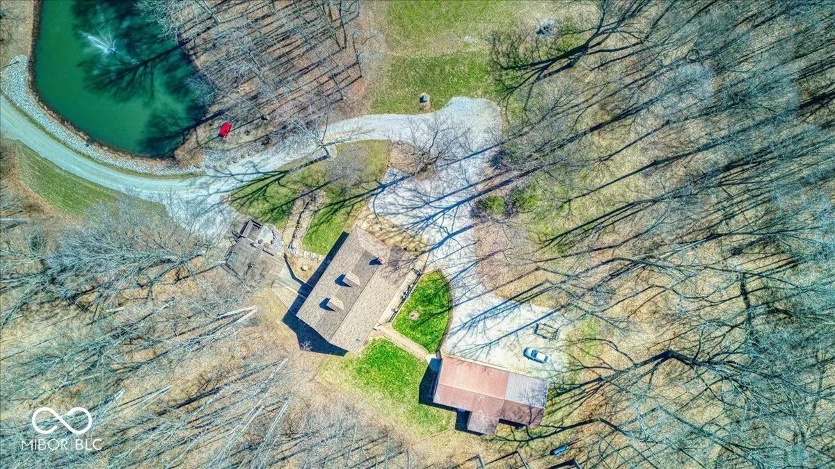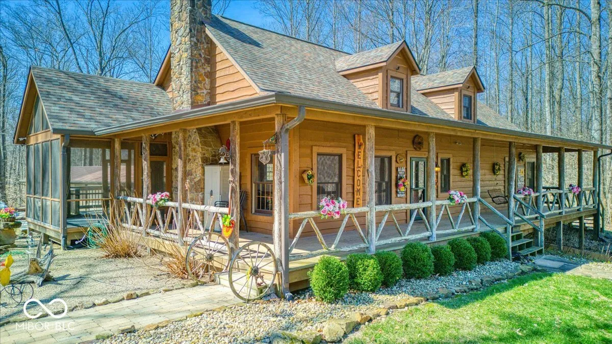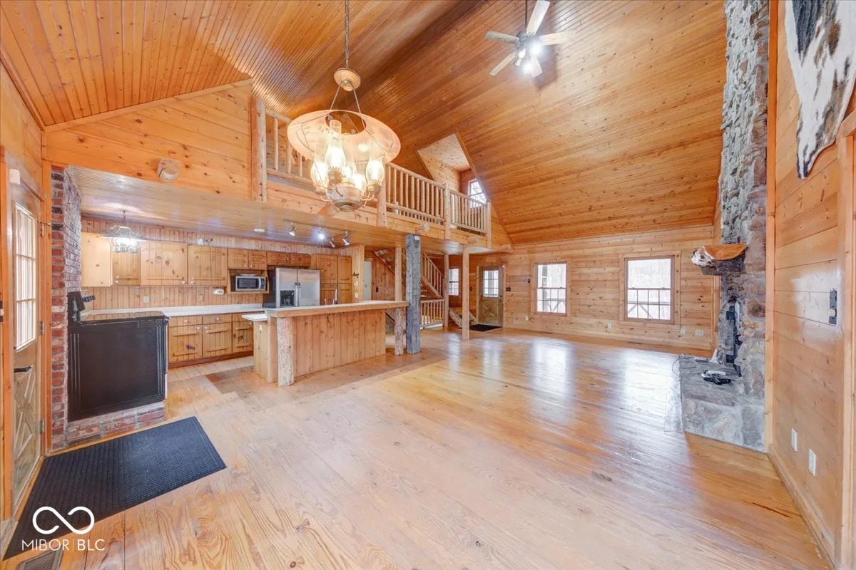 Envision a lifestyle of an outdoorsman hunting paradise surrounded by a wooded 22.6 acres and a beautiful 3540 SF custom built rustic home overlooking a private pond with 5-car detached garage. This beautiful home provides a grand setting with its soaring high ceiling and impressive vaulted ceiling, creating an airy atmosphere. A striking wood ceiling, adorned with robust beamed ceiling elements, complements the distinctive wood wall, while a comforting fireplace offers a focal point for relaxation. The heart of the residence is found within its kitchen, a space designed for both culinary artistry and gathering, featuring a distinctive wood ceiling and an inviting wood wall. This area is further enhanced by a practical kitchen bar and a generously proportioned large kitchen island, all framed by elegant cabinets and a unique log wall, providing a warm and functional environment. A dedicated bar area in the basement provides an ideal setting for recreation and social gatherings, featuring a charming wood wall that enhances its inviting ambiance. Outdoor enjoyment is a hallmark of the property’s design, with a welcoming porch inviting quiet contemplation, a bright sunroom offering a tranquil retreat regardless of the weather, and an expansive deck providing ample space for outdoor leisure. A beach area has been added to the pond to enjoy sunning on a beautiful day. The pond has a beautiful controlled fountain that is stunning! There is a wildlife observation platform located on the property. A wildlife feeding observation area is located near the home which is beautiful to see and to feed the wildlife. This property has been surveyed and split into 4 parcels with 3 plots on the road front. This home has a generator system. This is a great development opportunity. This is truly paradise and a rare find! City water is available but no hooked up.