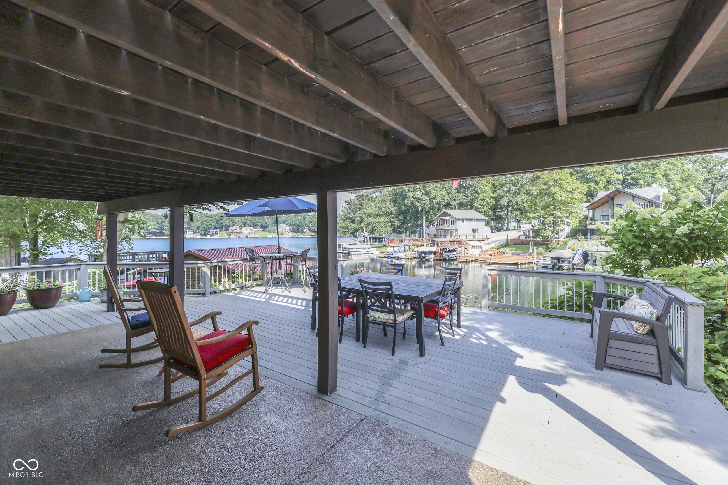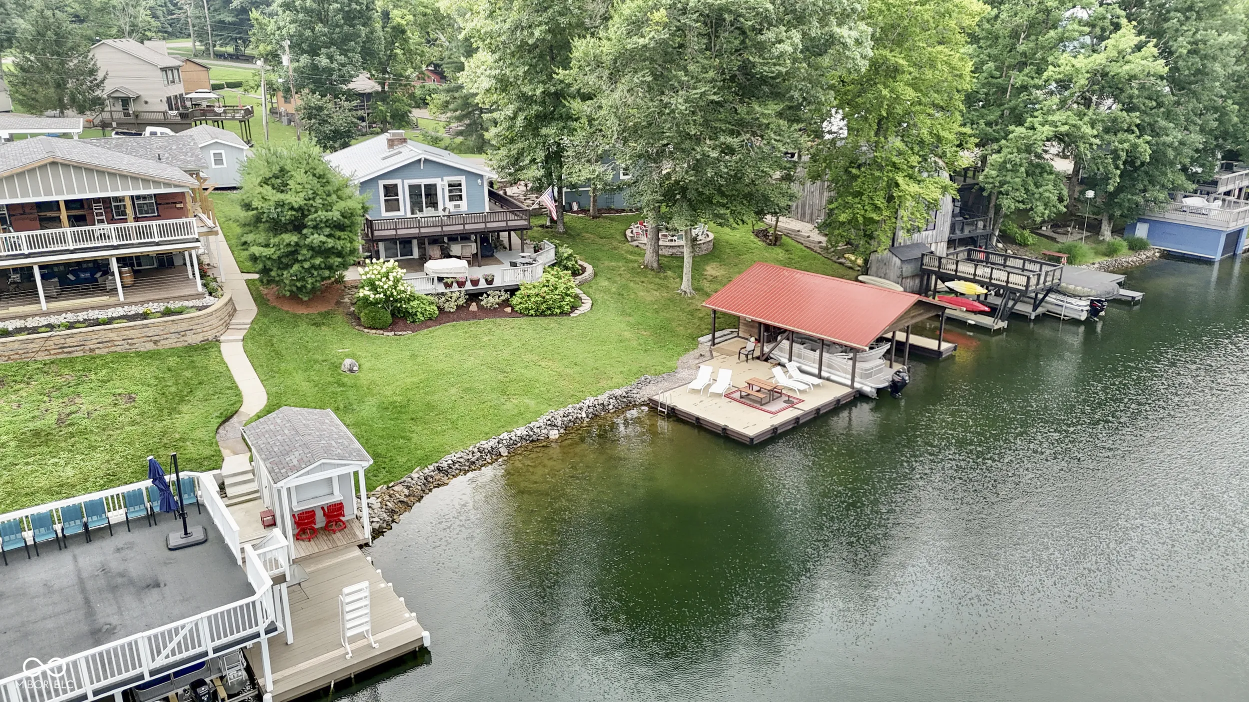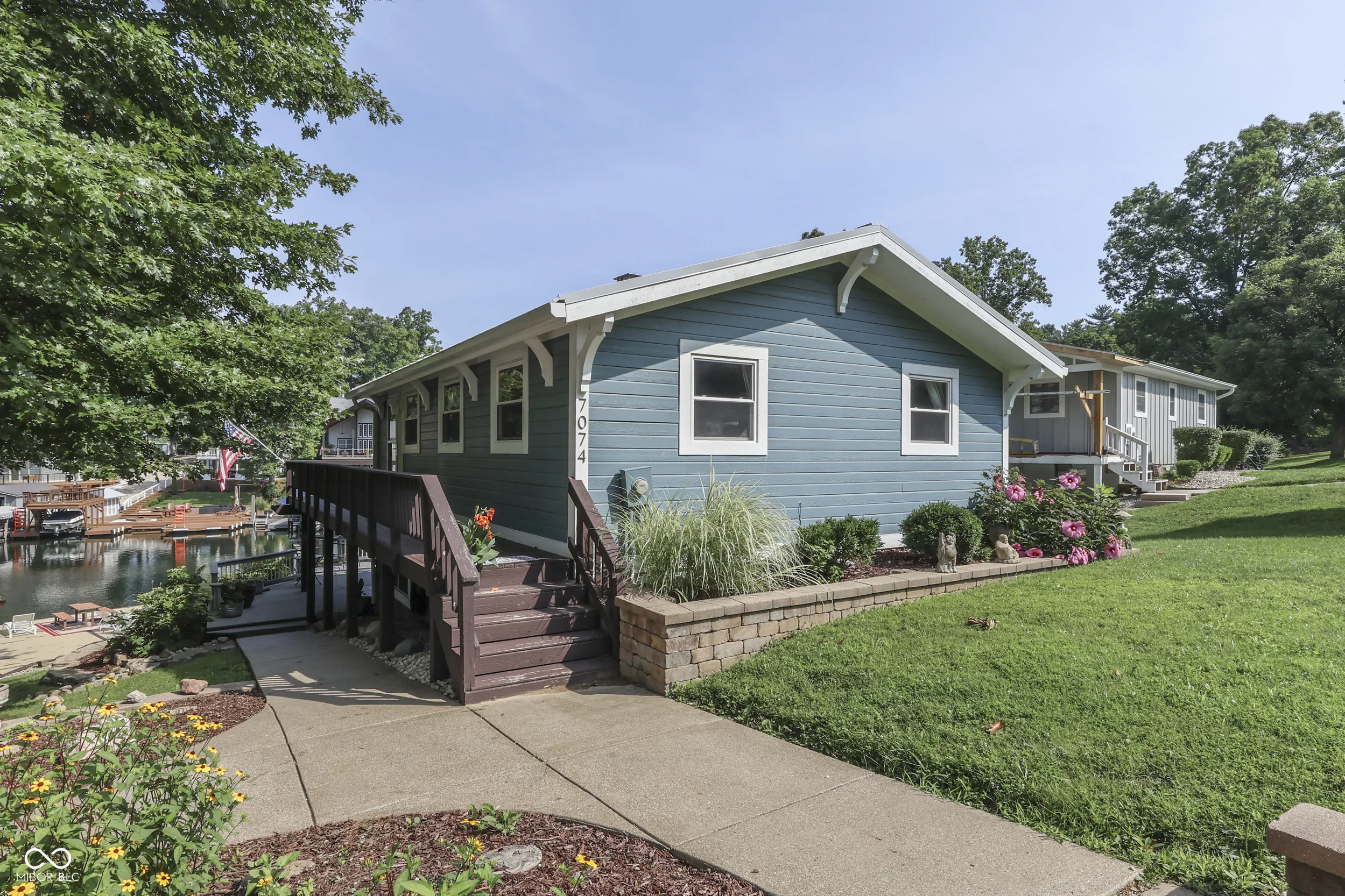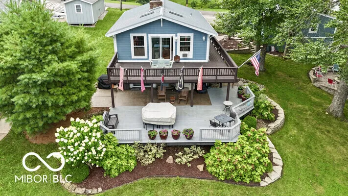 THE PERFECT WATERFRONT LOCATION on beautiful Sweetwater Lake. Savor the sunsets from the Western facing decks and covered porch. Two lot location with 120′ waterfront located on the protected cove water for safe for swimming and fishing away from the buzz of the main lake yet panoramic views of the main lake. Gentle walk to the newly remodeled dock with 2 covered slips w/lift for boats. Water’s edge storage for lake toys. The home is in excellent repair with a walk-out basement living area that includes kitchen, dining, family, sleeping bonus area, and bath. Ceramic flooring in walk-out basement for easy maintenance. Main level features 2 bedrooms, living room w/cathedral ceilings, full bath, hardwood flooring, and multiple decks. Build and enjoy fires in the masonry fireplaces on each level. Store your boats, autos, trailers, etc. in the detached 2 car garage w/ opener. Professional landscaping with newer circular stone paver firepit patio area offer evening gathering fun around the fire. Unmatched location welcome you to this attractive setting on the lake. *Dock area remodel not quite finished at listing date.