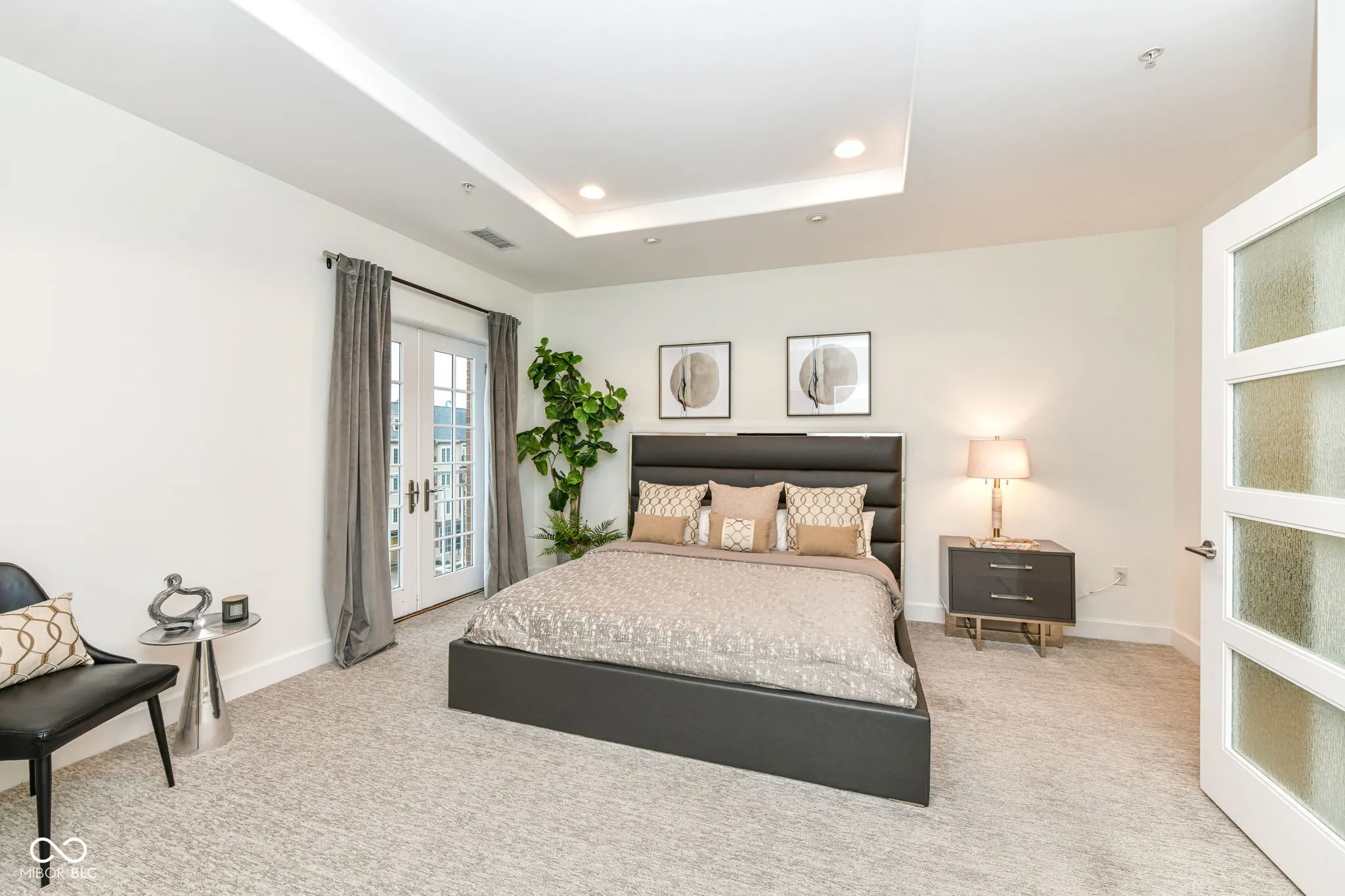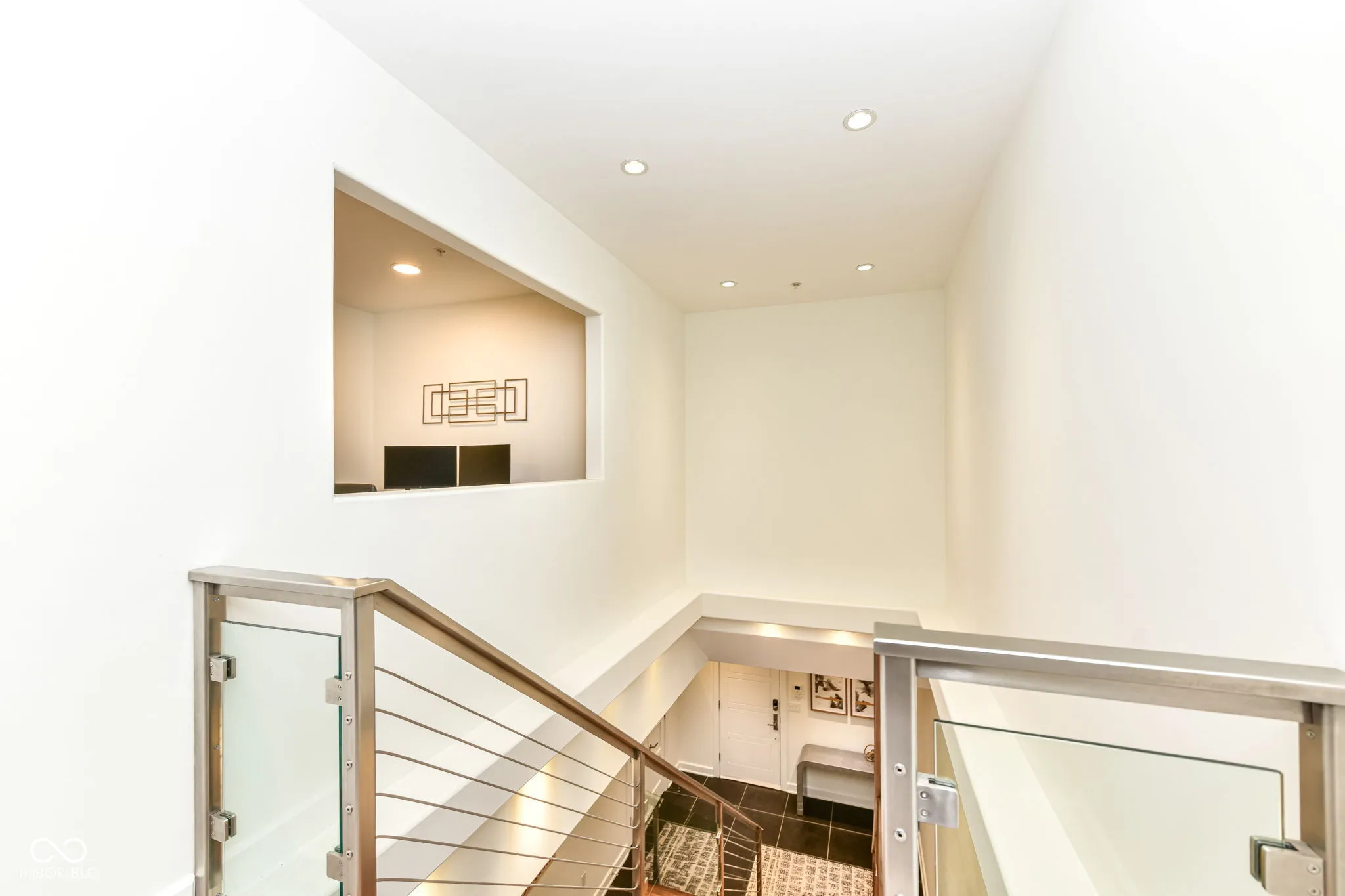 This contemporary penthouse is located in the heart of the Carmel Arts District in a private, four-unit building. The main floor features an open-concept layout including a kitchen, dining area, and living room with a fireplace. Large windows and French doors overlook Main Street, providing natural light and views of the district. A custom stairway leads to a dedicated upper-level owner’s suite featuring a bedroom, office, and large bathroom with a walk-in closet and laundry room. The building is constructed with concrete floors, a fire sprinkler system, and extra sound barriers for privacy. This unit includes a second main-floor bedroom with a full bath and a private, attached indoor parking garage.