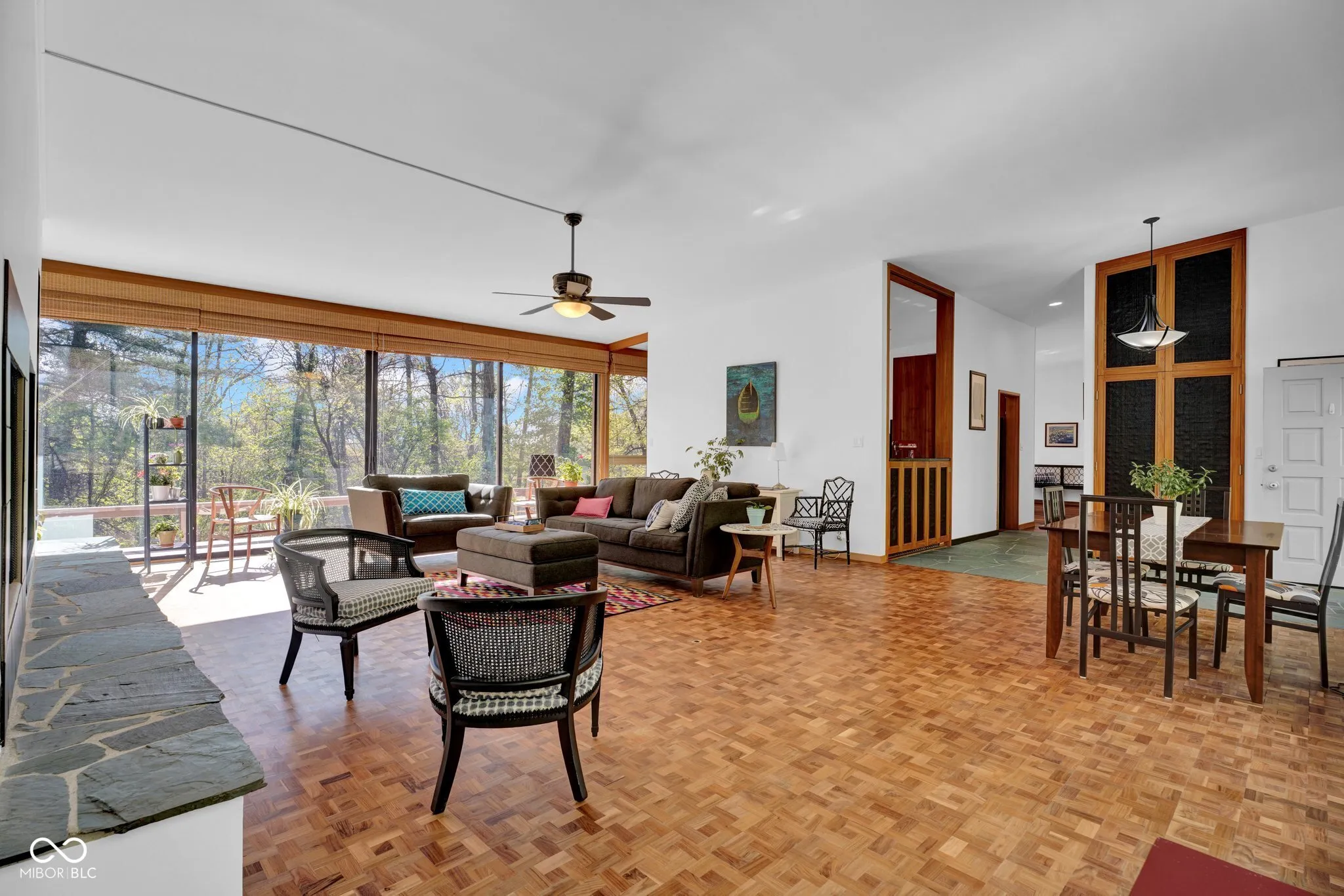 Discover a rare opportunity to own a stunning mid-century modern retreat set on over 4 private acres in Columbus! Located at 9806 Raintree Dr N, this one-of-a-kind property seamlessly blends timeless architecture with serene natural surroundings. True to mid-century design, the home showcases clean lines, expansive windows, and an open, flowing layout that brings the outdoors in. Natural light pours into the main living spaces, highlighting the home’s character and creating a warm, inviting atmosphere. Multiple fireplaces serve as striking focal points throughout the home, adding both architectural charm and cozy gathering spaces perfect for Indiana seasons. The spacious living and dining areas are ideal for entertaining, while the kitchen offers functionality and style with a touch of connection to the main living spaces. The bedrooms provide comfortable, private retreats, including a relaxing primary suite, all thoughtfully designed with mid-century character in mind. Step outside and experience a true highlight of this property-over 4 acres of peaceful, wooded surroundings. Whether you’re enjoying your morning coffee by the fire, hosting gatherings, or simply taking in the beauty of nature, this expansive setting offers unmatched privacy and endless possibilities. Distinctive mid-century charm in a private, tranquil setting all within close proximity to Columbus amenities