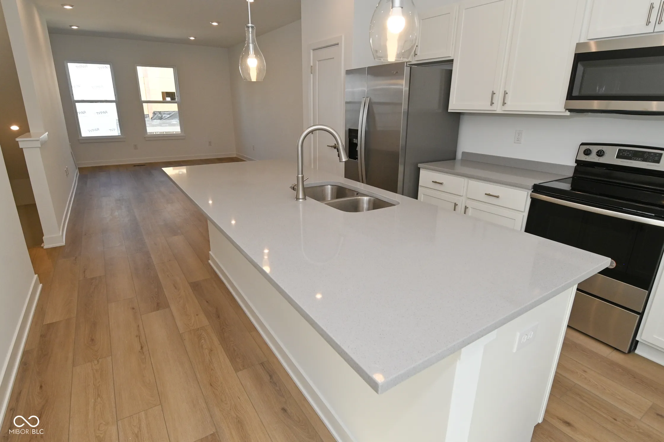 This thoughtfully designed townhome blends modern elegance with everyday functionality. This end unit features luxury fixtures and charm. The main level has a two car garage and a versatile bonus room – perfect for a home office or playroom. The open concept living space is on the second level and has abundant natural light. The kitchen has sleek quartz countertops, stainless steel appliances, and a large center island. The third level hosts the primary suite with a walk in closet and deluxe private bathroom. The additional bedroom, full bathroom, and laundry closet are also on the third level for added convenience. Income restrictions apply. Home must be owner occupied.