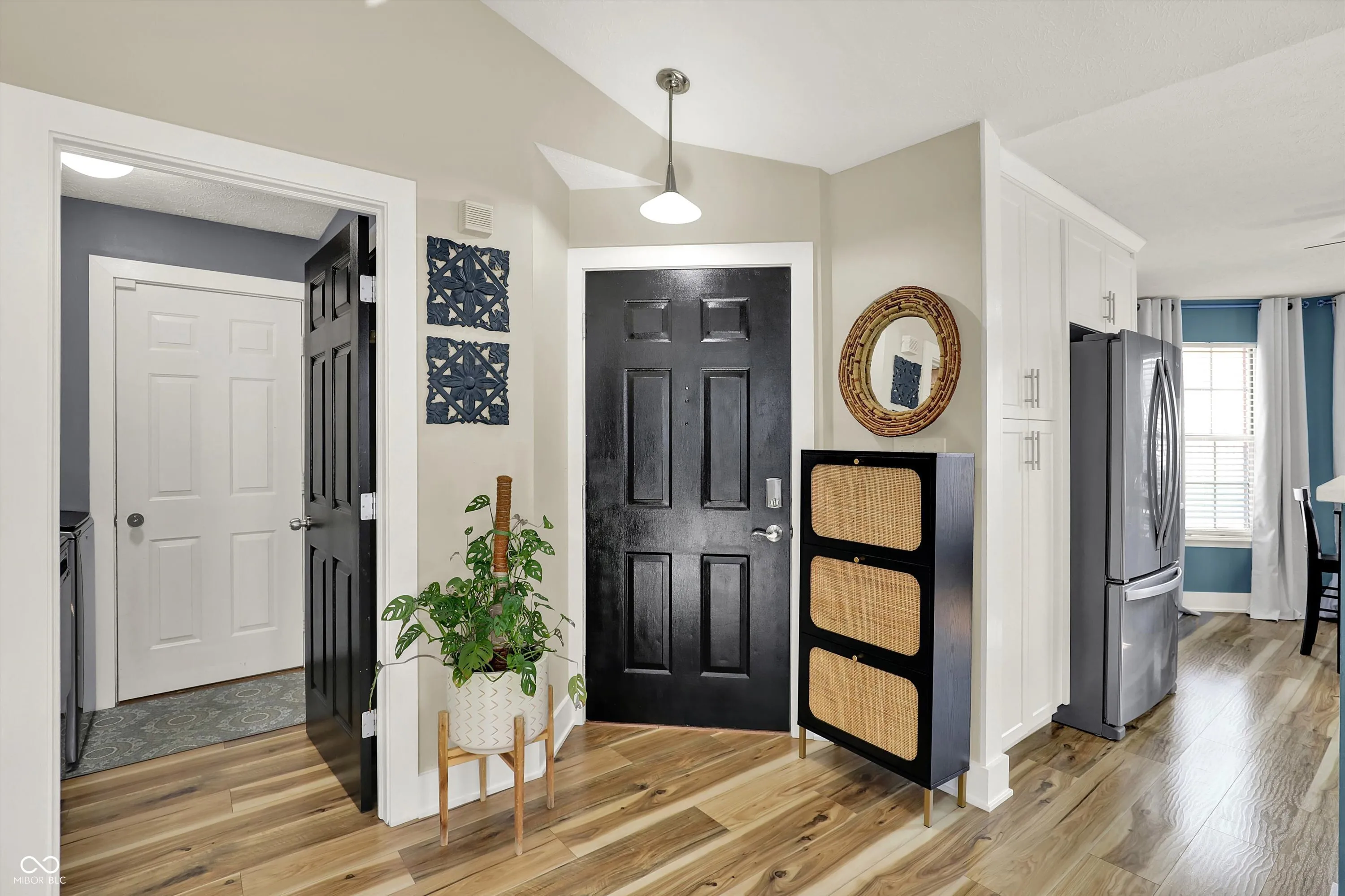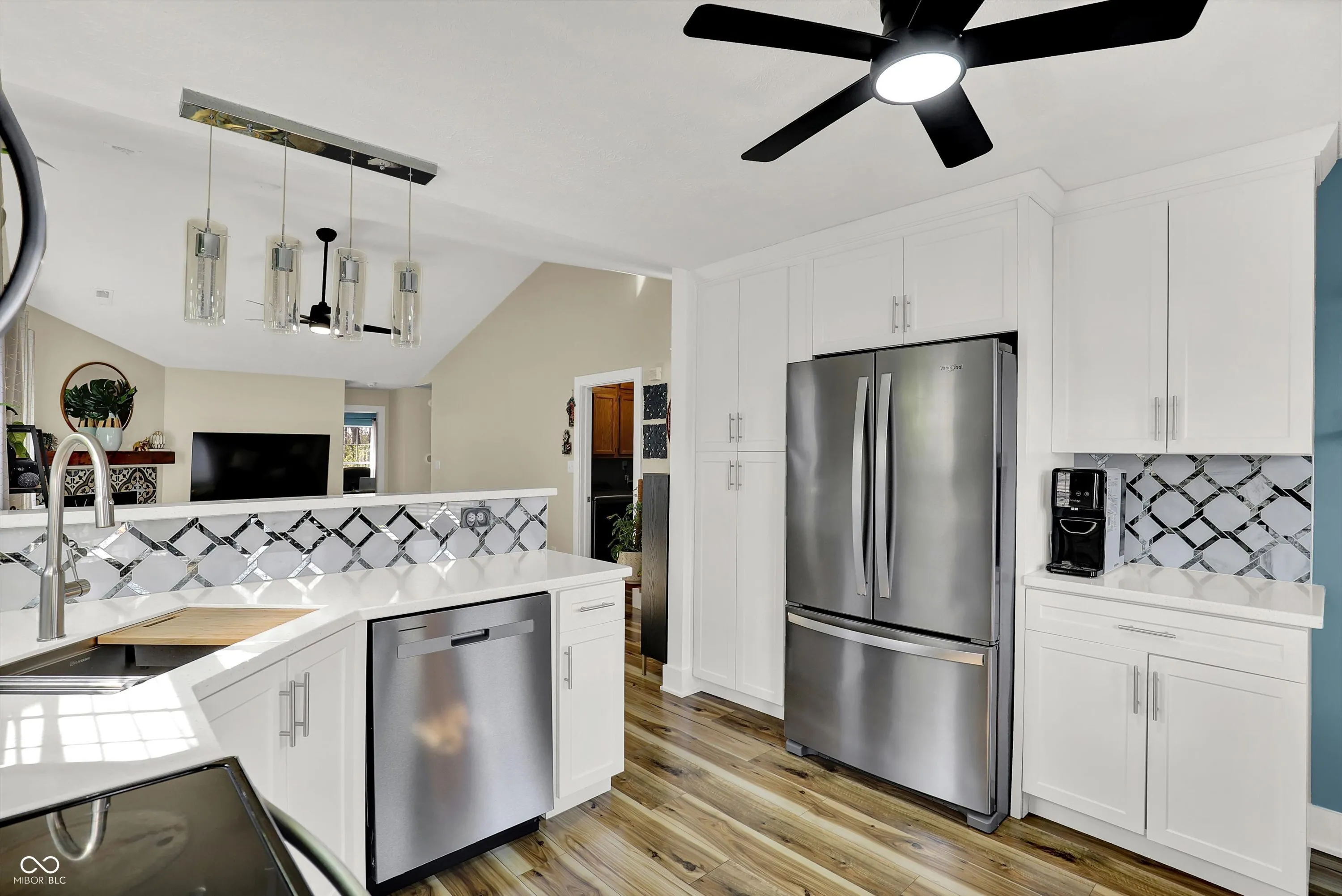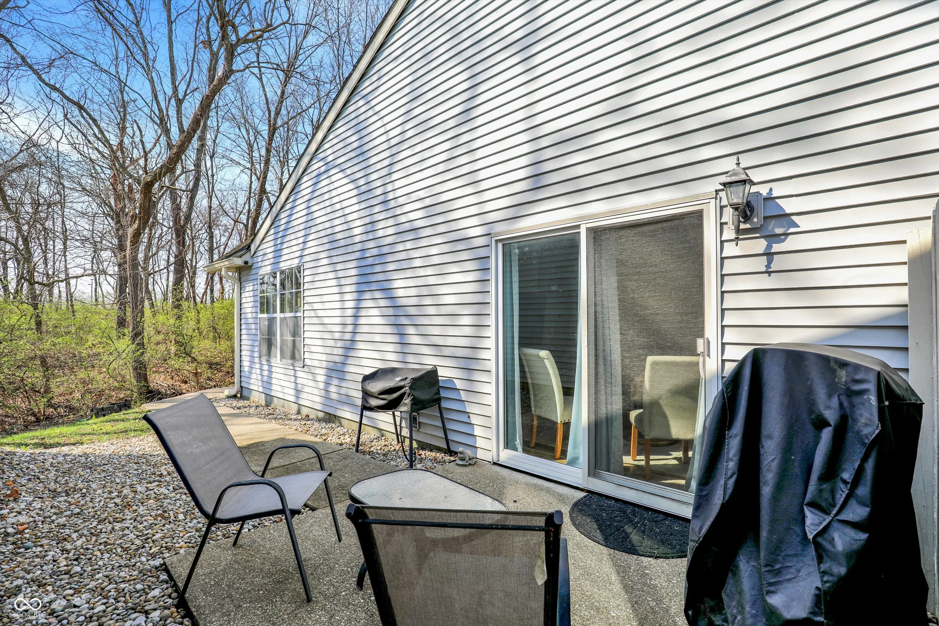 Nestled on a beautiful wooded lot, this fully updated 3-bedroom, 2-bath home offers the perfect blend of modern style and serene natural surroundings. Enjoy peaceful views from the expansive custom deck overlooking mature trees and a gently flowing creek-your own private retreat right at home. Step inside to a bright, open great room with vaulted ceilings, updated wood-style flooring, contemporary fixtures, and fresh paint throughout. A cozy wood-burning fireplace with a stunning Mediterranean-style tile surround and rustic mantel creates a warm and inviting focal point. The updated eat-in kitchen features new cabinetry, Corian countertops, stainless steel appliances, brushed nickel hardware, tile backsplash, and a breakfast bar, all complemented by a charming bay window that fills the space with natural light. The spacious primary suite boasts vaulted ceilings, a private en-suite bath, and direct access to the back deck-perfect for morning coffee or unwinding in the evening. A large second bedroom with a bay window offers flexibility as a guest suite or second primary, while the third bedroom overlooks the tranquil backyard. Additional highlights include a dedicated laundry room with built-in storage cabinets and a finished attached one-car garage with extra storage space. Outdoor living shines with a private patio leading to the expansive deck, ideal for entertaining or simply enjoying the peaceful wooded setting and soothing sounds of the nearby stream. Located in a desirable area near Eagle Creek Reservoir with access to trails, and just minutes from shopping, I-465, I-65, the airport, and downtown Indianapolis-this move-in-ready home truly has it all.