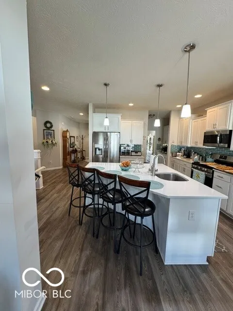 Beautiful home featuring 4 bdrms, 2-1/2 baths, 3 car garage and covered front porch. 9 ft ceilings on 1st floor. Kitchen has staggered white cabinets with crown molding, laminate floor, quartz countertops, can lights, large island w pendant lights, newer stainless steel appliances and a butler’s pantry/coffee bar. Inviting gas fireplace w/built-ins on each side in the living room. Family room on 2nd level has a variety of uses! Large mudroom off garage with custom drop zone and coat closet. Upstairs features 4 bdrms, family room, 2 baths and a convenient laundry room. The large primary suite has double sinks, whirlpool tub, separate tiled shower, transom window and walk in closet. Outdoor space is very peaceful with Sunsetter awning over the 12×28 patio, brick pavers leading to a firepit. Vinyl privacy fenced back yard w utility barn; also includes raised garden bed. Nice service door from garage to back yard.