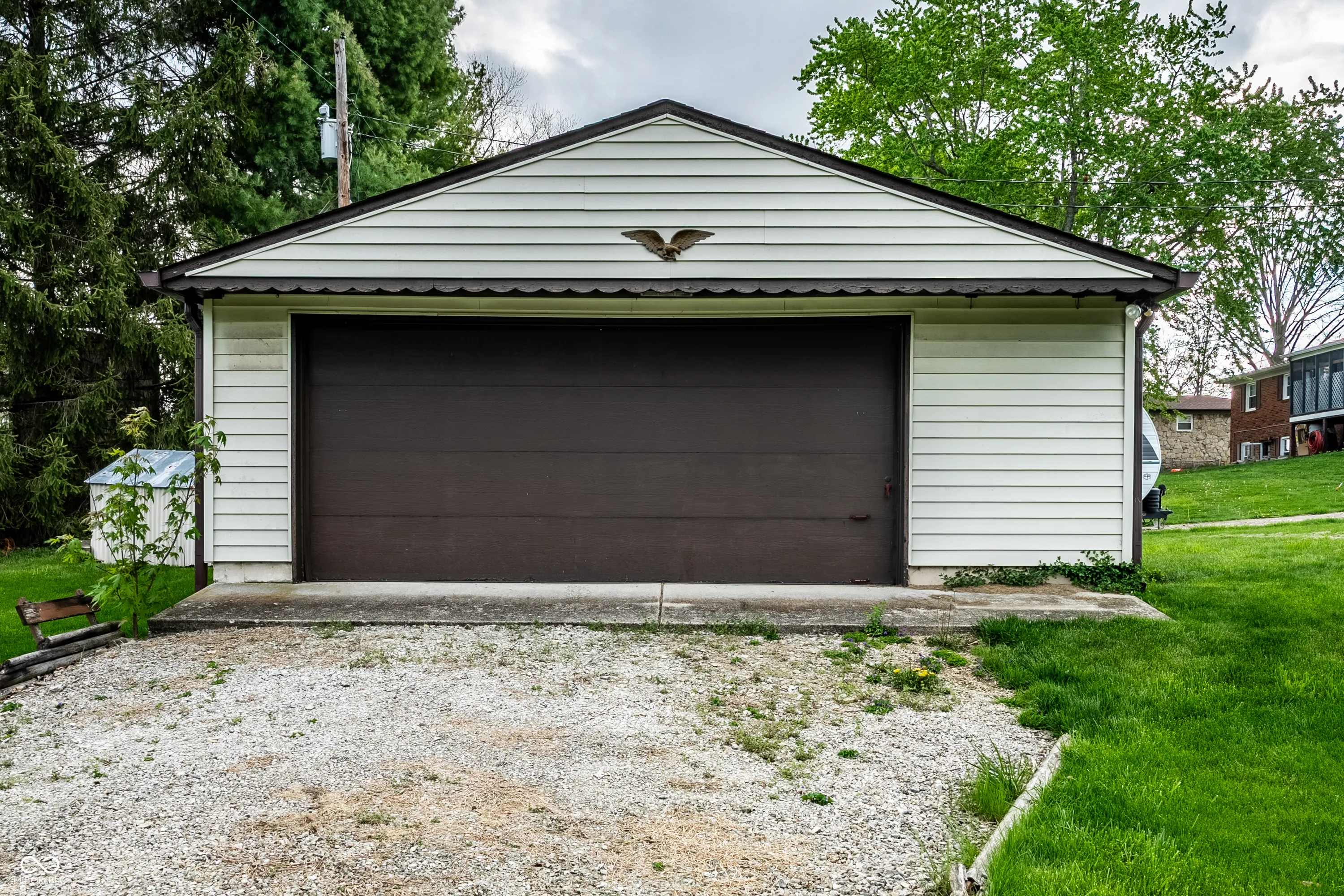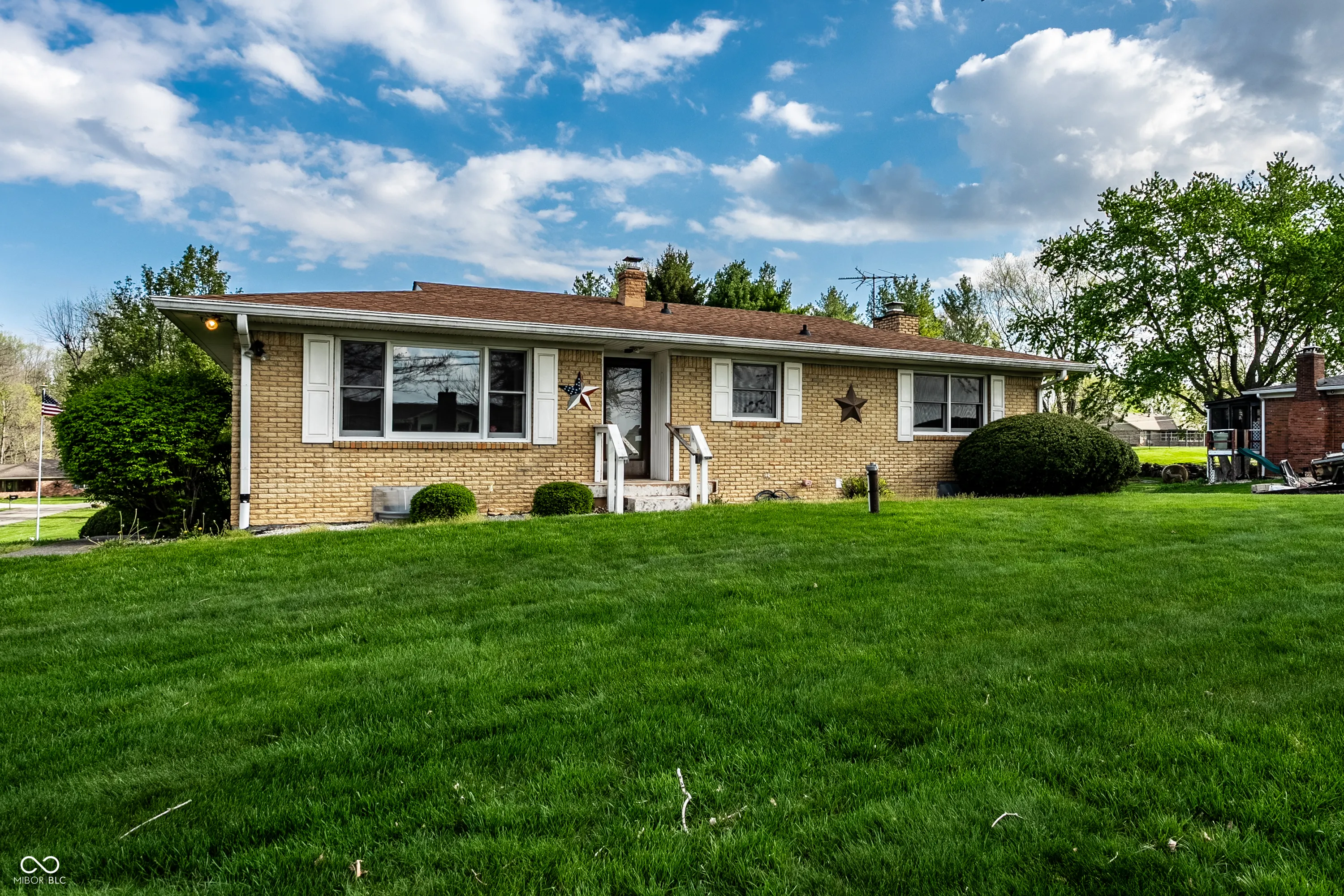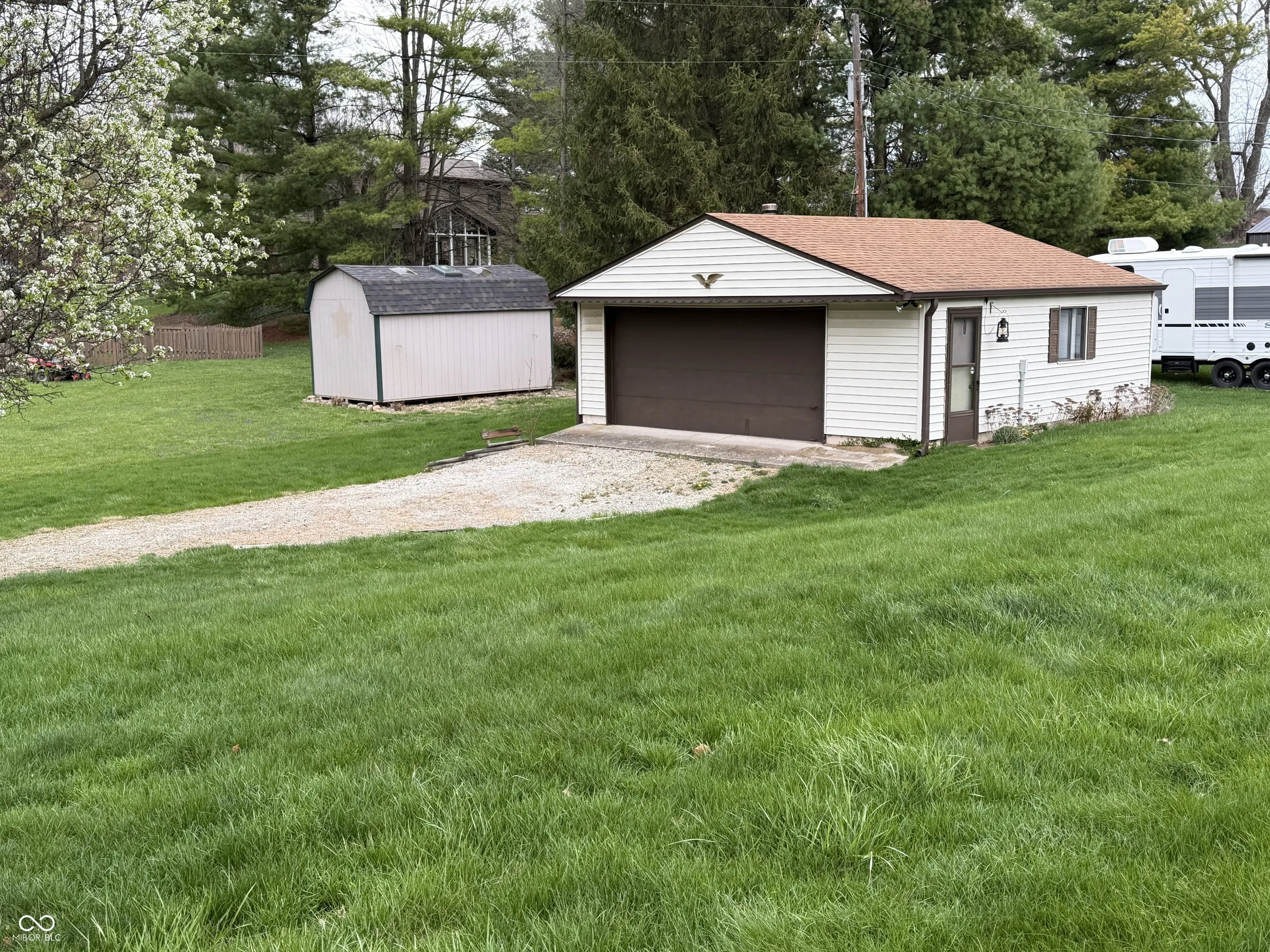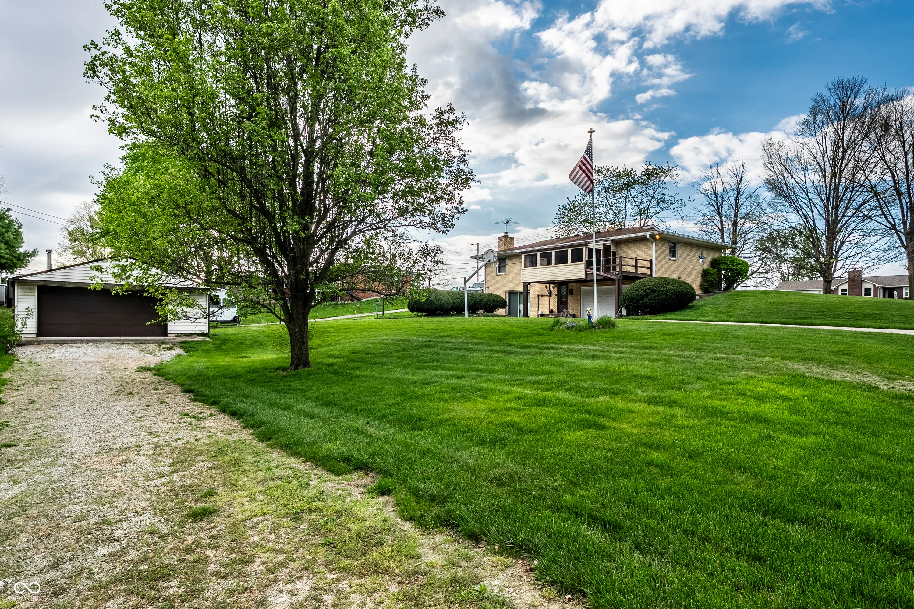 Situated in the highly sought after town of New Palestine, this single-family, one owner, well maintained home presents a distinctive opportunity for a personalized living experience. Established in 1967, this property is a blank canvas to make your own without the confines of an HOA. The single-story layout encompasses 1288 square feet of interior living space on the main floor and features a large front living room, spacious kitchen, 3 bedrooms and screened-in balcony porch extending your living space. The walk-out basement offers an additional 729 square feet, currently used as the family room and complete with full bath, laundry room and access to the attached spacious 2 car garage . Outside, the property extends across an impressive .65 acre corner lot with a second detached 2 car garage, previously used as a wood-working workshop and complete with a cozy wood burning stove. A nice perk of this home is the existence of hardwood floors present under the existing main floor carpet. The sturdy brick structure, appealing floorplan, large amount of storage areas and space for parking with nearby proximity to restaurants and shopping make this home a keeper awaiting its next chapter.
