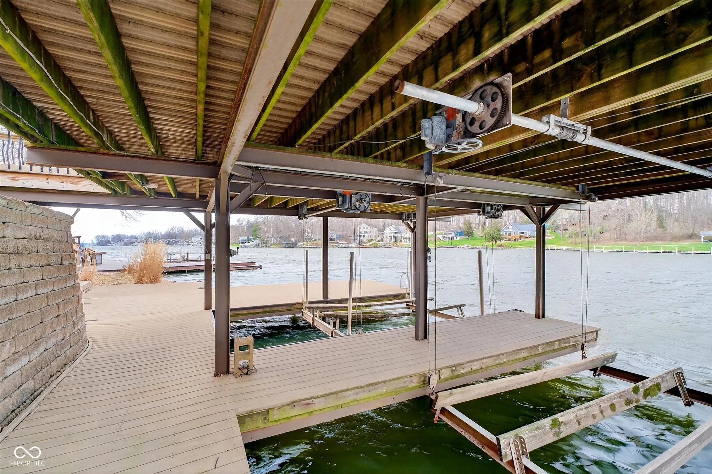 Stunning Waterfront Residence at Heritage Lake! Presenting an exceptional turn key lakefront property offering commanding water views and classic lakehouse character on a mature, tree-lined lot with scenic walkways. This residence provides a refined yet relaxed setting for year-round living or a distinguished weekend retreat. Property Features: Two bedrooms plus loft (suitable as a third sleeping area or recreation room) and two bathrooms. Great room area has vaulted ceilings and expansive windows framing the lake for wonderful views. Expansive double party deck with motorized boat lifts – designed for entertaining and waterfront enjoyment! Direct access to the lake with the convenience of docking your boat and dining at the nearby lakefront restaurant. Oversized four-car garage with dedicated workshop space for vessels, equipment, and seasonal storage. Grounds characterized by mature trees and established walkways, offering privacy and a natural setting. Community Amenities include: Heritage Lake affords private beaches for each section, a community pool, clubhouse, tennis and pickleball courts, and playground facilities. The property sits directly across a cove from one of the community beaches and playground. This property is an exceptional opportunity to acquire a distinguished waterfront residence on Heritage Lake!