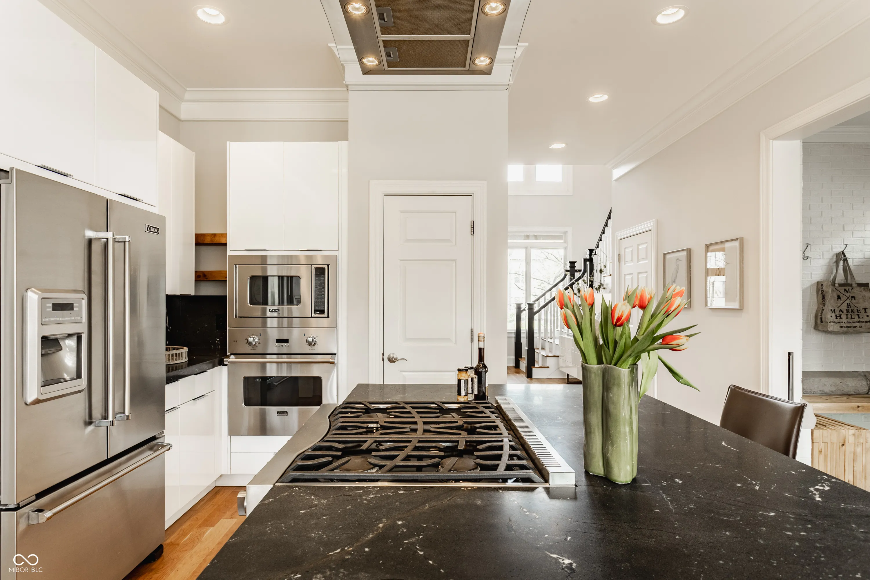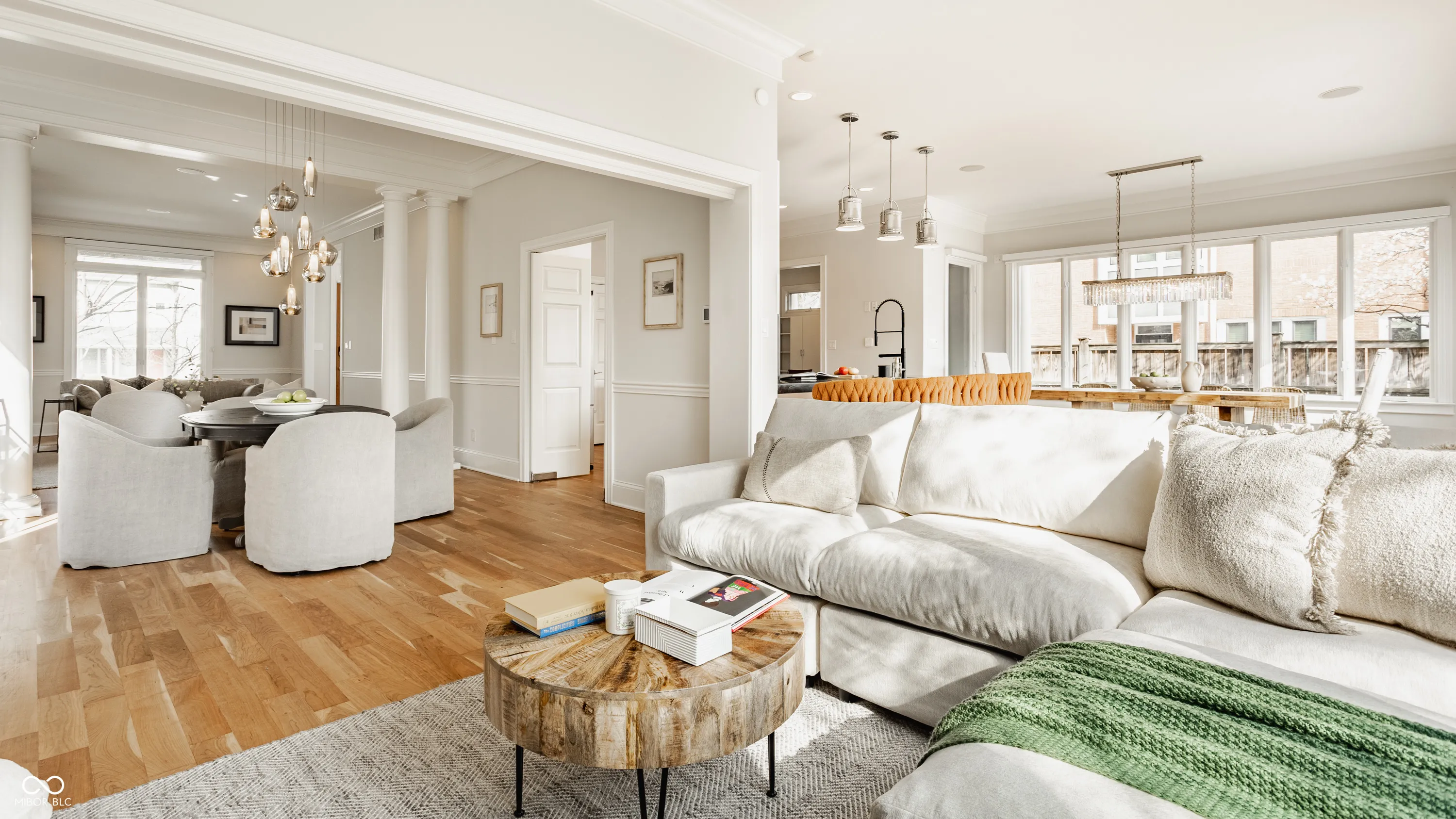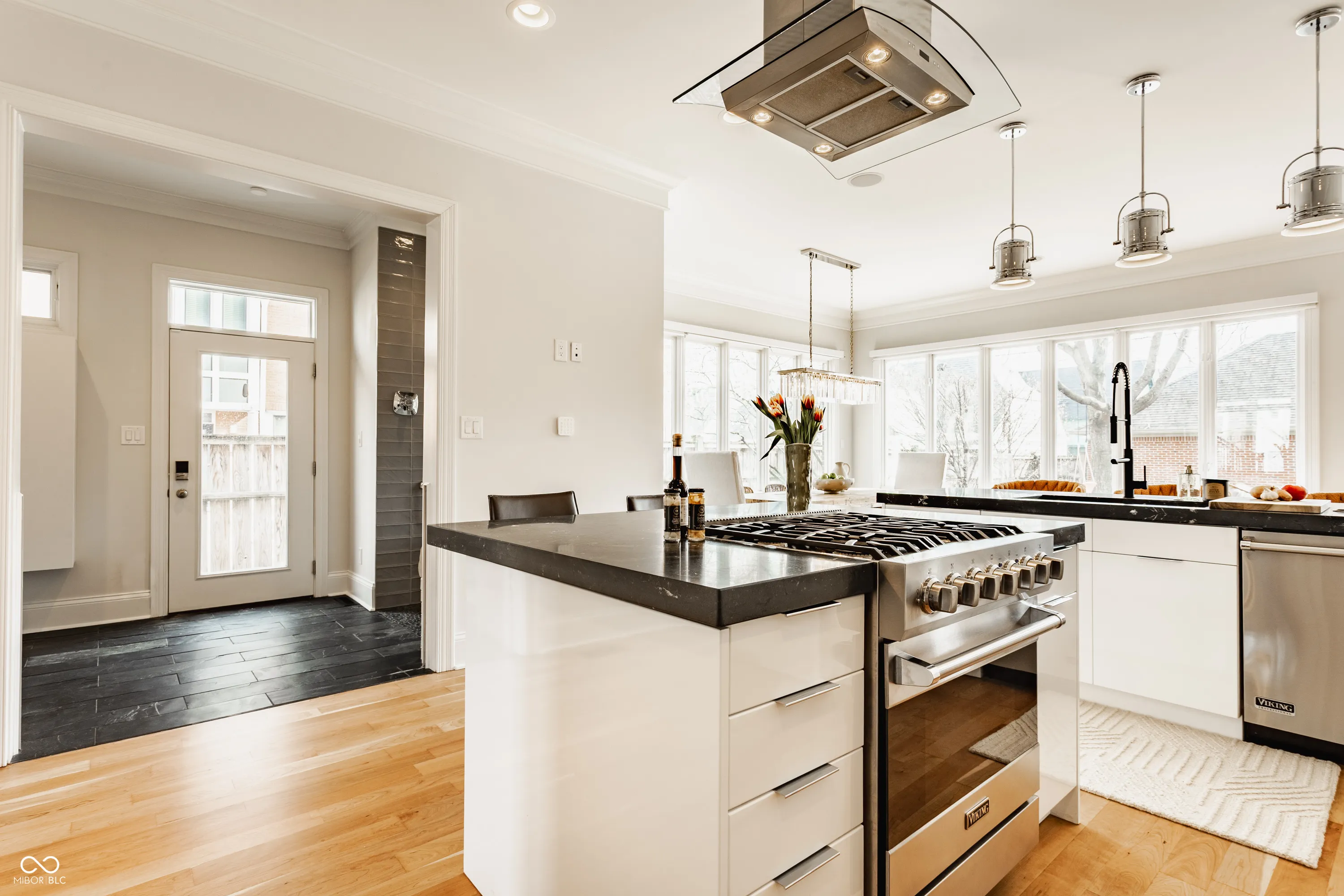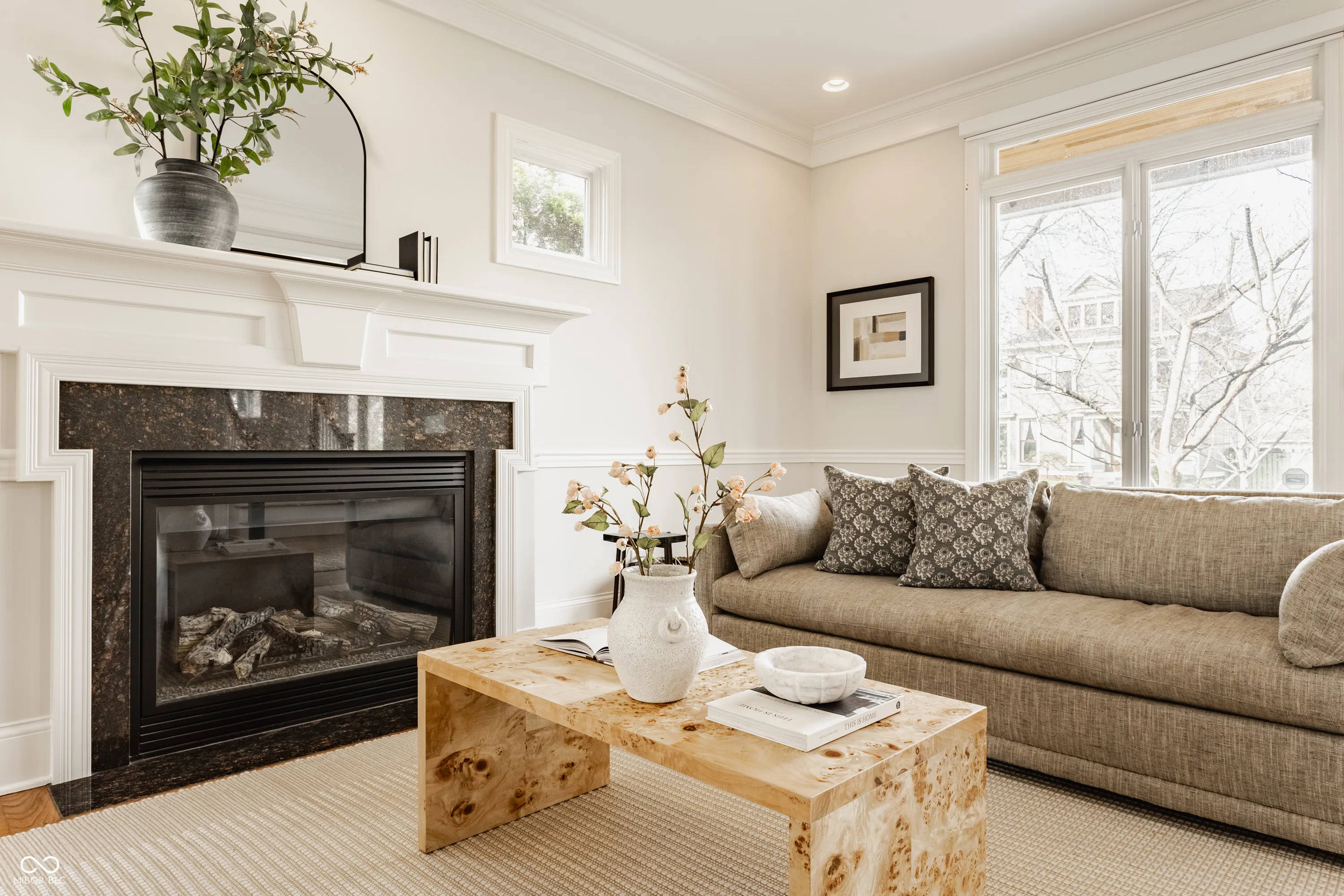 Located in the heart of the prestigious Old Northside, this custom-built residence offers sophisticated living space that seamlessly blends historic charm with timeless luxury. The large foyer makes a striking first impression with soaring 20-foot ceilings and a spacious loft, leading into a light-filled main level defined by 10-foot ceilings and stunning solid, natural American cherry hardwood floors. Recently refinished to highlight their organic warmth, these floors complement a fresh, neutral palette and custom woodwork that flows throughout the entire home. The gourmet kitchen, bathed in natural light, is a chef’s dream, featuring custom cabinetry, professional-grade Viking appliances, and thick soapstone countertops that provide a durable yet high-end aesthetic perfect for entertaining. Practical luxury is found in automated blinds that offer effortless control over the sunlight throughout the main living areas, as well as the beautifully appointed mudroom featuring a dedicated dog bath for ultimate convenience. Equally impressive is the primary suite, which includes a meticulously designed bathroom featuring a large walk-in shower, a deep soaking tub that maintains a modern, spa-like feel, a custom walk-in closet and upstairs covered porch. The expansive finished basement is perfect for a home theater and includes a custom wine cellar and wet bar. Outside, the professionally landscaped backyard serves as a private oasis with premium blue stone, a brand-new hot tub, and high-quality turf for year-round durability. A rare four-car garage is perfect for the car enthusiast. The home is steps away from the vibrant energy of Bottleworks, Mass Ave, Tinker Street, Bocca and Provider, among others. Also situated minutes from the IU Health multi-billion dollar project, this home represents a rare opportunity in the city’s most walkable neighborhoods. Welcome home!