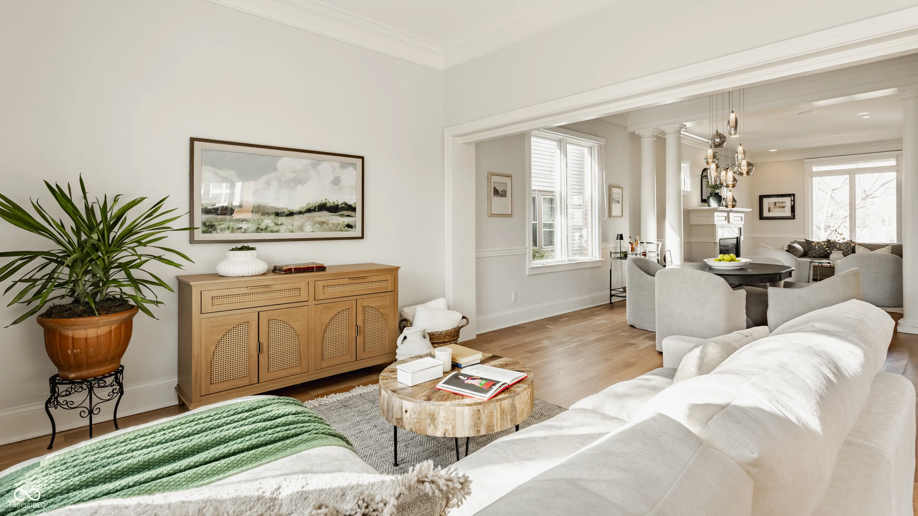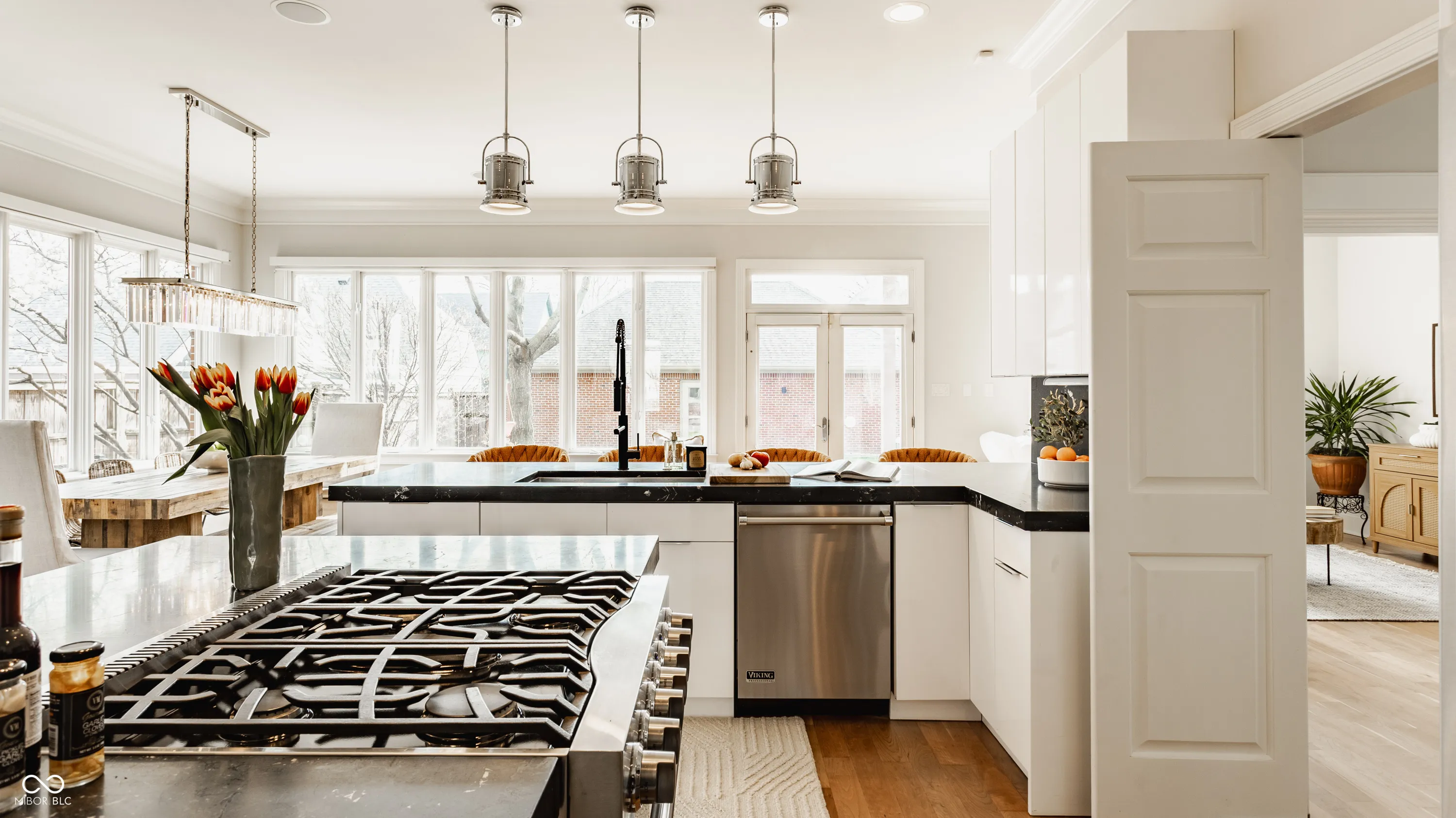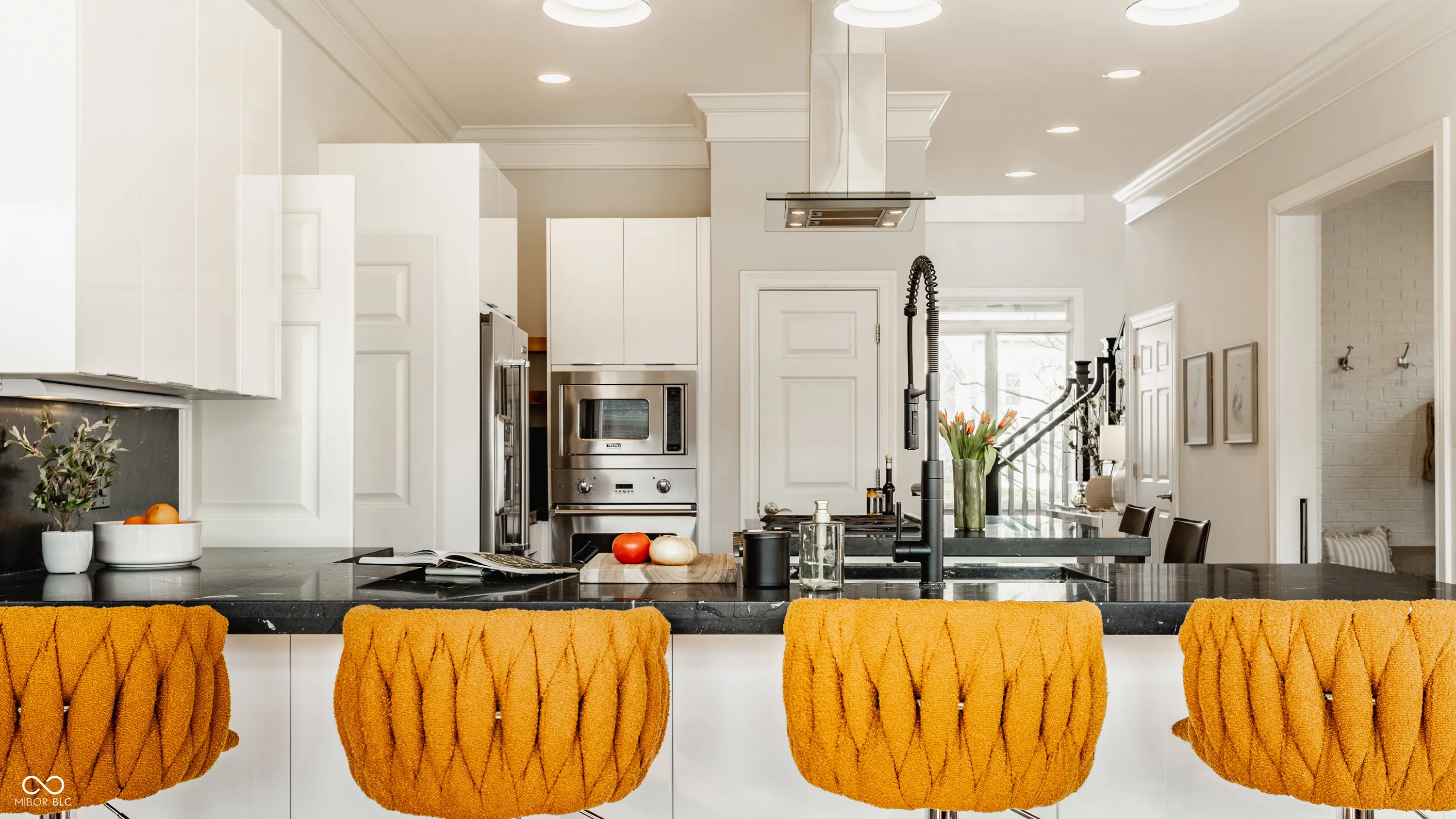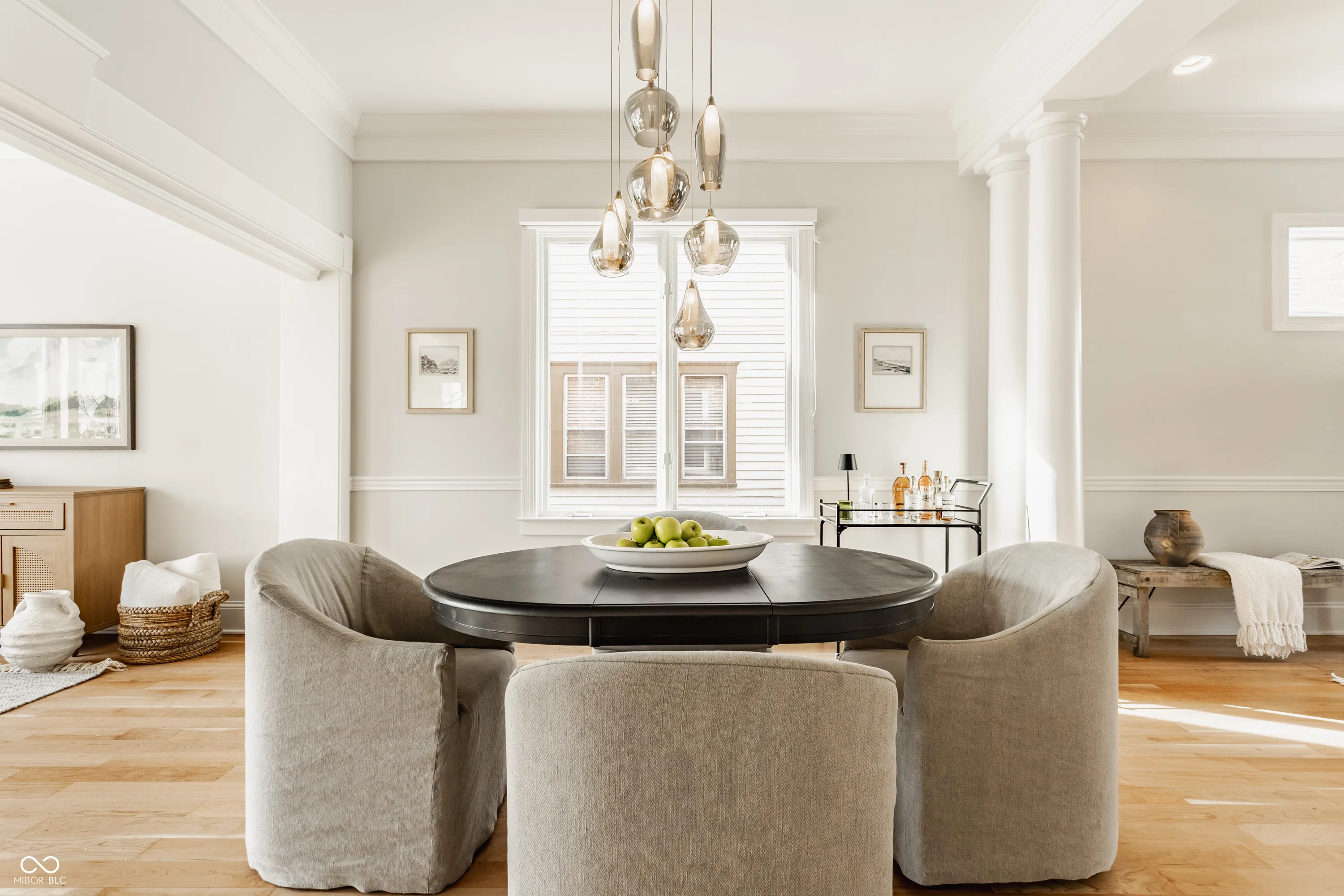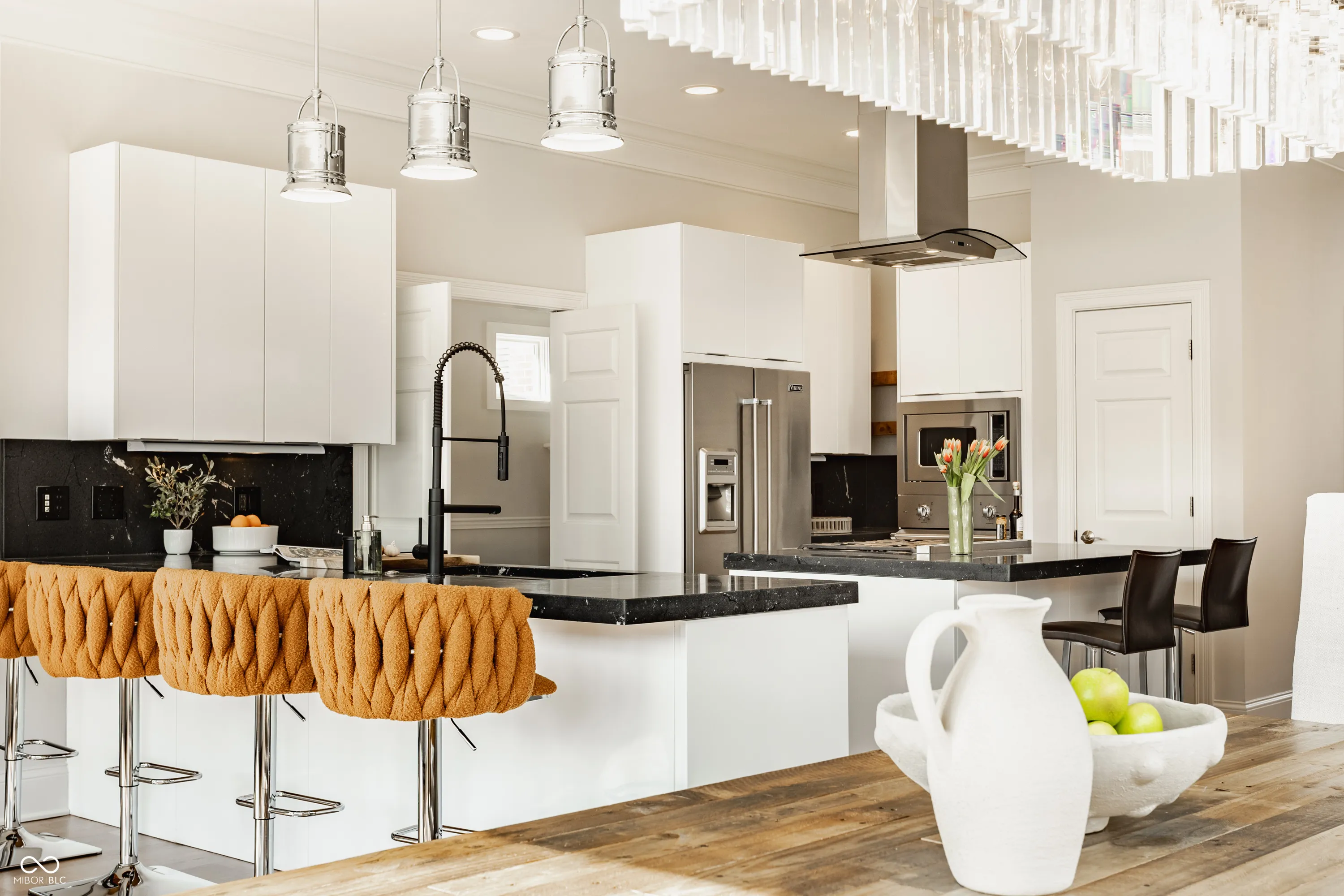 Located in the heart of the prestigious Old Northside, this custom-built residence offers sophisticated living space that seamlessly blends historic charm with timeless luxury. The large foyer makes a striking first impression with soaring 20-foot ceilings and a spacious loft, leading into a light-filled main level defined by 10-foot ceilings and stunning solid, natural American cherry hardwood floors. Recently refinished to highlight their organic warmth, these floors complement a fresh, neutral palette and custom woodwork that flows throughout the entire home. The gourmet kitchen, bathed in natural light, is a chef’s dream, featuring custom cabinetry, professional-grade Viking appliances, and thick soapstone countertops that provide a durable yet high-end aesthetic perfect for entertaining. Practical luxury is found in automated blinds that offer effortless control over the sunlight throughout the main living areas, as well as the beautifully appointed mudroom featuring a dedicated dog bath for ultimate convenience. Equally impressive is the primary suite, which includes a meticulously designed bathroom featuring a large walk-in shower, a deep soaking tub that maintains a modern, spa-like feel, a custom walk-in closet and upstairs covered porch. The expansive finished basement is perfect for a home theater and includes a custom wine cellar and wet bar. Outside, the professionally landscaped backyard serves as a private oasis with premium blue stone, a brand-new hot tub, and high-quality turf for year-round durability. A rare four-car garage is perfect for the car enthusiast. The home is steps away from the vibrant energy of Bottleworks, Mass Ave, Tinker Street, Bocca and Provider, among others. Also situated minutes from the IU Health multi-billion dollar project, this home represents a rare opportunity in the city’s most walkable neighborhoods. Welcome home!