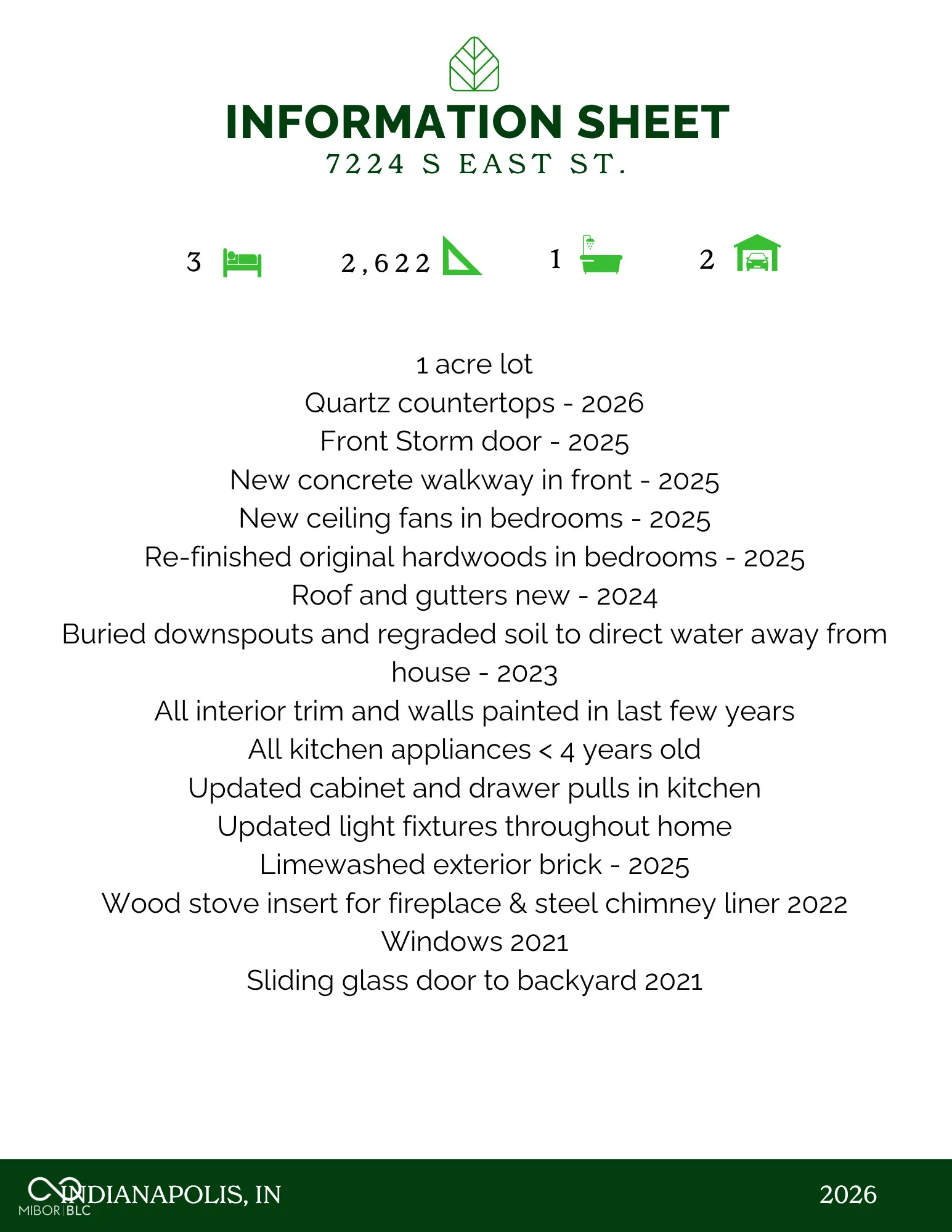 Welcome to a home that offers space, privacy, and tons of new updates. This 3 bed, 1 bath home with a 2-car garage sits on nearly a full acre, giving you room to spread out both inside and out. From the moment you walk in, you’ll notice the character-newly refinished original hardwood floors, natural light, and a layout that feels warm and inviting. The kitchen has been updated with quartz countertops, modern finishes, and newer appliances, while updated lighting and fresh paint throughout the home make it truly move-in ready. Downstairs, the full basement offers incredible flexibility-whether you’re envisioning a home gym, second living space, workshop, or additional storage. Step outside and you’ll find what truly sets this home apart. A large back deck overlooks a private, tree-lined yard-perfect for hosting friends around a fire, enjoying quiet mornings, or simply taking in the peaceful setting. Major improvements have already been taken care of, including a newer roof and gutters, updated windows and sliding glass door, improved drainage with regrading and buried downspouts, and a fireplace adds both warmth and character. Located just 15 minutes from both downtown Indianapolis and downtown Greenwood, with quick access to I-465, you get the best of both worlds-peaceful, spacious living with easy access to everything the city has to offer.
