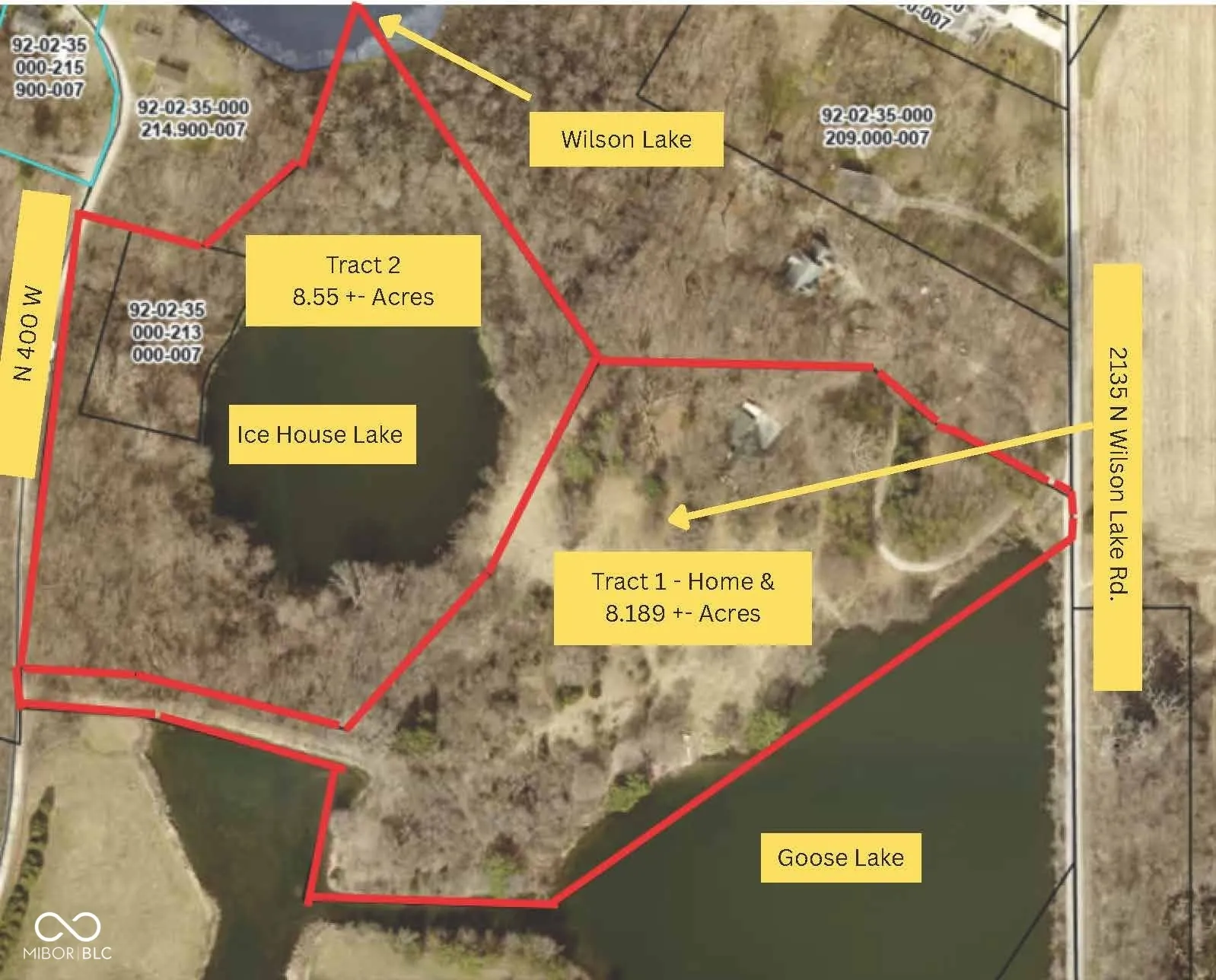 On-site auction, Saturday, May 9th, 2026, at 10 AM Eastern | Open houses Saturday, April 25th, 10 AM-11:30 PM Eastern & Monday, May 4th, 5 PM-6:30 PM | The price stated on this property is a guideline value | This property may sell for more or less than the guideline value, depending on the outcome of the auction bidding. | $15,000 down for tract 1, 15,000 down for tract 2, 30,000 down for tract 1 & 2 day of the auction. | 40 days to close | To see all terms, please visit our website. | Take me home country roads! Have you been looking for the perfect plot of land to build your dream home? This idyllic setting is partially wooded & features lakefront property on 3 lakes: Wilson Lake & Ice House Lake which means serene views in every direction! Located in a quiet & peaceful area less than 10 minutes from downtown Columbia City & only 20 some minutes to Fort Wayne, you have the convenience of nearby shopping, dining & groceries without the hassle of a super long drive while still preserving your privacy & seclusion of the beautiful countryside. Just north of US-30, this slice of paradise is being sold in 2 tracts: Tract 1 contains a rustic A-frame home & 8.189 acres nestled between Wilson Lake & Ice House Lake; Tract 2 is 8.55 acres surrounding Ice House Lake with Wilson Lake waterfront access. The existing home is 3 bedroom, 2 bath with a walk-out lower level & attached 2 car garage – you can update or tear it down & start fresh with the home you’ve always wanted! Note: the home was built in 1972 & has not been maintained very well so if you do decide to keep the current structure, it would need some refreshing before moving in. A long curved gravel driveway winds through the tall trees to a small clearing where the house is tucked away, completely isolated & uber private. Should you choose to renovate, there are some groovy retro features that are quite special such as the wall of windows, wood panel walls & big balcony/deck for relaxing.