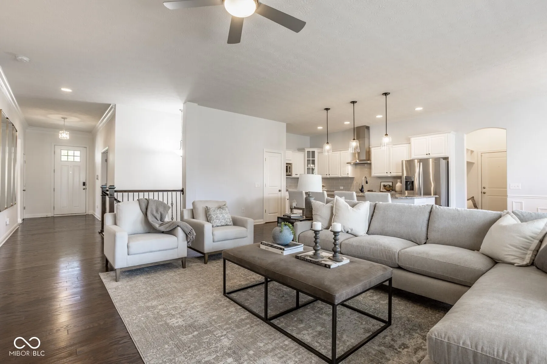Thoughtfully designed 4-bedroom ranch with finished basement, ideally positioned on corner lot in Harmony – one of Westfield’s premier lifestyle communities. The main level features three bedrooms, including a private secondary wing where two bedrooms are connected by a spacious flex area ideal for playroom, study space, or additional living area. The open kitchen, dining, and living spaces are designed for both everyday living and entertaining, with a large center island, stainless steel appliances, and direct access to the covered patio. A dedicated main-level office offers comfortable space for dual workstations. The finished basement extends the home with a fourth bedroom, full bath, and generous flexible living space. Outdoor, enjoy the covered patio overlooking the backyard, along with a welcoming front covered porch that adds to the home’s curb appeal. Recent improvements include updated kitchen and dining lighting, reverse osmosis system, and EV-ready electrical in the garage. Additional highlights include custom California Closets, irrigation system, and smart home features. Located in Westfield, one of Central Indiana’s fastest-growing communities, this home offers access to top-rated schools, countless amenities, and a connected, vibrant lifestyle. A well-designed home offering flexibility, comfort, and room to grow.
