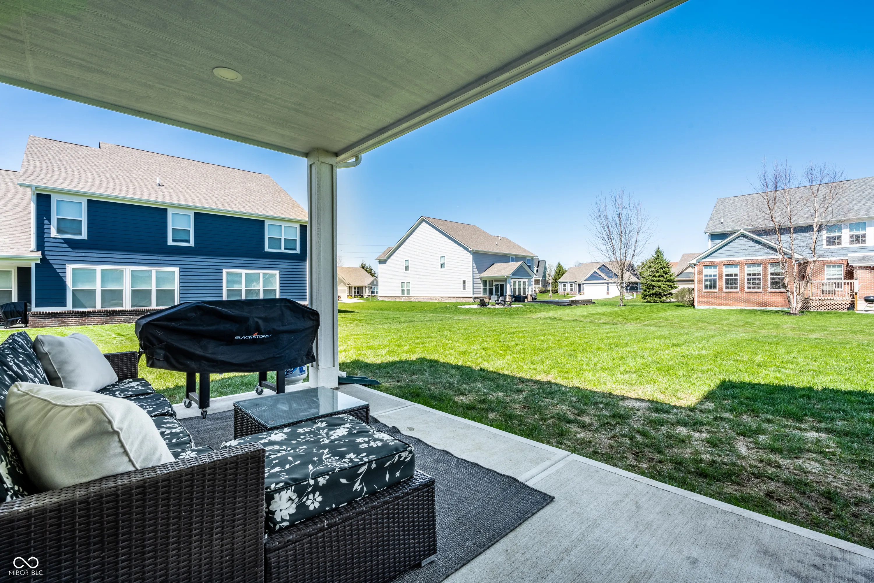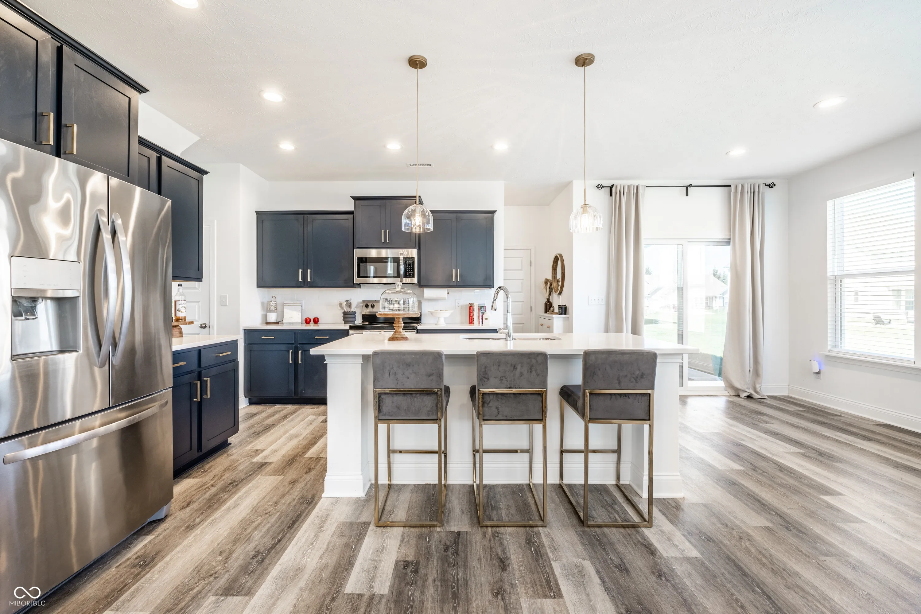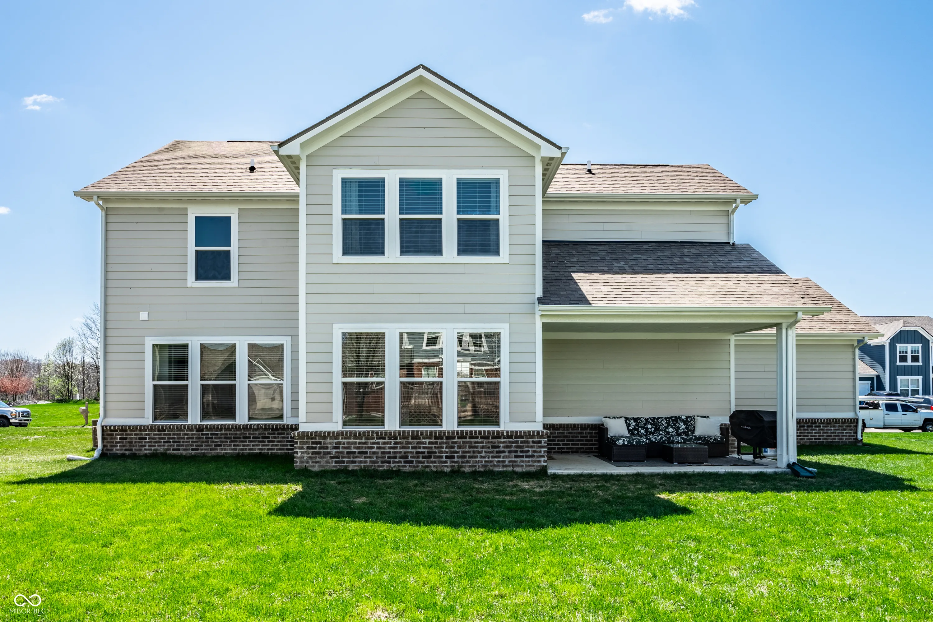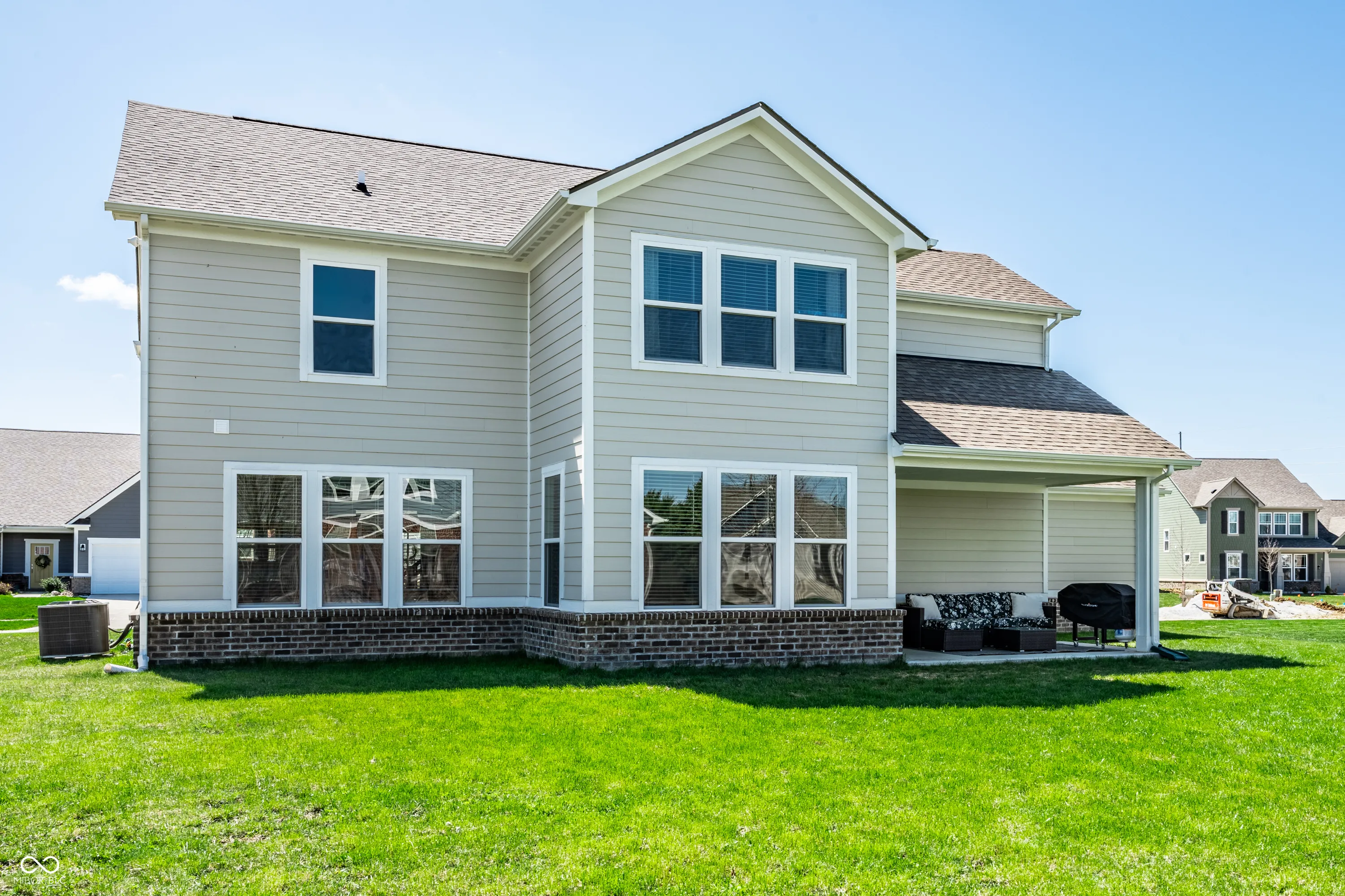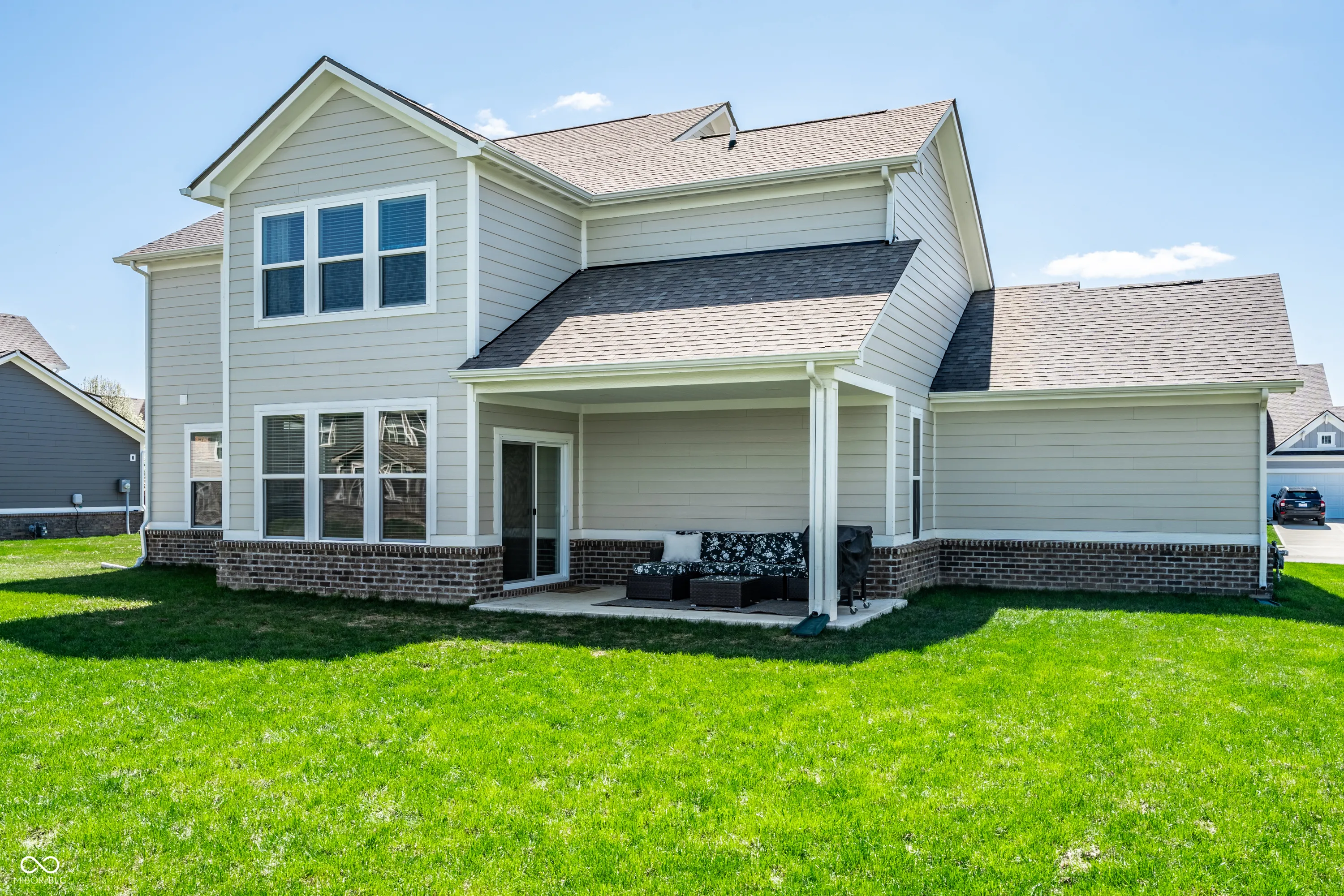 Welcome to this beautifully crafted 2 story home where modern comfort meets timeless charm! Boasting a cozy, inviting covered front and back porch, farmhouse-style elevation and neutral color palette, this home is ready for its next chapter. Step inside the foyer to discover an open-concept layout designed for both everyday living and effortless entertaining. Off the foyer, the formal dining room offers an elegant space for hosting dinners and holiday gatherings and sits across from a versatile flex room, perfect as a private home office, den or guest bedroom. The spacious great room, anchored by a cozy electric fireplace, seamlessly flows into the stunning kitchen where gleaming white granite countertops, bar center island bar seating, stainless steel appliances and not one, but two pantries for ample storage are a chef’s dream. The additional breakfast area opens onto a covered back patio and over a 1/4 acre lot, ideal for morning coffee or evening get-togethers with an adjacent mudroom providing a landing spot to organize bags, coats and shoes after a long day. Upstairs, the spacious primary retreat is bathed in natural light and includes a spa-inspired en suite bathroom with tiled walk-in shower, dual-sink vanity, generous walk-in closet plus linen closet. The dual temperature control and second-floor laundry just steps away add convenience and comfort. In addition to the remaining 3 upstairs bedrooms, a loft offers additional flexible living space, perfect as a playroom, media room or creative studio. As a bonus, the roomy, finished 3-car garage includes an extra rear storage area, perfect for tools, bikes or seasonal items. With its prime location near shops, dining and quick access to Hwy 52 and I-465, this home checks all the boxes!