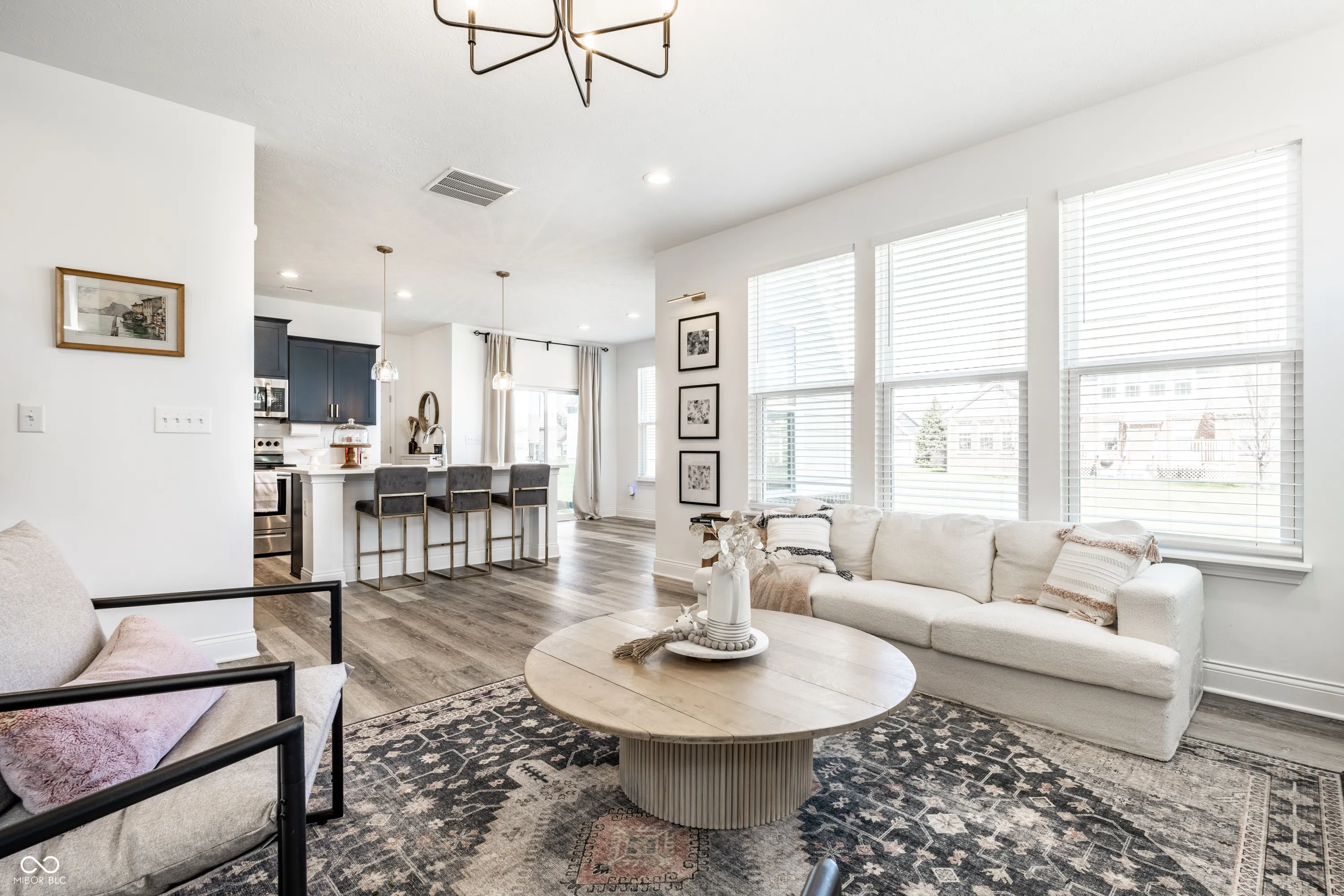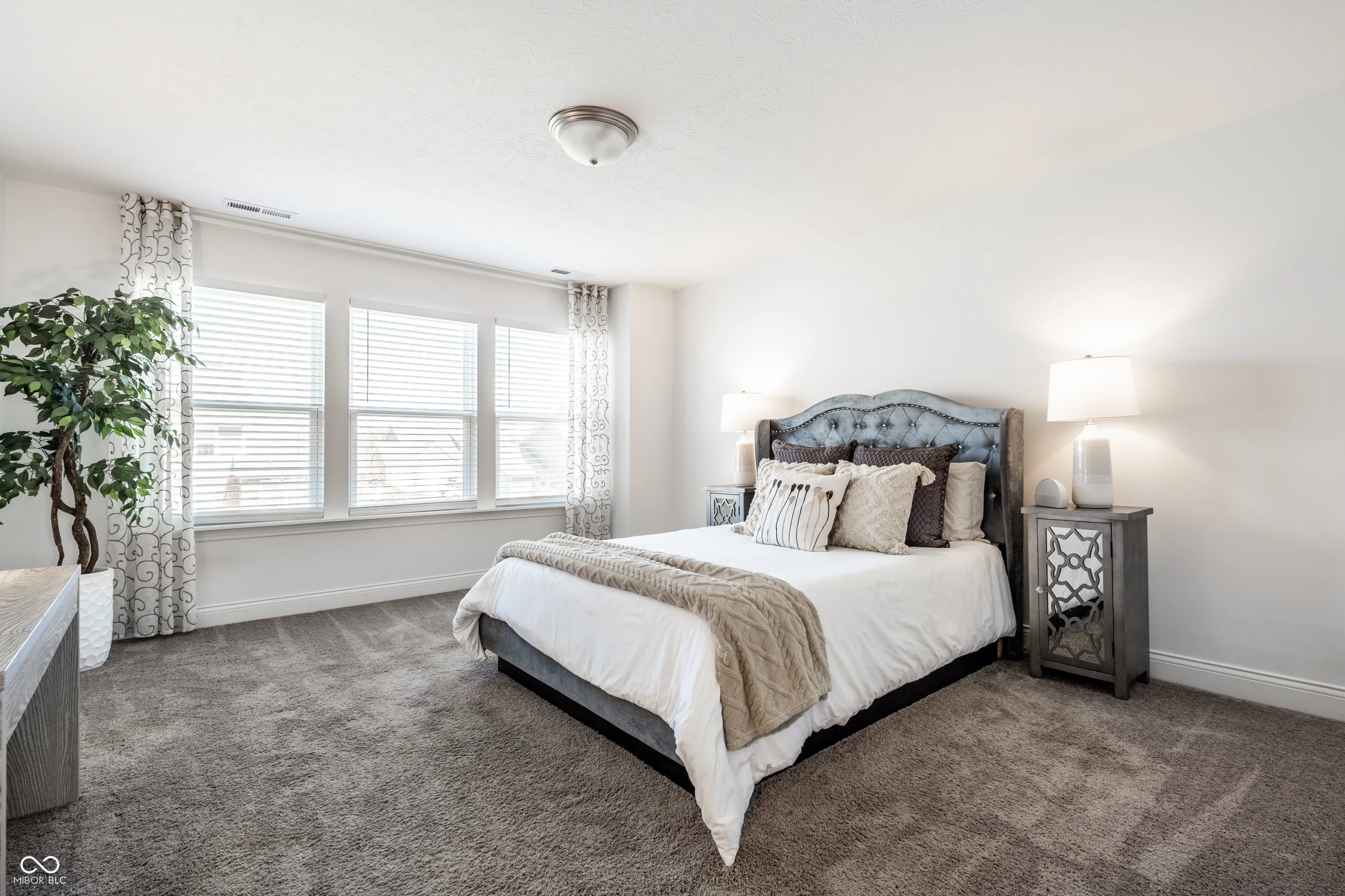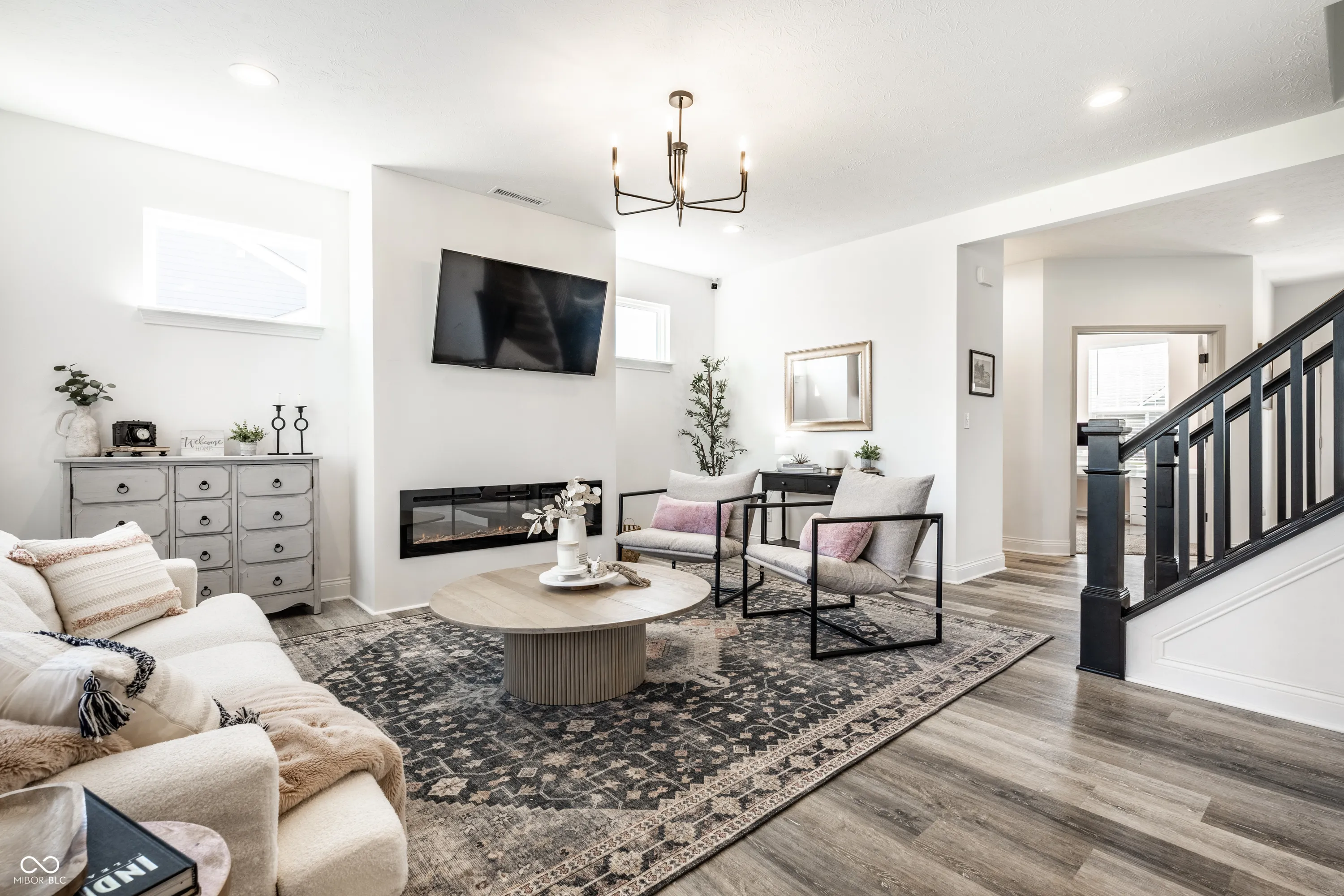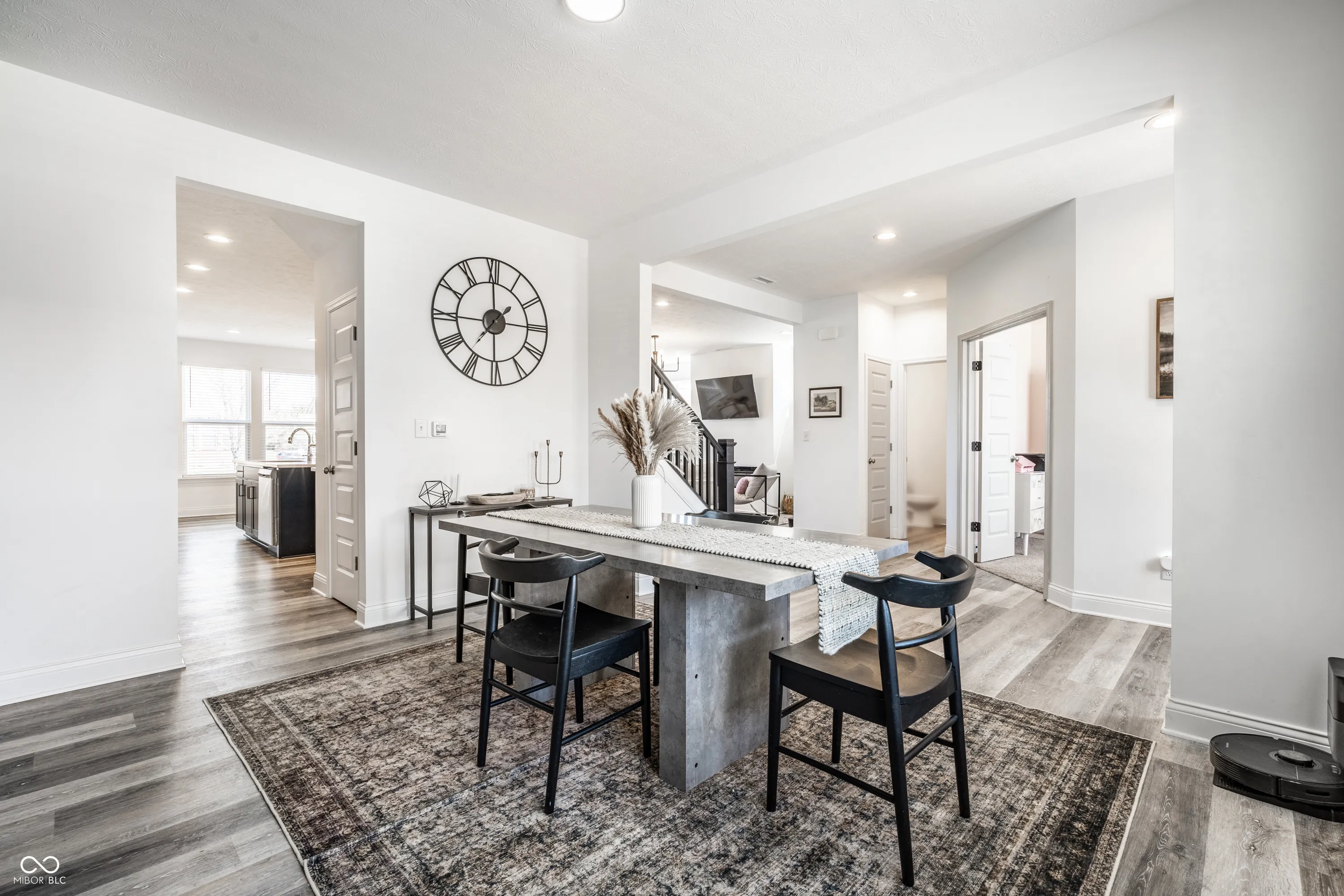 Welcome to this beautifully crafted 2 story home where modern comfort meets timeless charm! Boasting a cozy, inviting covered front and back porch, farmhouse-style elevation and neutral color palette, this home is ready for its next chapter. Step inside the foyer to discover an open-concept layout designed for both everyday living and effortless entertaining. Off the foyer, the formal dining room offers an elegant space for hosting dinners and holiday gatherings and sits across from a versatile flex room, perfect as a private home office, den or guest bedroom. The spacious great room, anchored by a cozy electric fireplace, seamlessly flows into the stunning kitchen where gleaming white granite countertops, bar center island bar seating, stainless steel appliances and not one, but two pantries for ample storage are a chef’s dream. The additional breakfast area opens onto a covered back patio and over a 1/4 acre lot, ideal for morning coffee or evening get-togethers with an adjacent mudroom providing a landing spot to organize bags, coats and shoes after a long day. Upstairs, the spacious primary retreat is bathed in natural light and includes a spa-inspired en suite bathroom with tiled walk-in shower, dual-sink vanity, generous walk-in closet plus linen closet. The dual temperature control and second-floor laundry just steps away add convenience and comfort. In addition to the remaining 3 upstairs bedrooms, a loft offers additional flexible living space, perfect as a playroom, media room or creative studio. As a bonus, the roomy, finished 3-car garage includes an extra rear storage area, perfect for tools, bikes or seasonal items. With its prime location near shops, dining and quick access to Hwy 52 and I-465, this home checks all the boxes!