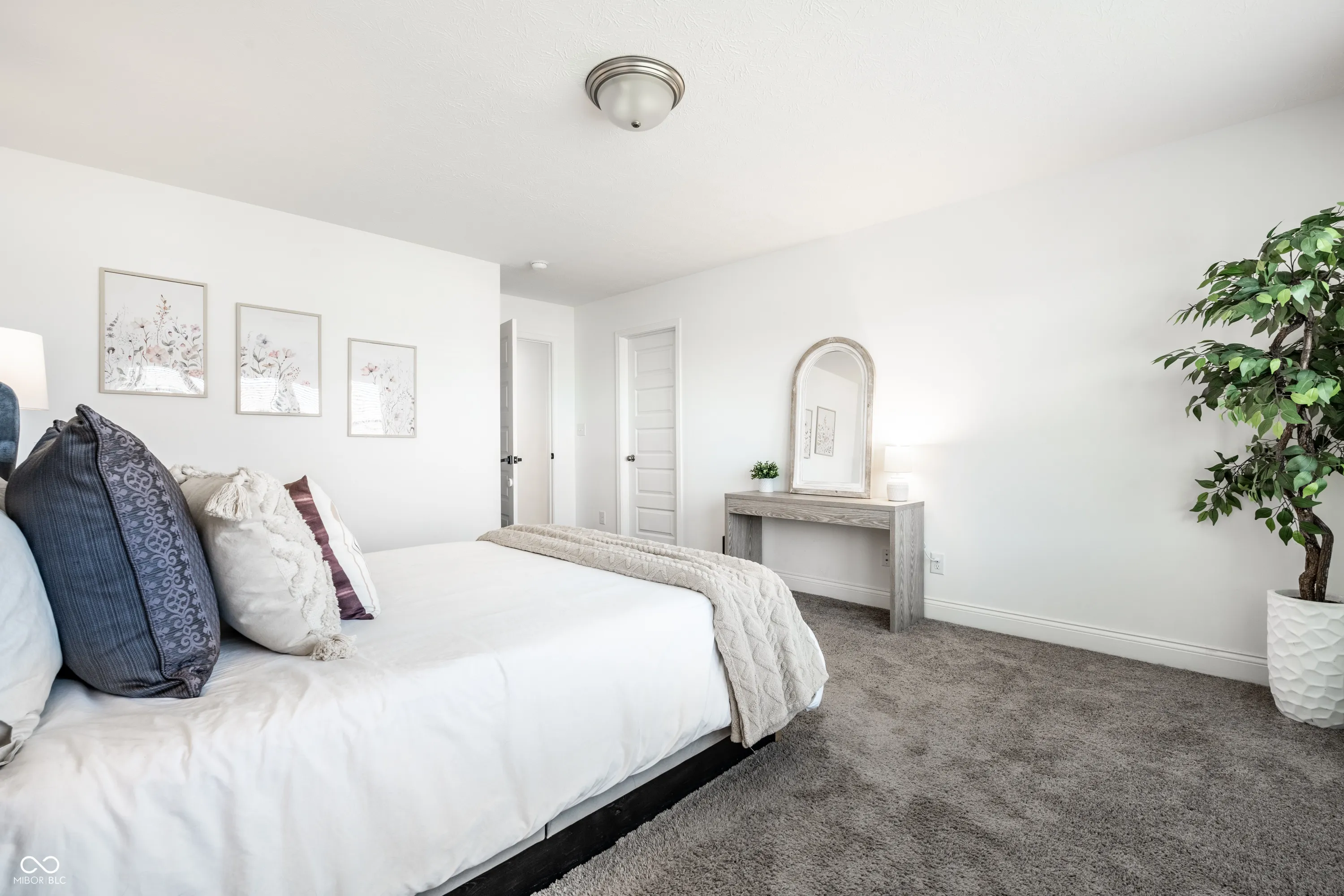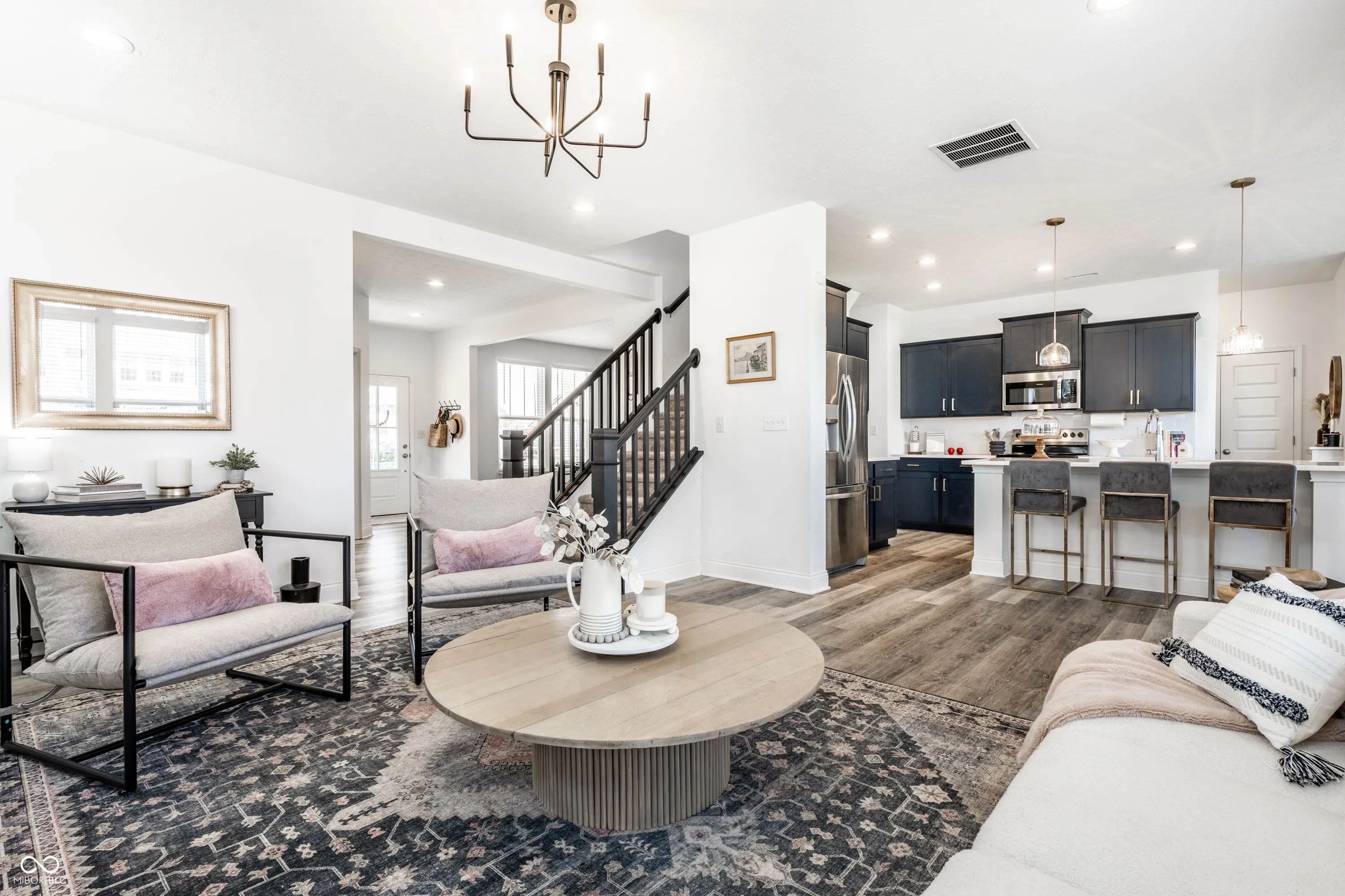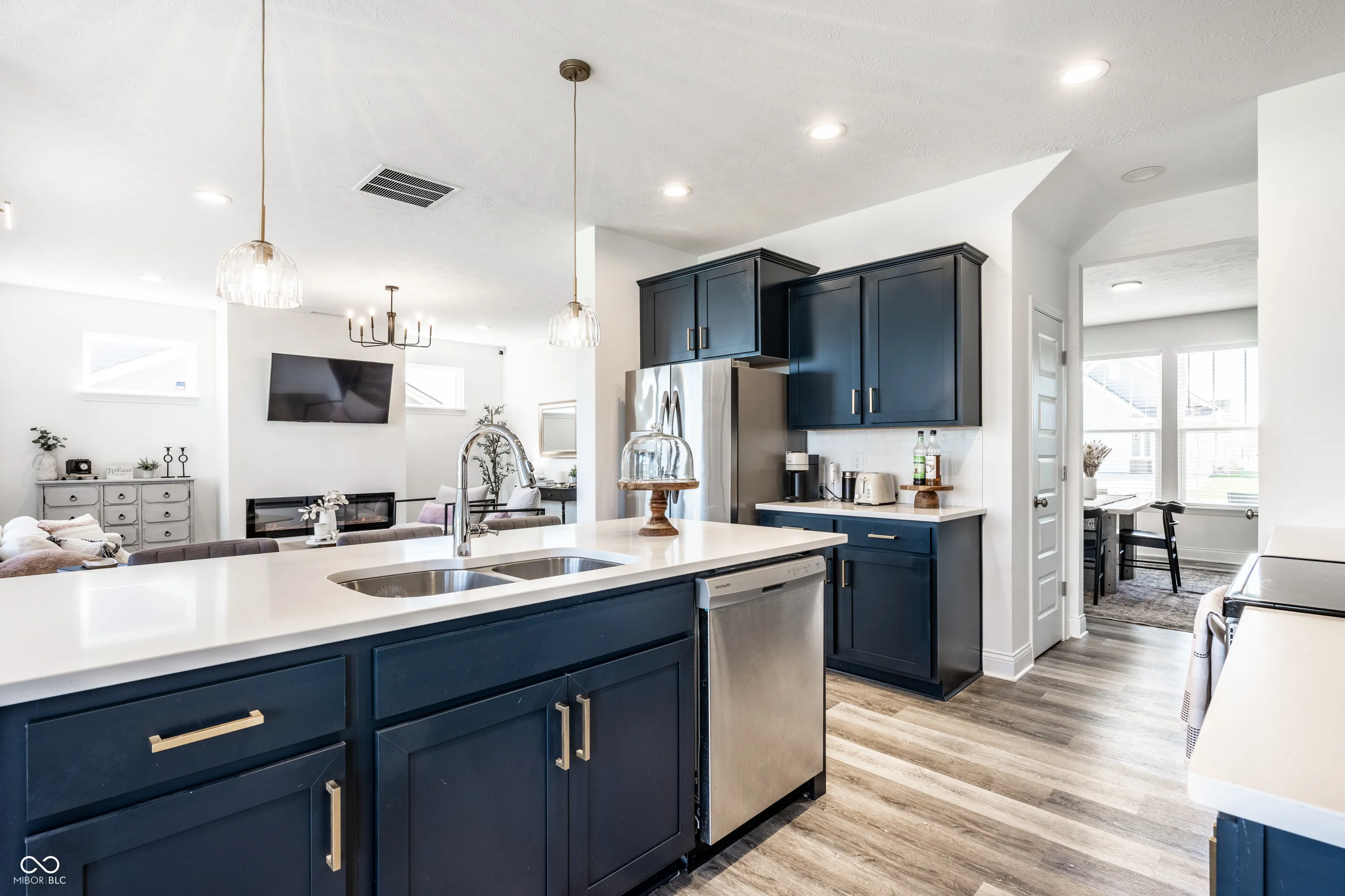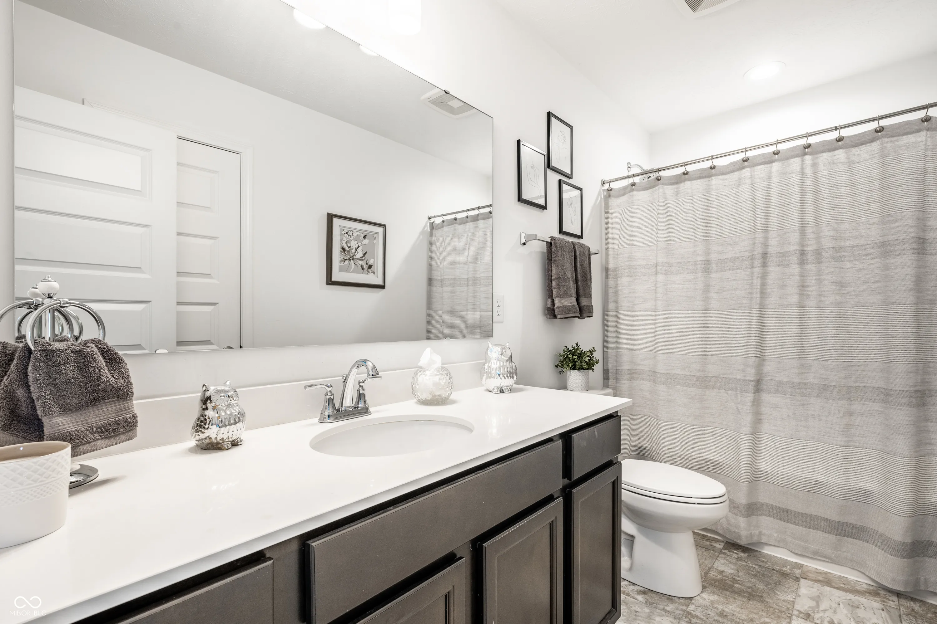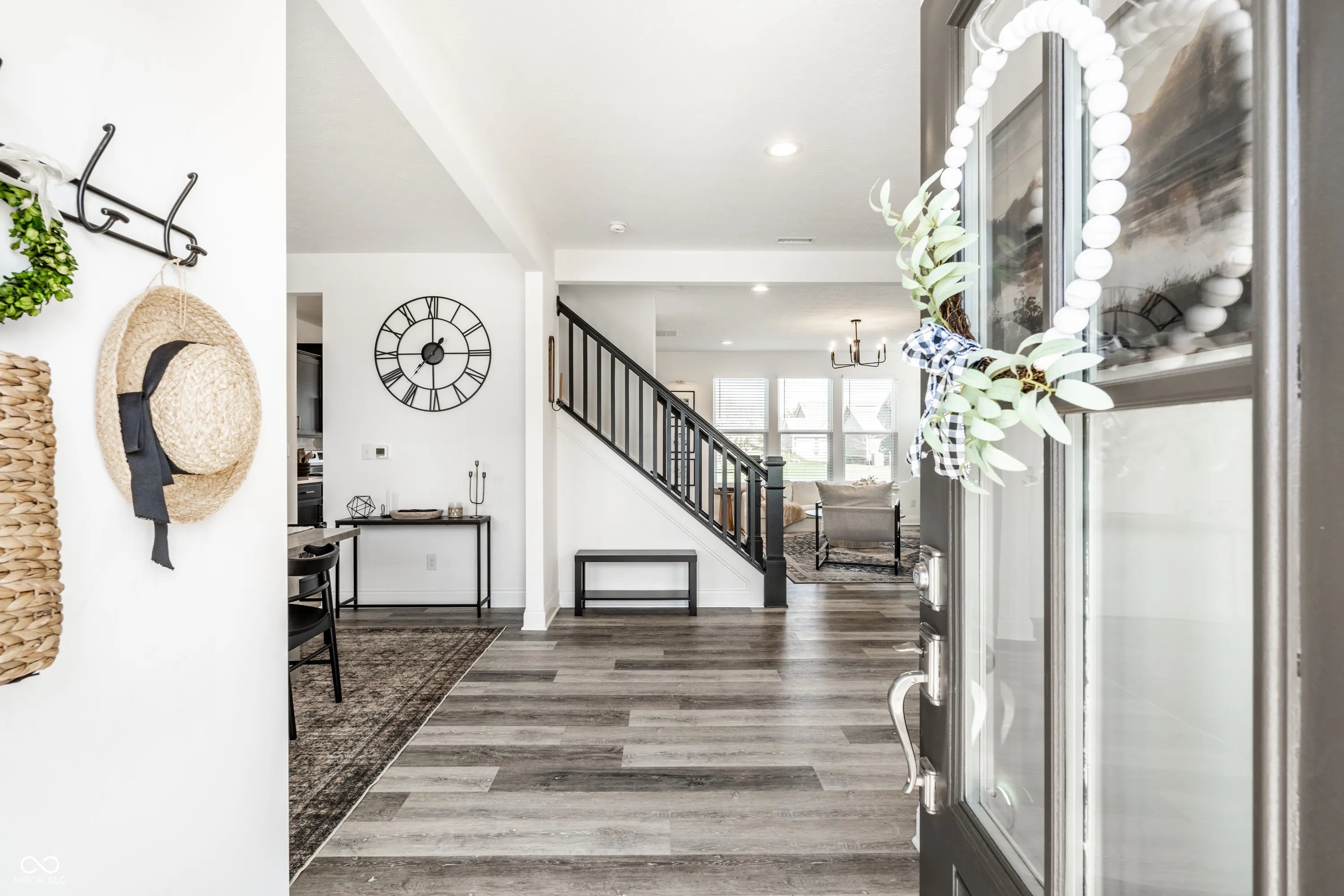 Welcome to this beautifully crafted 2 story home where modern comfort meets timeless charm! Boasting a cozy, inviting covered front and back porch, farmhouse-style elevation and neutral color palette, this home is ready for its next chapter. Step inside the foyer to discover an open-concept layout designed for both everyday living and effortless entertaining. Off the foyer, the formal dining room offers an elegant space for hosting dinners and holiday gatherings and sits across from a versatile flex room, perfect as a private home office, den or guest bedroom. The spacious great room, anchored by a cozy electric fireplace, seamlessly flows into the stunning kitchen where gleaming white granite countertops, bar center island bar seating, stainless steel appliances and not one, but two pantries for ample storage are a chef’s dream. The additional breakfast area opens onto a covered back patio and over a 1/4 acre lot, ideal for morning coffee or evening get-togethers with an adjacent mudroom providing a landing spot to organize bags, coats and shoes after a long day. Upstairs, the spacious primary retreat is bathed in natural light and includes a spa-inspired en suite bathroom with tiled walk-in shower, dual-sink vanity, generous walk-in closet plus linen closet. The dual temperature control and second-floor laundry just steps away add convenience and comfort. In addition to the remaining 3 upstairs bedrooms, a loft offers additional flexible living space, perfect as a playroom, media room or creative studio. As a bonus, the roomy, finished 3-car garage includes an extra rear storage area, perfect for tools, bikes or seasonal items. With its prime location near shops, dining and quick access to Hwy 52 and I-465, this home checks all the boxes!