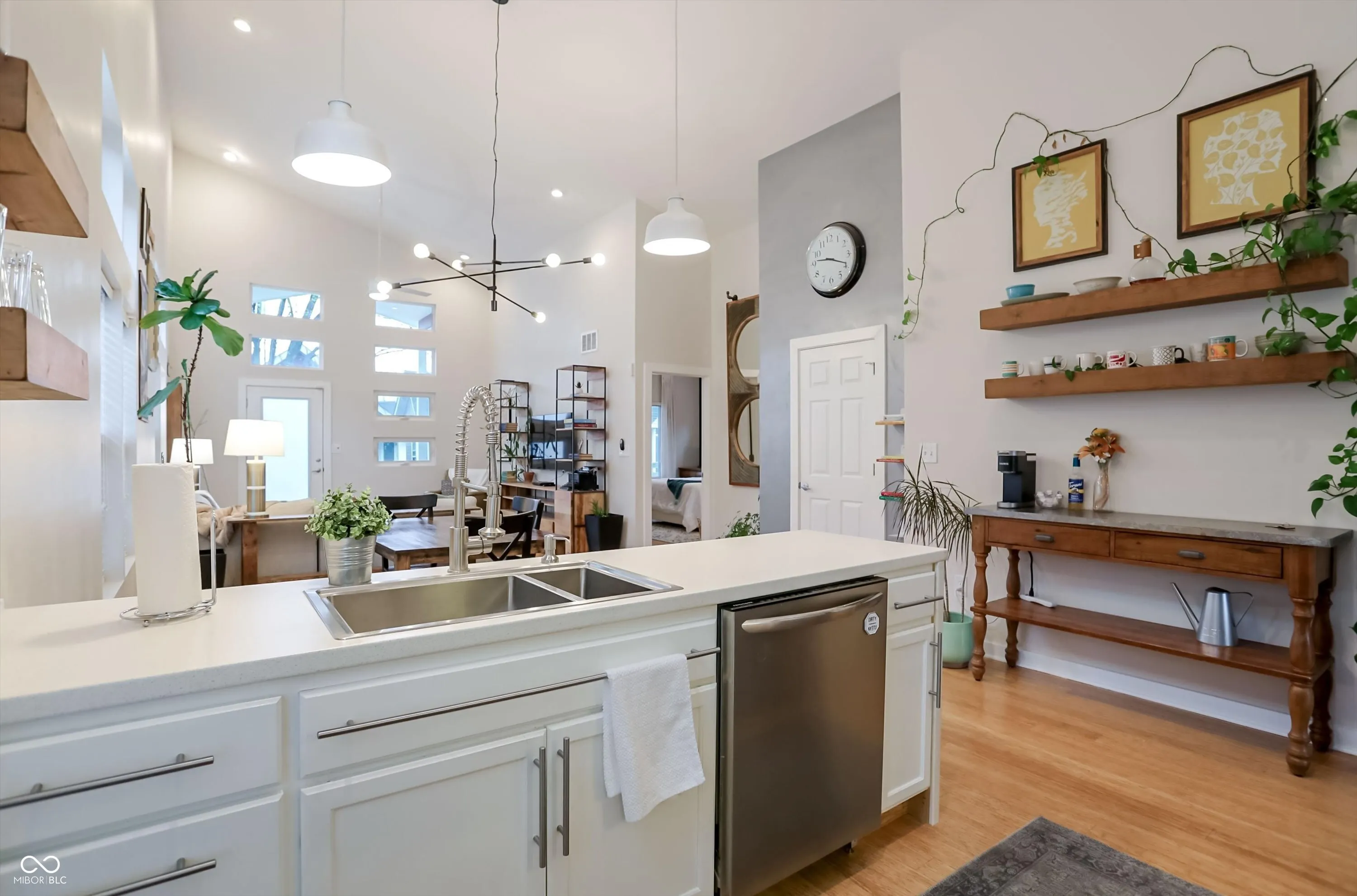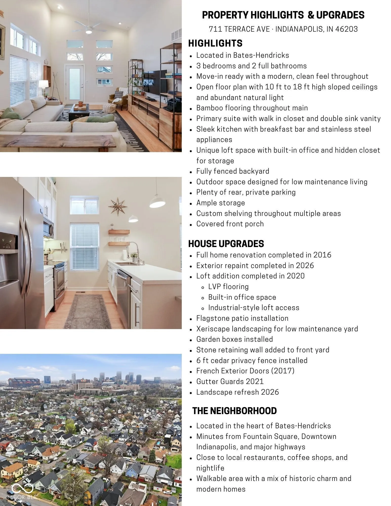 Tucked into the heart of Bates-Hendricks, this is the COOL house you’ve been waiting for! Fully updated in 2016 with a modern clean vibe throughout plus fresh exterior paint (2026). Move-in ready and just minutes from all the spots you’ll love. The large covered front porch sets the tone right away, perfect for slow mornings or winding down at the end of the day. The curb appeal is on point with low maintenance landscaping and a stone retaining wall out front. Inside, you’re welcomed into an open floor plan with soaring ceilings ranging from 10 to 18 feet and an abundance of natural light that gives the space an immediate wow factor and a cool, elevated feel the moment you walk in. Bamboo, hardwood floors run throughout the main floor. Every detail in this home feels intentional. The kitchen is sleek and functional with tall white cabinets, stainless steel appliances, a breakfast bar and added shelving for smart storage. Laundry closet is conveniently located — the washer and dryer stay! Three bedrooms and two full bathrooms, including a primary suite that checks all the boxes with a walk in closet, double sink vanity, tiled floors, and a beautifully tiled shower. Then there’s the loft…added in 2020, this loft is a fun, tucked-away feature with a bit of edge. Finished with LVP flooring and built-in office space, it’s accessed by industrial-style hand bars that give it that modern, unexpected feel. It’s the perfect little creative escape, complete with a hidden closet up top. The backyard is a vibe. Fully fenced with a 6 ft cedar fence, it’s been thoughtfully designed with a flagstone patio, garden boxes, and xeriscape landscaping so you get all the style without the maintenance. There’s also rear gravel parking with ample space. Modern, stylish, and in one of Indy’s most loved neighborhoods, this one just hits different. What do you think? Are you cool enough to live here?