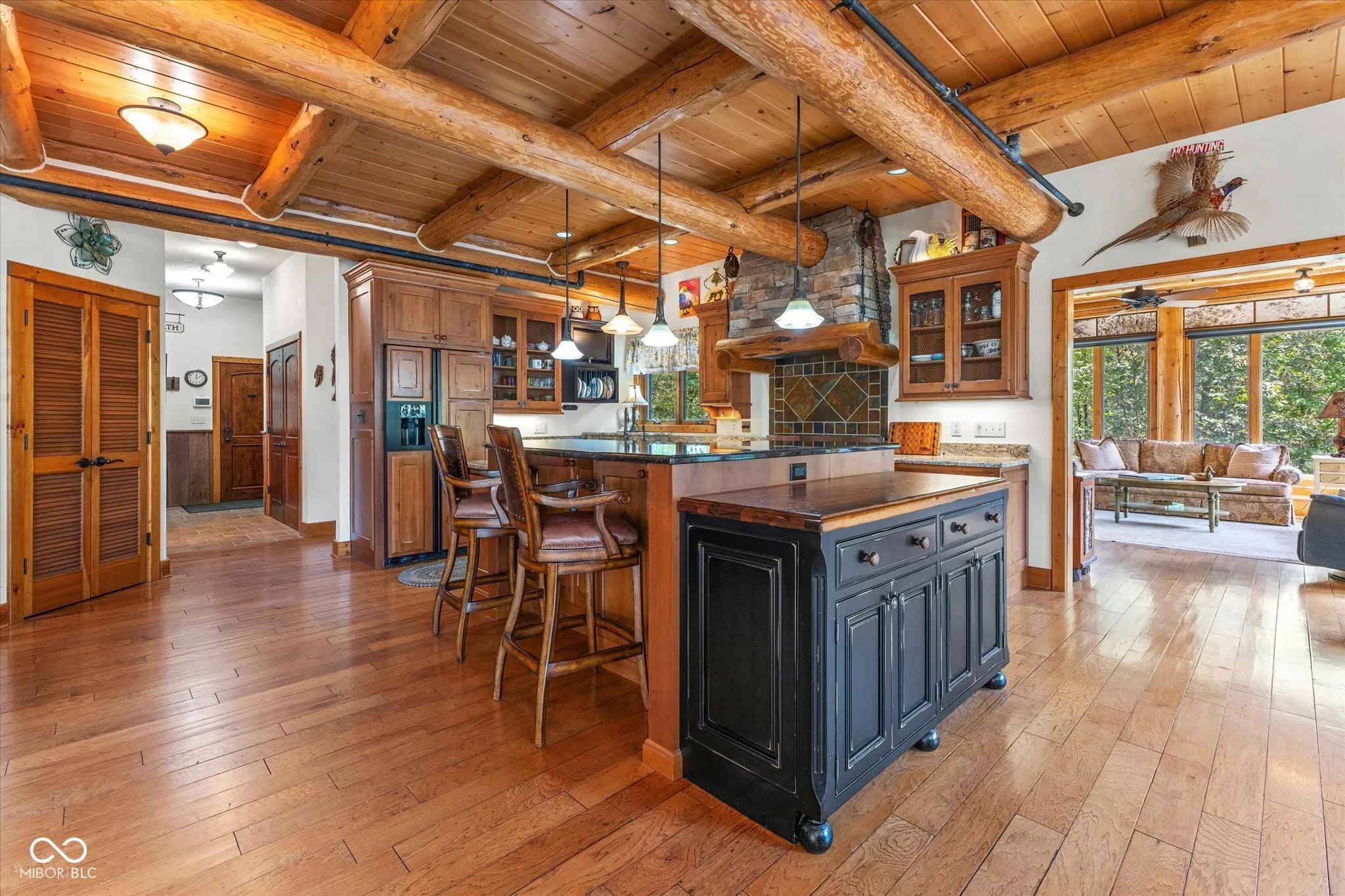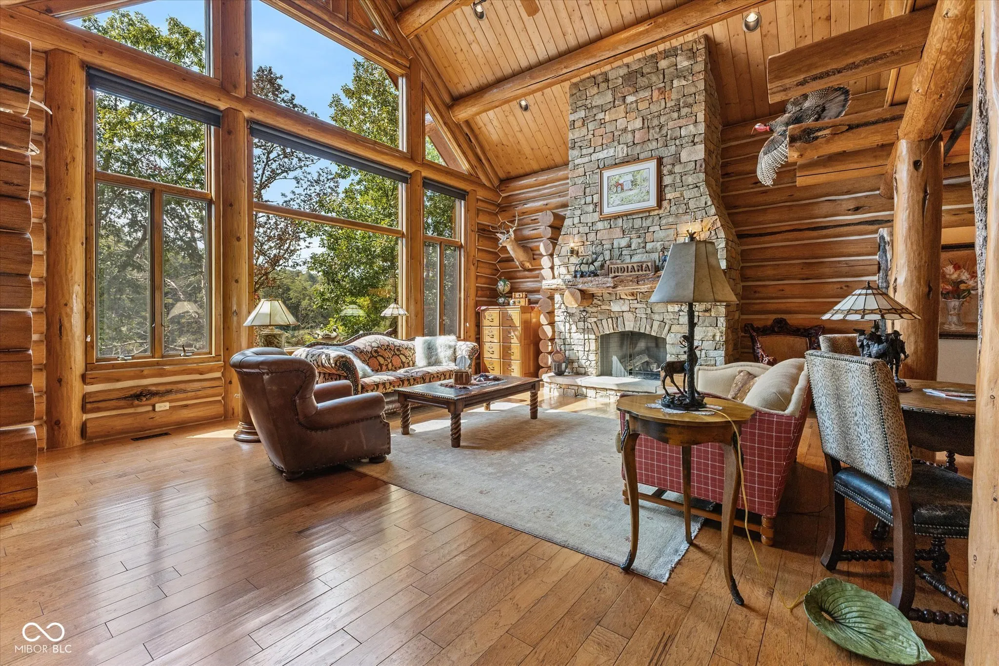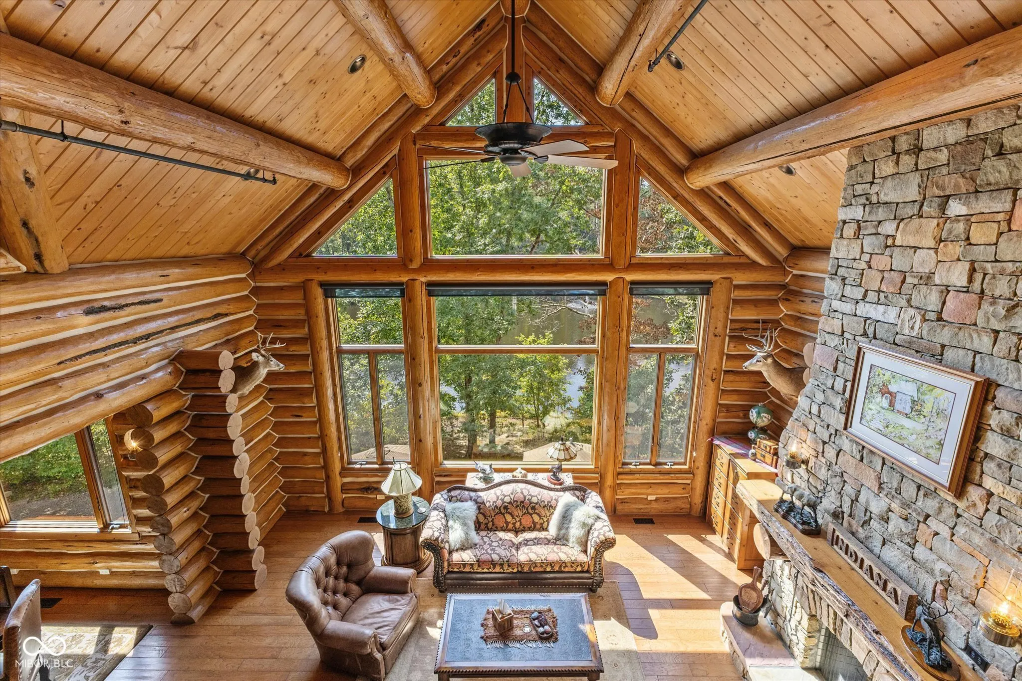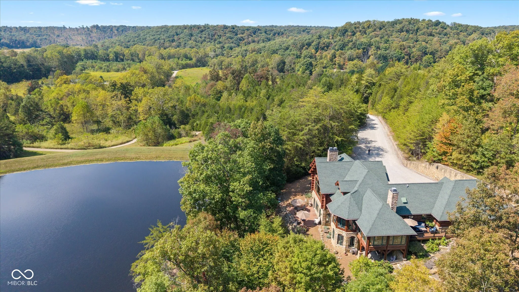 Private, Brown County Custom log home w/3bed/3.5bath, 3 car garage—-Tony Stewart toured this log home before his was built! Includes 9 parcels totaling roughly 222 acres with 3 bed/2 bath, 2 car, brick ranch home, large barn, fenced in garden, private lake, ATV/walking trails, private drive, wild flower fields & more. Amazing views from anywhere in the home! Sunroom has gas fireplace, access to Trex patio, views of side garden & lake. The upstairs loft will not disappoint, you will feel like you are in a tree house. The primary suite has its own breathtaking views of the land and lake, a large cedar closet and private bath featuring double sinks, raised counters, R/O water access, heated floors, custom walk-in shower with rainfall showerhead. The great room is the heart of the home w/cathedral ceiling, floor-to-ceiling stone fireplace & view of Lake Victoria. Lake has a dock-for fishing or attaching your trolling boat/kayak/canoe, lighted fountain, aerators & beautiful views of the log home. Kitchen has gas WOLF range, microwave blt into island, warming drawer, large 2 tiered island, walk-in pantry, room for barstools, a wet bar with more counter space and copper sink. Laundry room w/additional refrigerator, upright freezer, storage closet, washer, dryer, sink, etc. 3 car garage has pull through bay, built-in dog wash, 2 service doors, plenty of shelving. Walkout basement with heated, stained concrete floors, 2 full baths-one with a claw foot tub and stained glass transom window plus 2 additional bedrooms. Basement office has plenty of natural light & turret sitting area with access to full bath. Storage room has floor-to-ceiling shelves for all of your keepsakes or holiday items. Home has a generator, drive alert down by the guest house drive, potting shed area under sunroom, stamped concrete patio off of basement, stone lined walkway to lake, amazing terraced flower beds, newer roof. Ranch guest house has new LVP flooring throughout, new water heater.