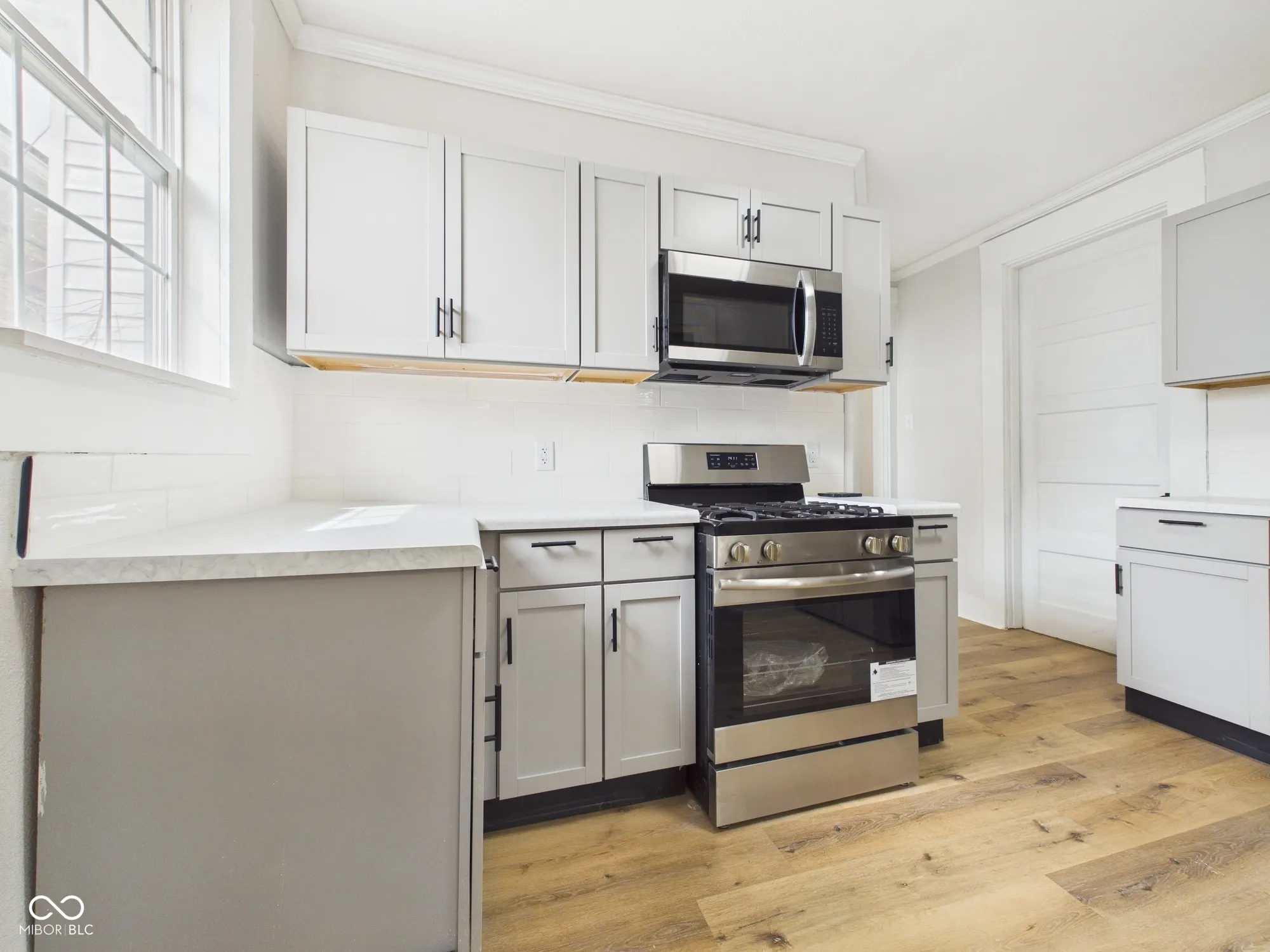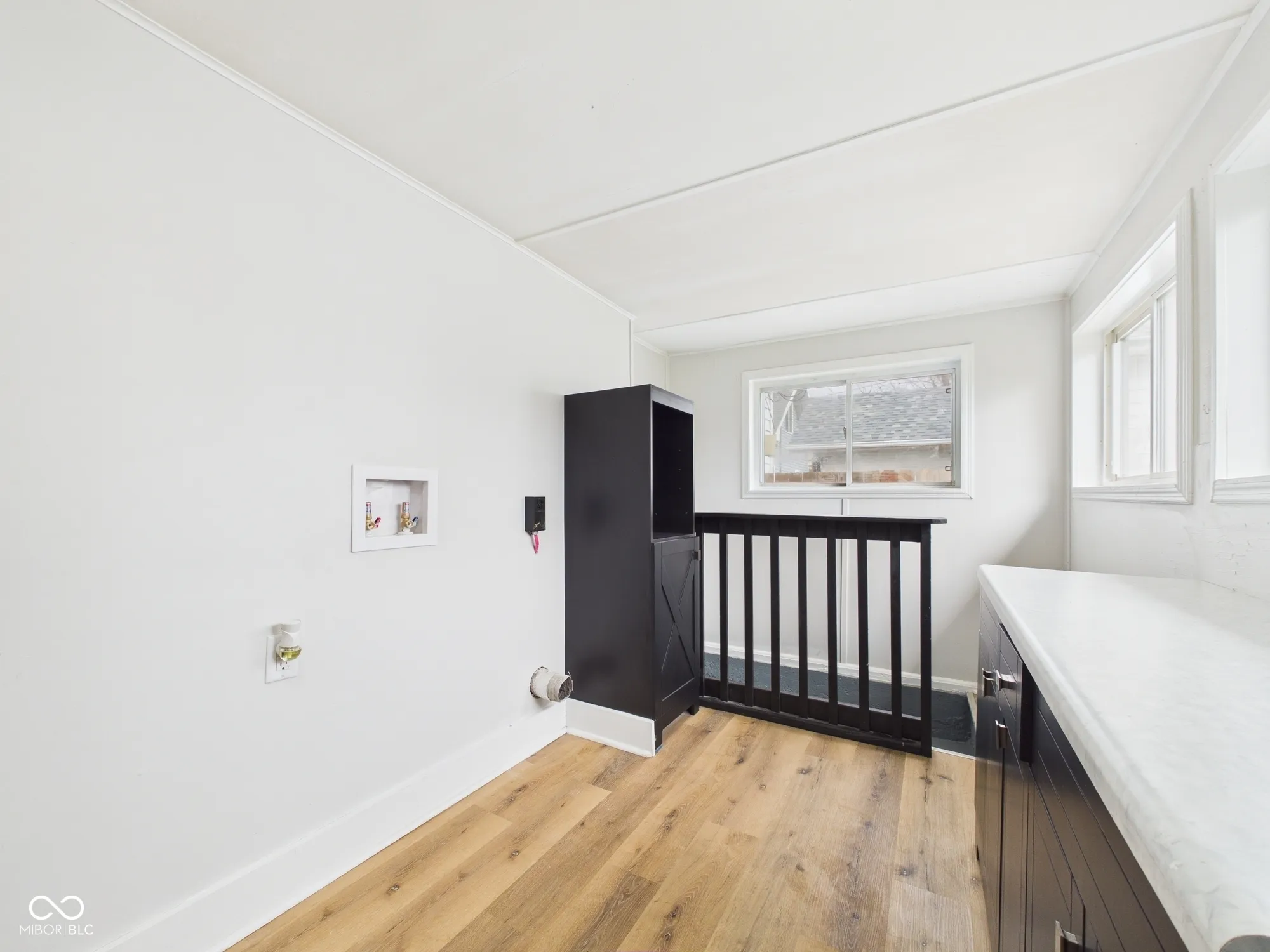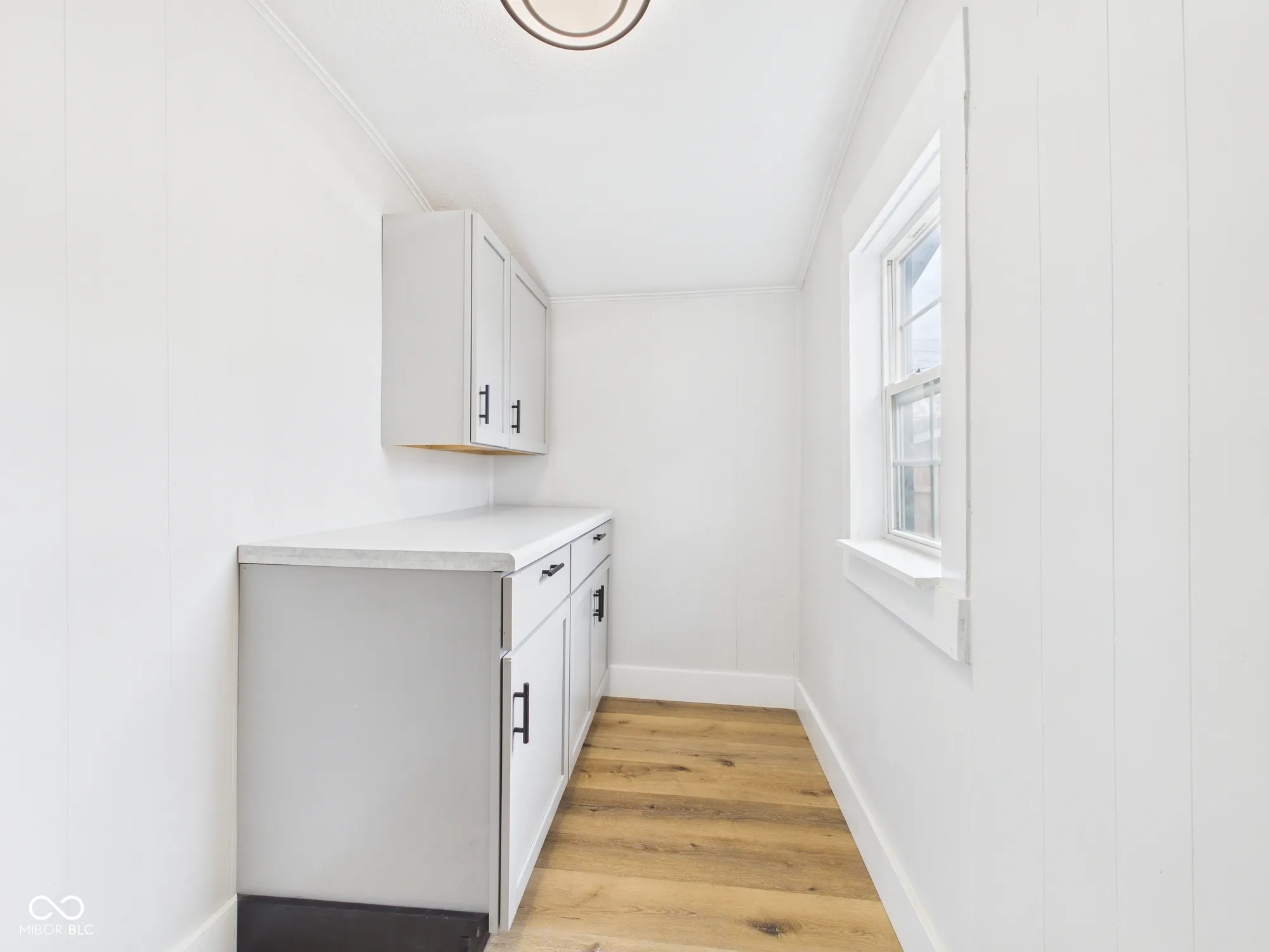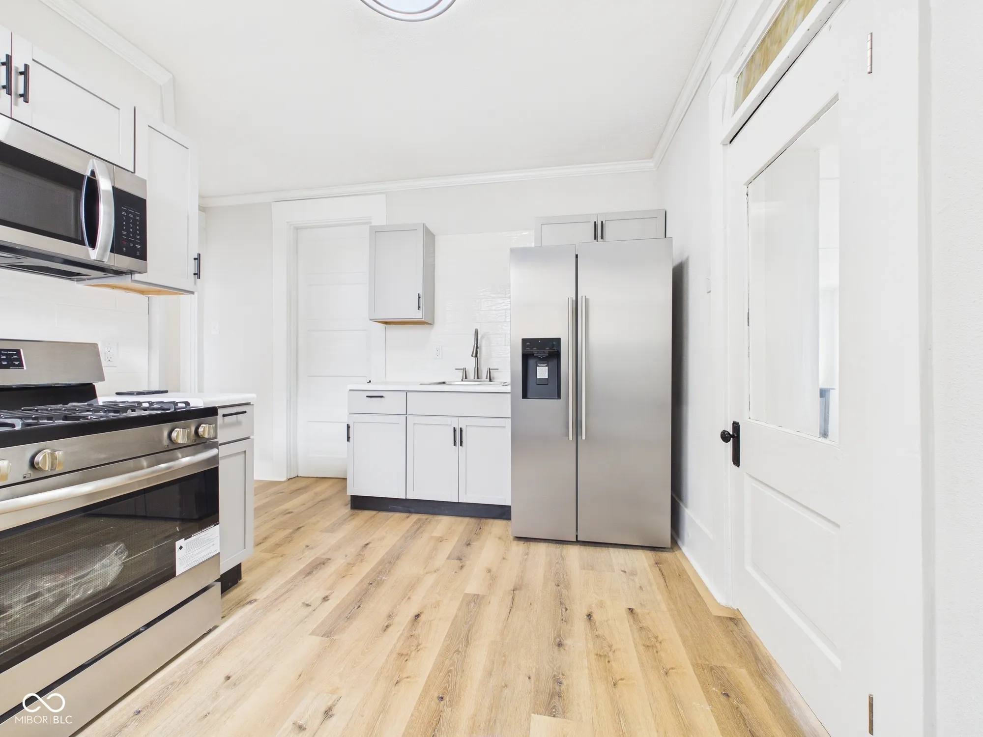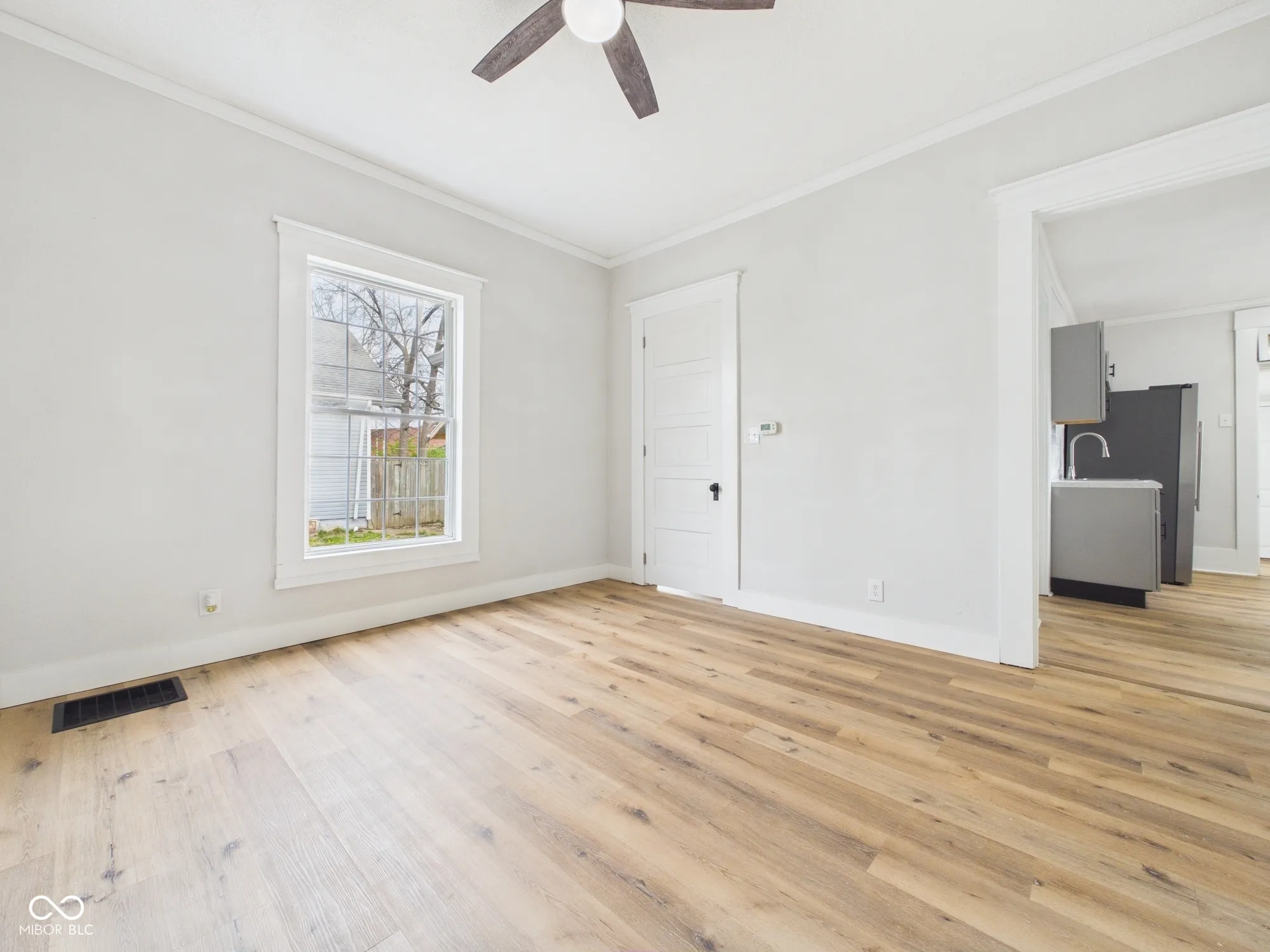 This beautifully updated one-story home offers a perfect blend of charm and modern convenience. A spacious front porch welcomes you in, setting the tone for the inviting interior. Inside, a foyer-style entrance opens into a large, versatile room with updated flooring-ideal for use as a formal dining area or additional living space. The home features a generously sized, carpeted living room, perfect for relaxing or entertaining, along with two spacious bedrooms that provide comfort and flexibility. The updated bathroom showcases a stylish, partially tiled shower, adding a touch of modern elegance. The kitchen has been thoughtfully renovated with modern finishes, including updated cabinetry and sleek stainless-steel appliances, making it both functional and visually appealing. Additional highlights include a dedicated pantry room for extra storage, a large mud/laundry area for everyday convenience, and a basement offering even more storage space. Outside, you’ll find a large fenced-in backyard, perfect for outdoor activities, along with a detached garage for added functionality. This home truly combines thoughtful updates with practical living spaces throughout.