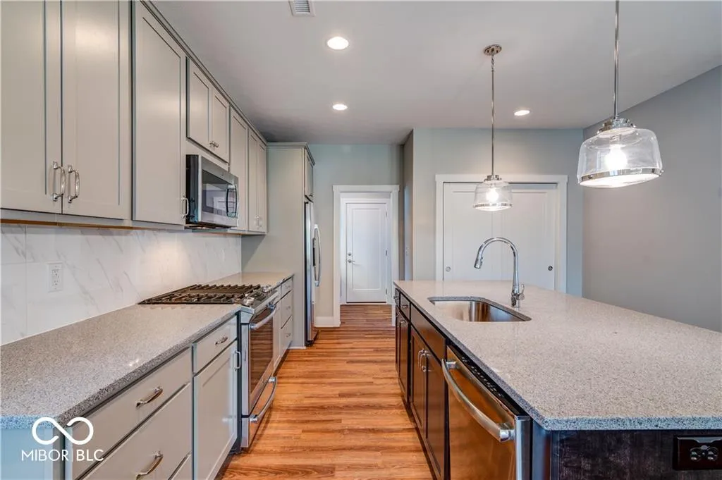 Welcome to Sunrise on the Monon, built by Old Town Design Group! This home features a contemporary design offering 3 beds, 2.5 baths, and primary ensuite on the main level! Oversized windows throughout offer an abundance of natural light. LVP flooring, gas fireplace, stainless appliances including Cafe refrigerator with built in Keurig, gas range and dishwasher replaced in 2025. Aristokraft soft close cabinetry, granite countertops in kitchen | bathrooms, and a large island! Other features include built-in surround sound, irrigation and security systems, Tesla wall mount charger in the garage, and high efficiency HVAC. Primary bedroom offers dual vanities, a large walk-in closet with built-in shelving, and a ceramic tiled shower. Open floorplan and large covered porch are great for entertaining! Exterior stain and paint in 2025. This community is located on the Monon Trail; just minutes from Midtown Carmel, Fashion Mall, and interstate access. Truly a prime location and move-in ready!
