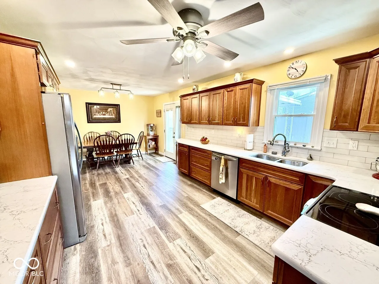 Solid brick ranch offering 3 bedrooms and 2 fully updated Onyx bathrooms. This move-in ready home has been recently remodeled throughout, including newer triple pane vinyl windows, roof, water heater, paint, and luxury vinyl plank/carpet flooring. The beautifully updated kitchen features quartz countertops, cabinetry by Inspired Design, and stainless steel appliances. The backyard is fully fenced with vinyl privacy fencing and additional chain link-perfect for kids and pets-plus a large shed for extra storage. Enjoy peace of mind with a whole-house Generac generator. Part of the garage is currently used as an office but can easily be converted back to a full 2-car garage. Relax or entertain on the covered patio-ideal for summer cookouts. Don’t miss this one!
