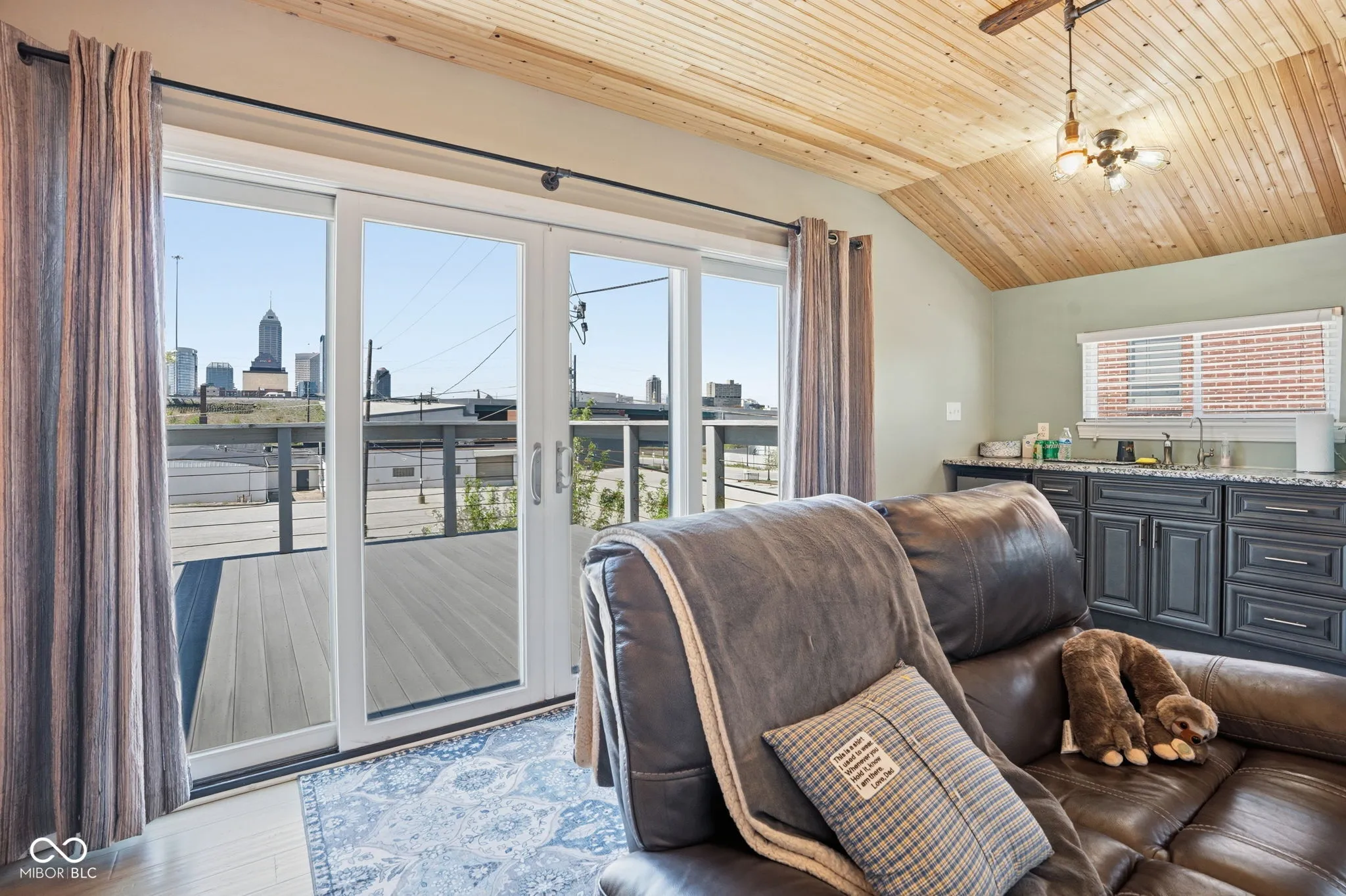 Situated in the desirable Holy Cross neighborhood, this distinguished single family residence presents an attractive property in great condition. The living room offers an atmosphere of grandeur and comfort, featuring both a high ceiling and a vaulted ceiling that elevate the sense of spaciousness. A welcoming fireplace provides a central point of relaxation, complemented by the distinctive textures of a wood ceiling and an inviting wood wall, crafting an environment of unique appeal. Culinary aspirations find their setting within the thoughtfully appointed kitchen, where stone countertops provide a sophisticated surface for preparation. A prominent large kitchen island serves as an ideal gathering point, further enhanced by a practical kitchen bar and an appealing backsplash that contributes to the room’s refined aesthetic. One of the two full bathrooms presents a luxurious tiled walk in shower, offering a refreshing and refined bathing experience. The second floor offers uncompromised views of the downtown Indianapolis skyline from the rooftop deck off of the den. The den has large glass door that offer the same view. This residence encompasses three bedrooms, alongside two full bathrooms and one half bathroom, providing practical arrangements across its two stories. A generous walk-in closet offers extensive storage possibilities. A dedicated laundry room simplifies daily routines. Outdoors, a private fenced backyard awaits, featuring both a deck and a patio, perfect for an outdoor dining area. The oversized garage has a convenient half-bathroom. This property represents an exceptional opportunity for sophisticated living within a historical framework close to popular Highland Park.