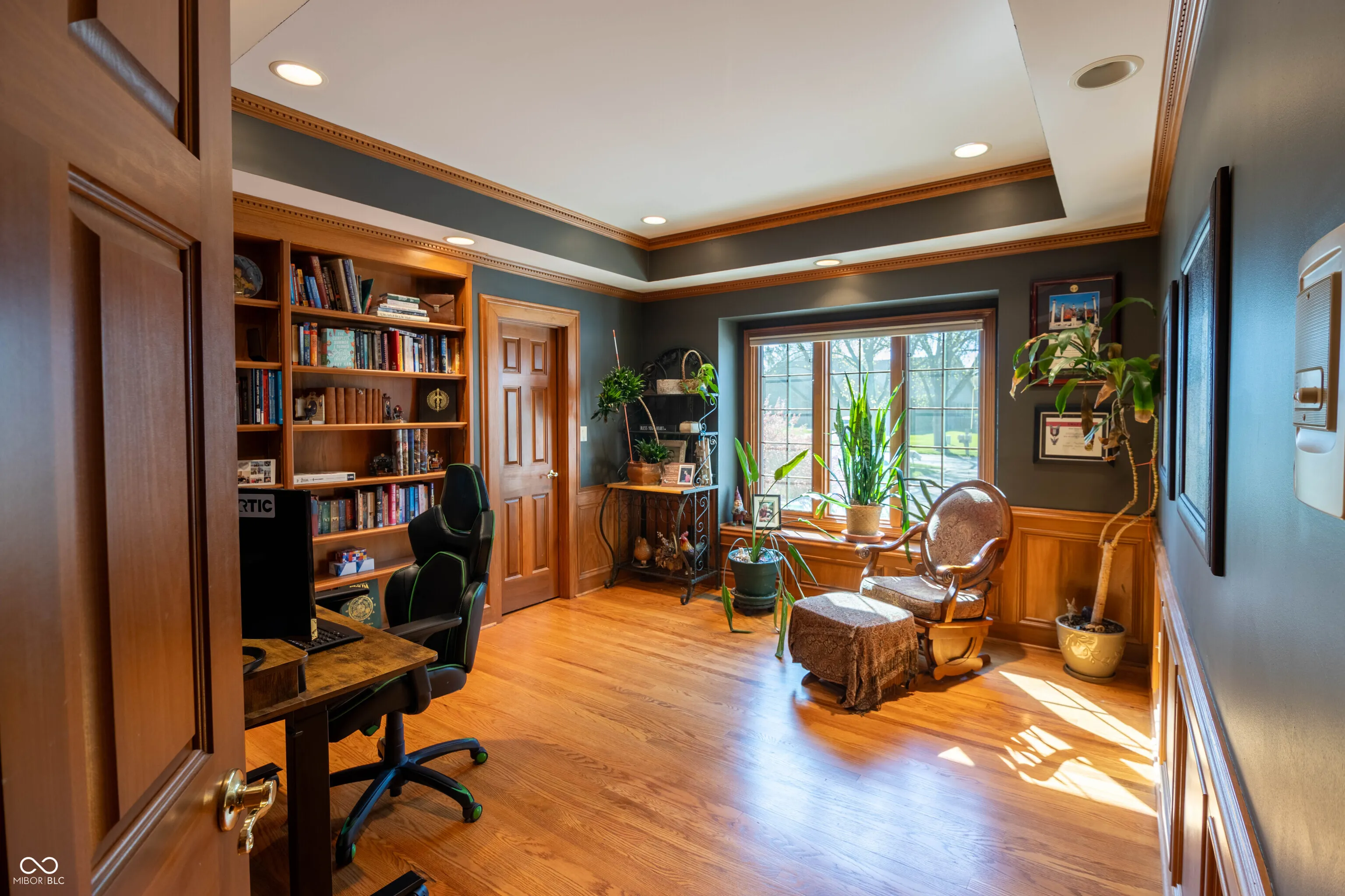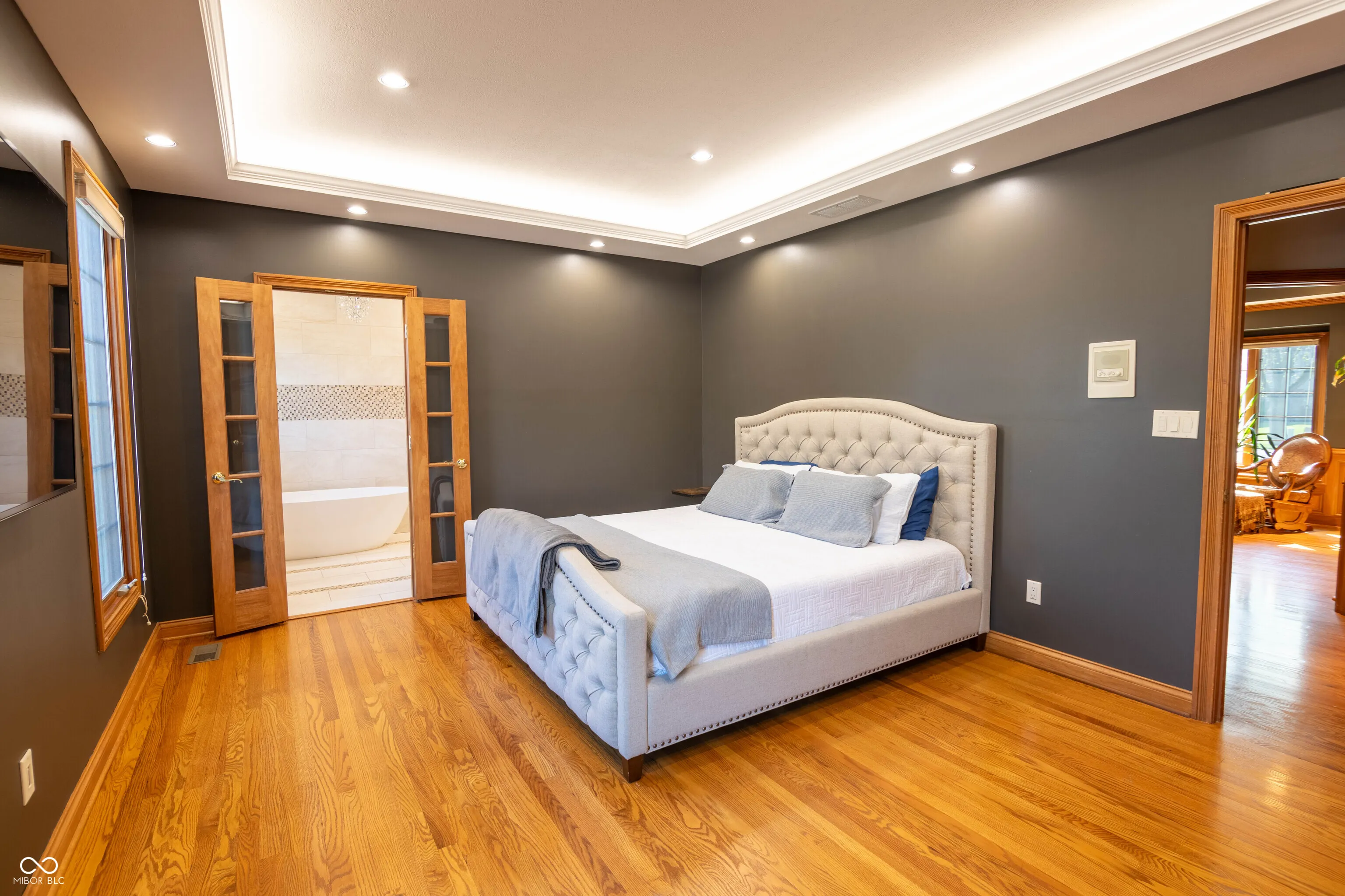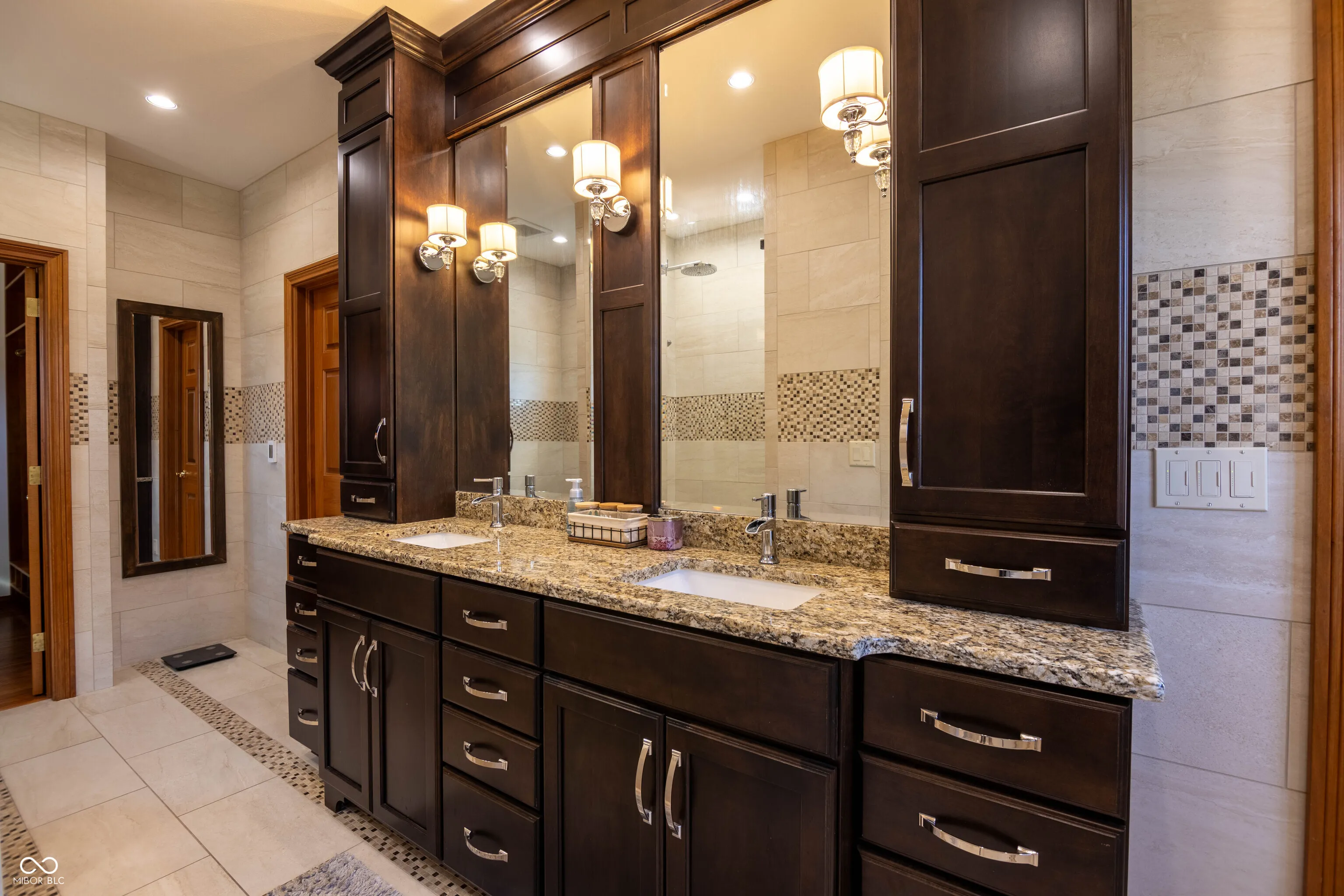 Stunning custom home in Eagle Trace offering over 5,300 SF of living space with 5 bedrooms, 4.5 baths, office, den, home theater, exercise room, and 3-car garage. The backyard is a private retreat featuring a 32×14 heated fiberglass pool, custom concrete and pavers, water feature, professional landscaping, and wrought-iron fenced yard. Gourmet kitchen with Wolf/Sub-Zero appliances, custom cabinetry with glass fronts and lighting, granite countertops, heated floors, and walk-in pantry. Main-level primary suite includes hardwood floors, tray ceiling, dual walk-in closets with custom organizers, and spa-like bath with heated floors, garden tub, walk-in shower, and dual vanities. Upstairs features a second primary suite with ensuite bath, two additional bedrooms with walk-in closets, Jack-and-Jill bath with dual vanities and heated floors, plus a den with built-ins. Finished basement (~2,200 SF) includes rec room, bonus room, theater room, exercise room with sauna, 5th bedroom, and full bath. Basement includes French drain and dual sump pumps with battery backups. Updates: Roof (2016), Windows (2019), Main HVAC (2022), Water Heater (2022), Upstairs HVAC (2023), Water Softener (2023), Pool Heater (2023).