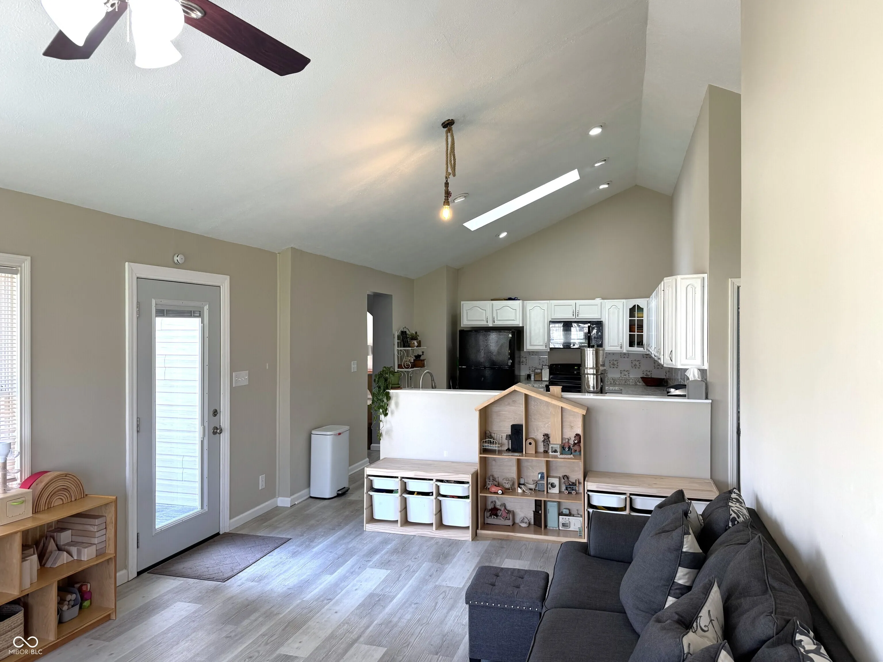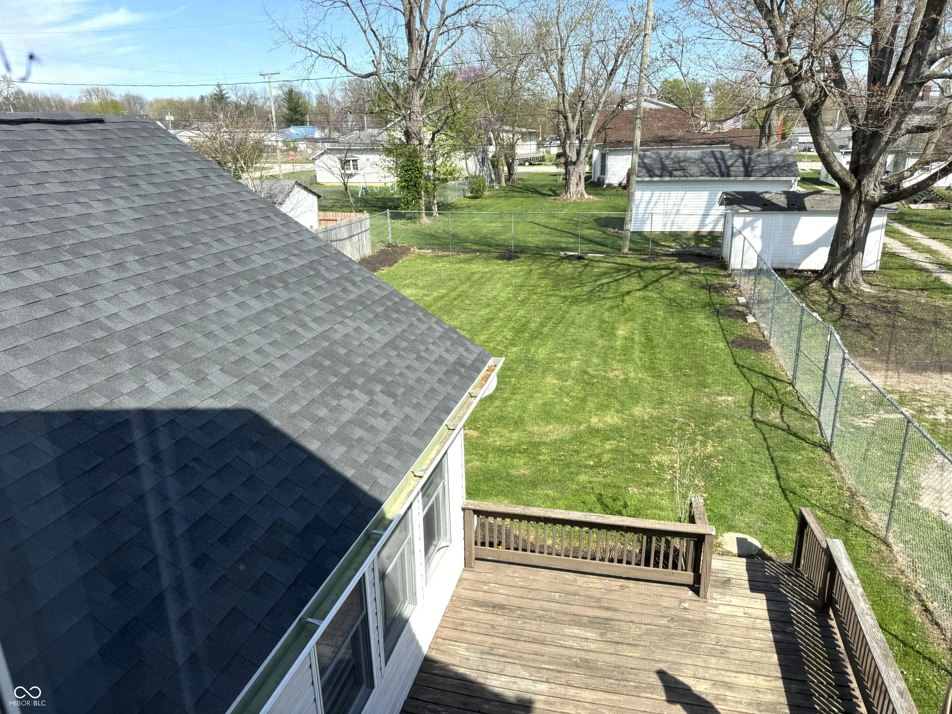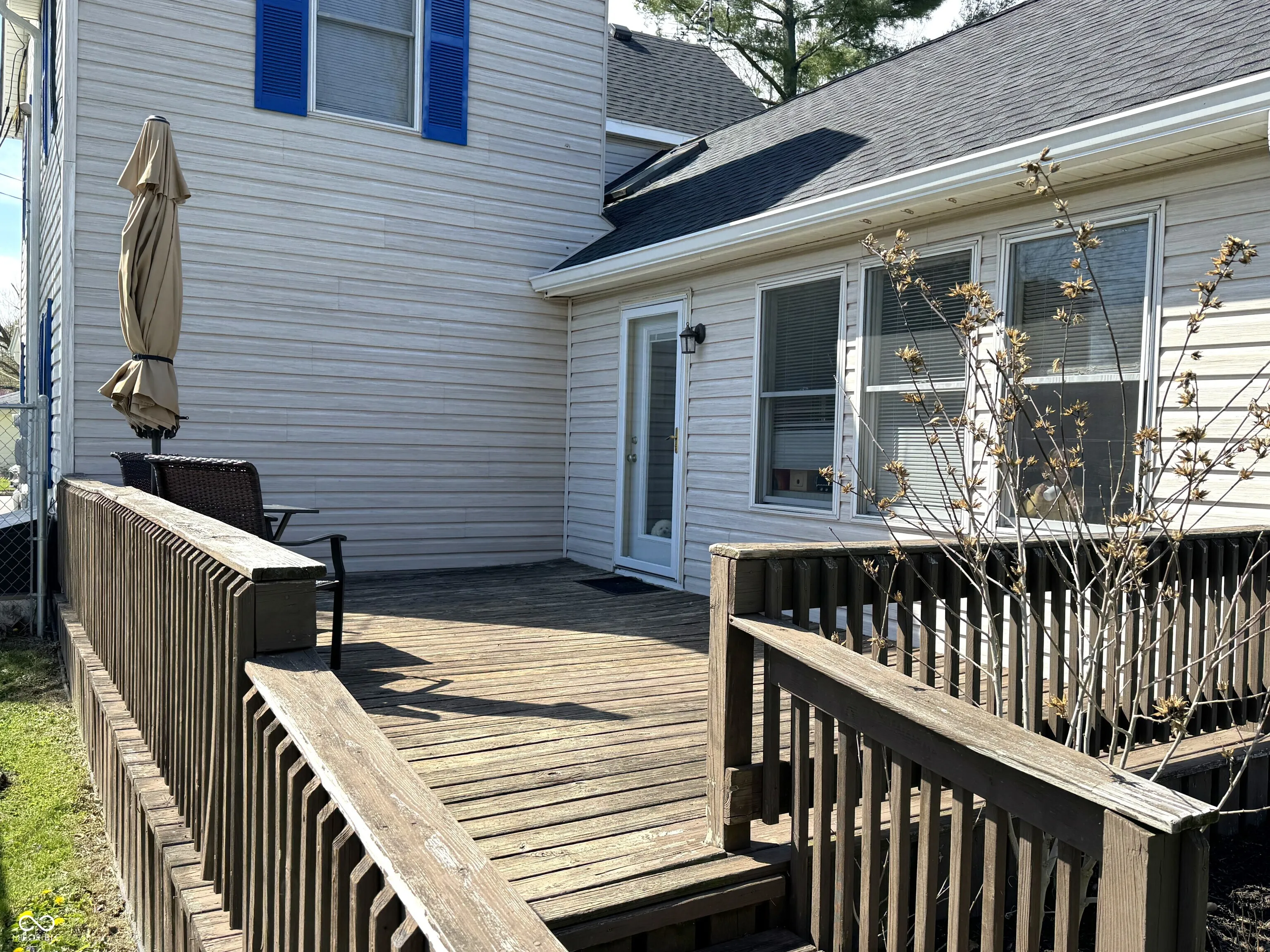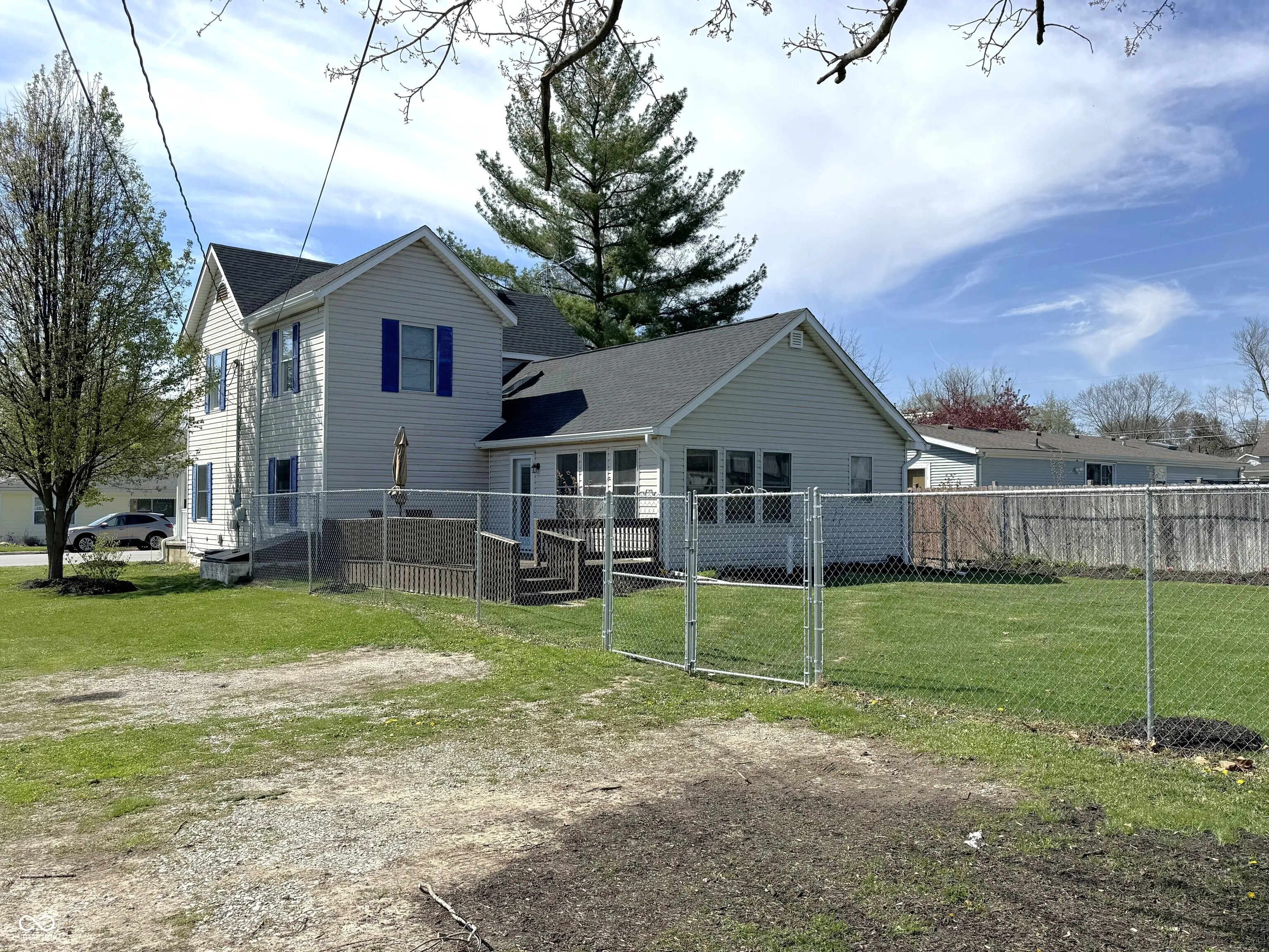 Spacious two-story home in Ladoga with over 2,600 square feet of living space on a quarter-acre lot with mature trees. The main level features a living room with an electric fireplace, a formal dining room, a skylight-lit kitchen with newer appliances (including a one-year-old dishwasher), and a sunroom that adds flexible living or entertaining space. Vaulted and high ceilings throughout give the home an open, airy feel. A main-level laundry room with a two-year-old washer and dryer, plus a full bath with double vanity and a half bath, round out the first floor. Upstairs, three generously sized bedrooms offer plenty of room to spread out. Recent updates include new vinyl plank flooring, and the roof is just two years old. Outside, enjoy a covered front porch, a large wood deck, and a fully fenced backyard. The unfinished basement provides additional storage. Ladoga Elementary (rated 9/10) and new Ladoga playground are a short walk away.