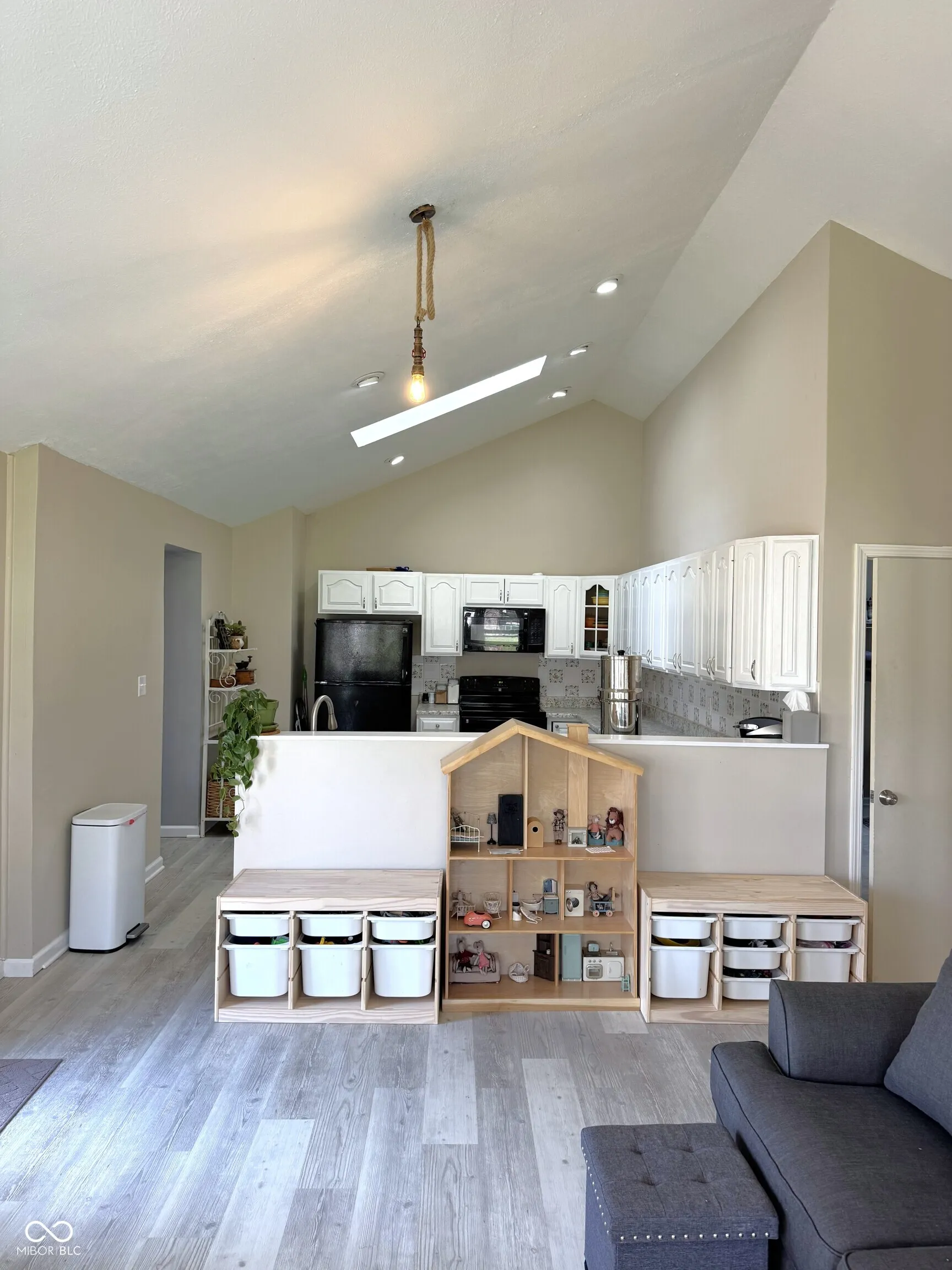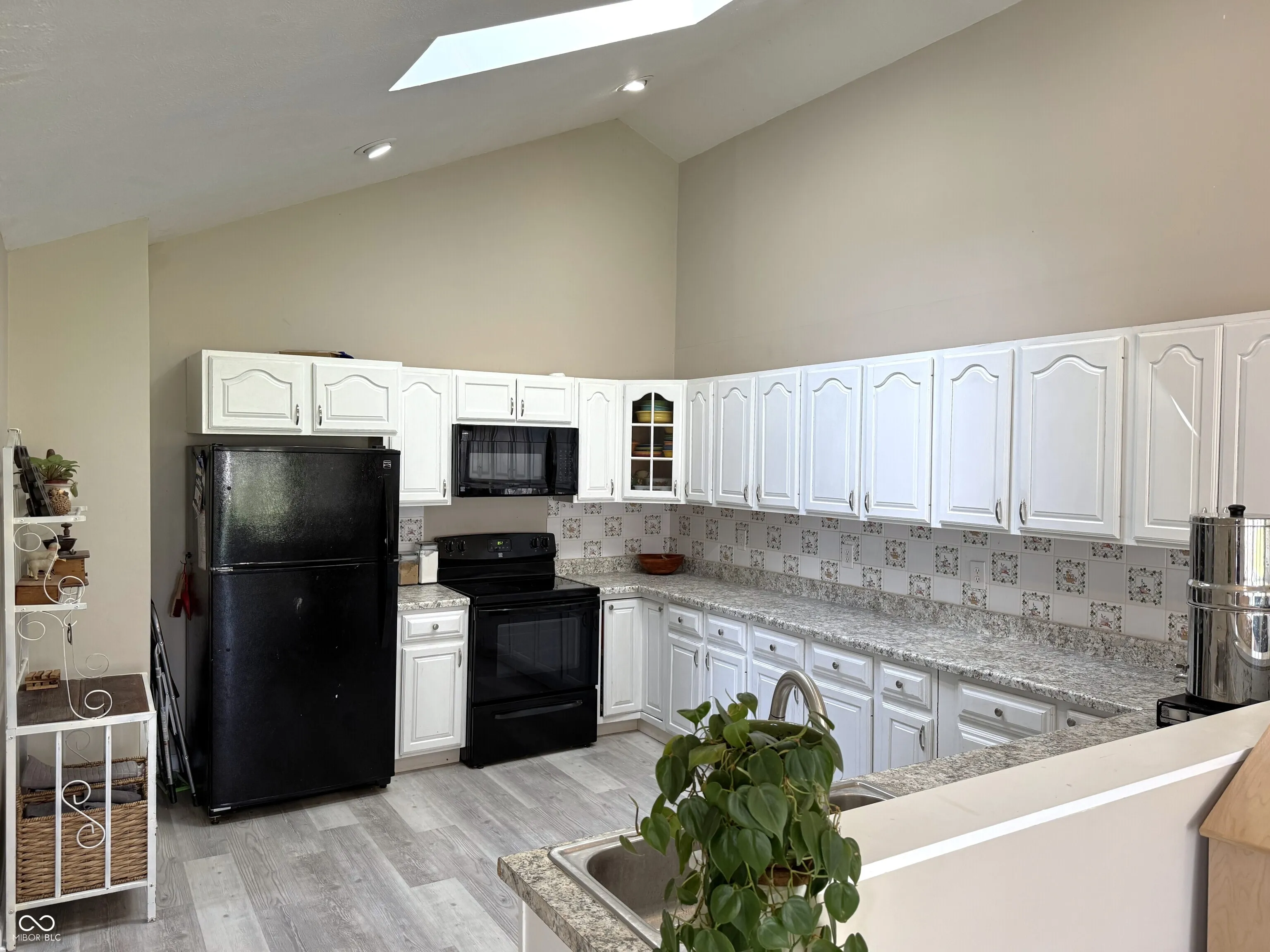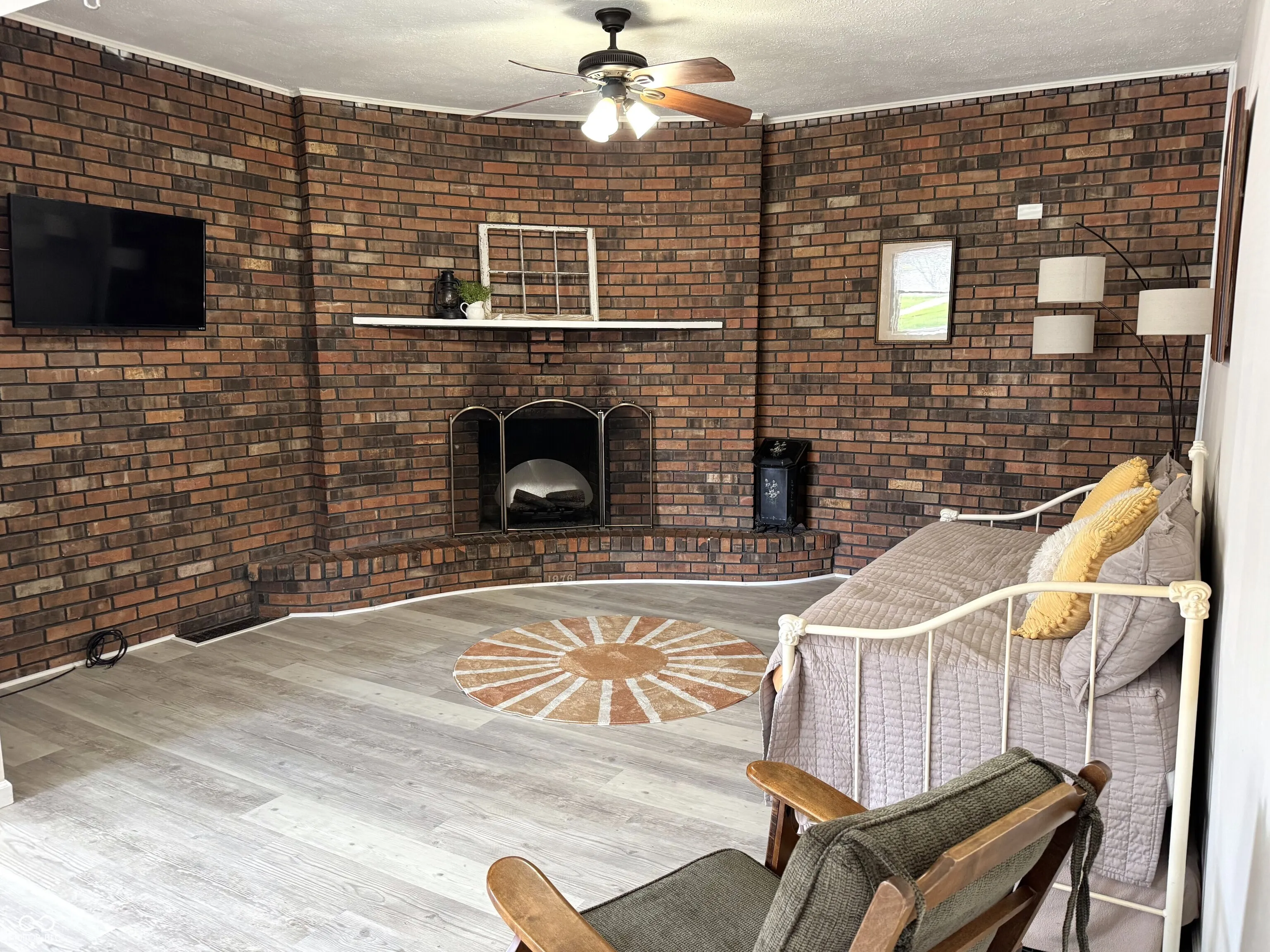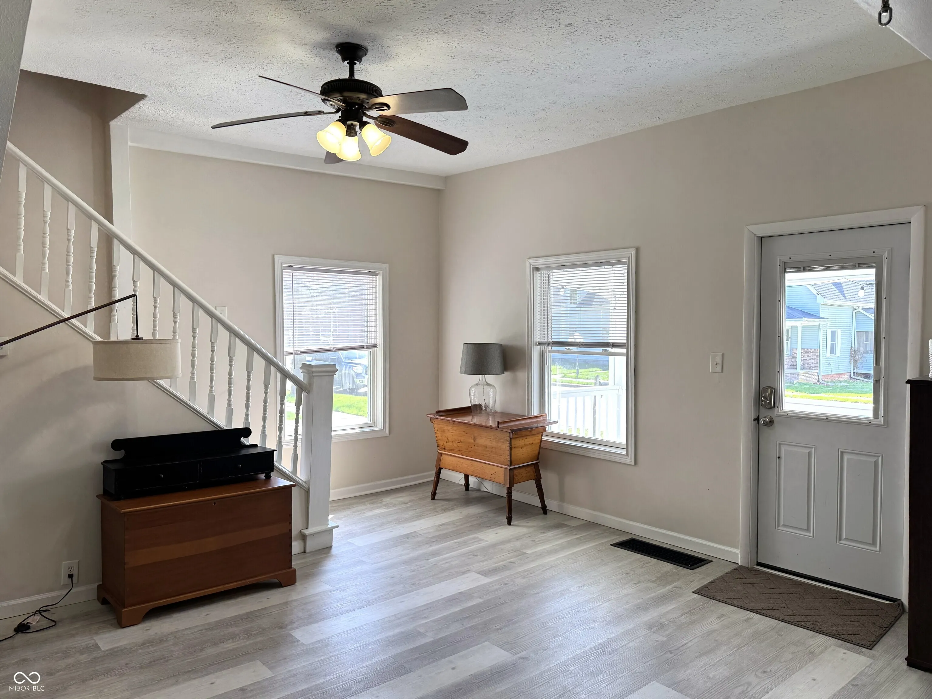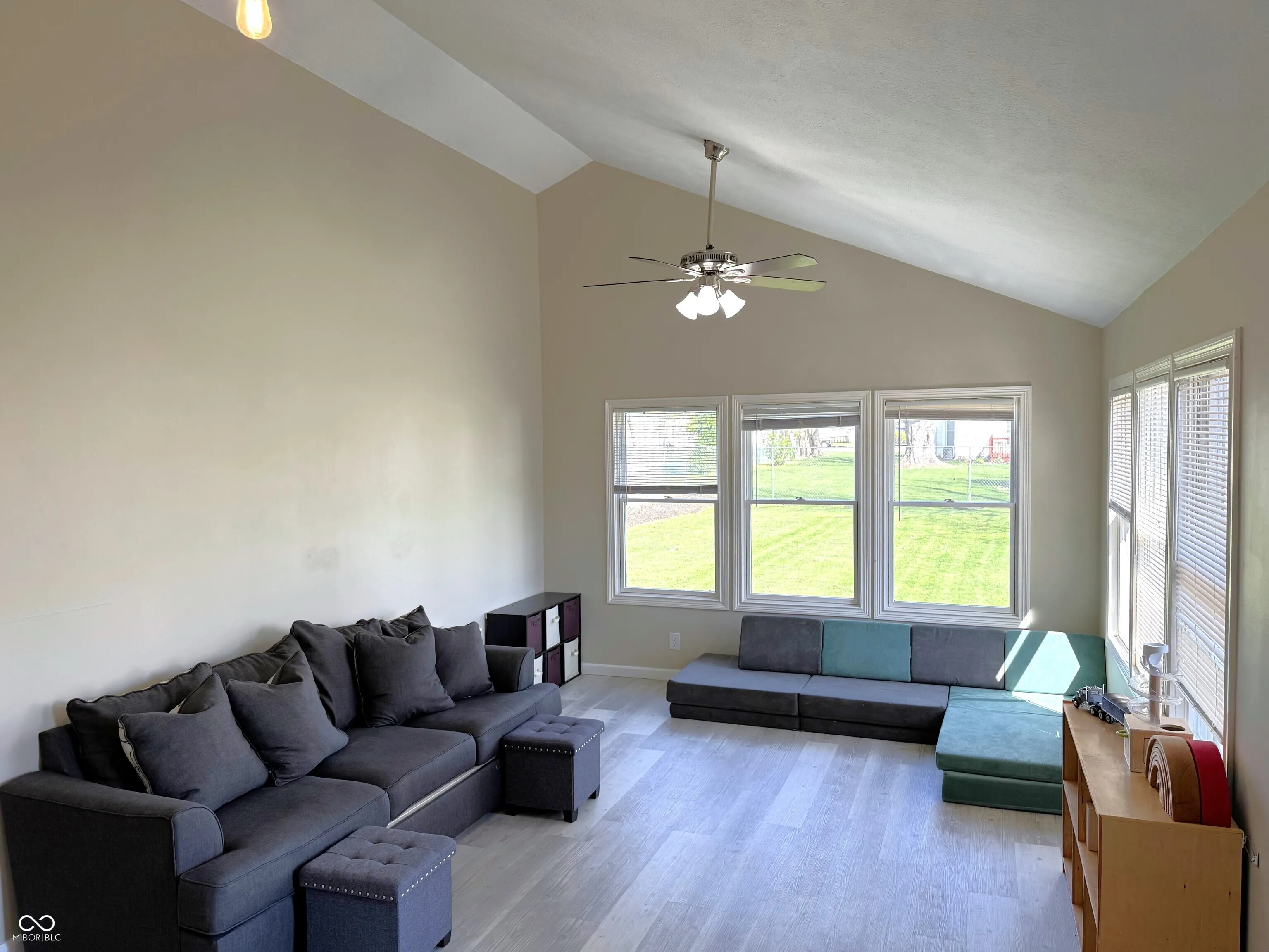 Spacious two-story home in Ladoga with over 2,600 square feet of living space on a quarter-acre lot with mature trees. The main level features a living room with an electric fireplace, a formal dining room, a skylight-lit kitchen with newer appliances (including a one-year-old dishwasher), and a sunroom that adds flexible living or entertaining space. Vaulted and high ceilings throughout give the home an open, airy feel. A main-level laundry room with a two-year-old washer and dryer, plus a full bath with double vanity and a half bath, round out the first floor. Upstairs, three generously sized bedrooms offer plenty of room to spread out. Recent updates include new vinyl plank flooring, and the roof is just two years old. Outside, enjoy a covered front porch, a large wood deck, and a fully fenced backyard. The unfinished basement provides additional storage. Ladoga Elementary (rated 9/10) and new Ladoga playground are a short walk away.