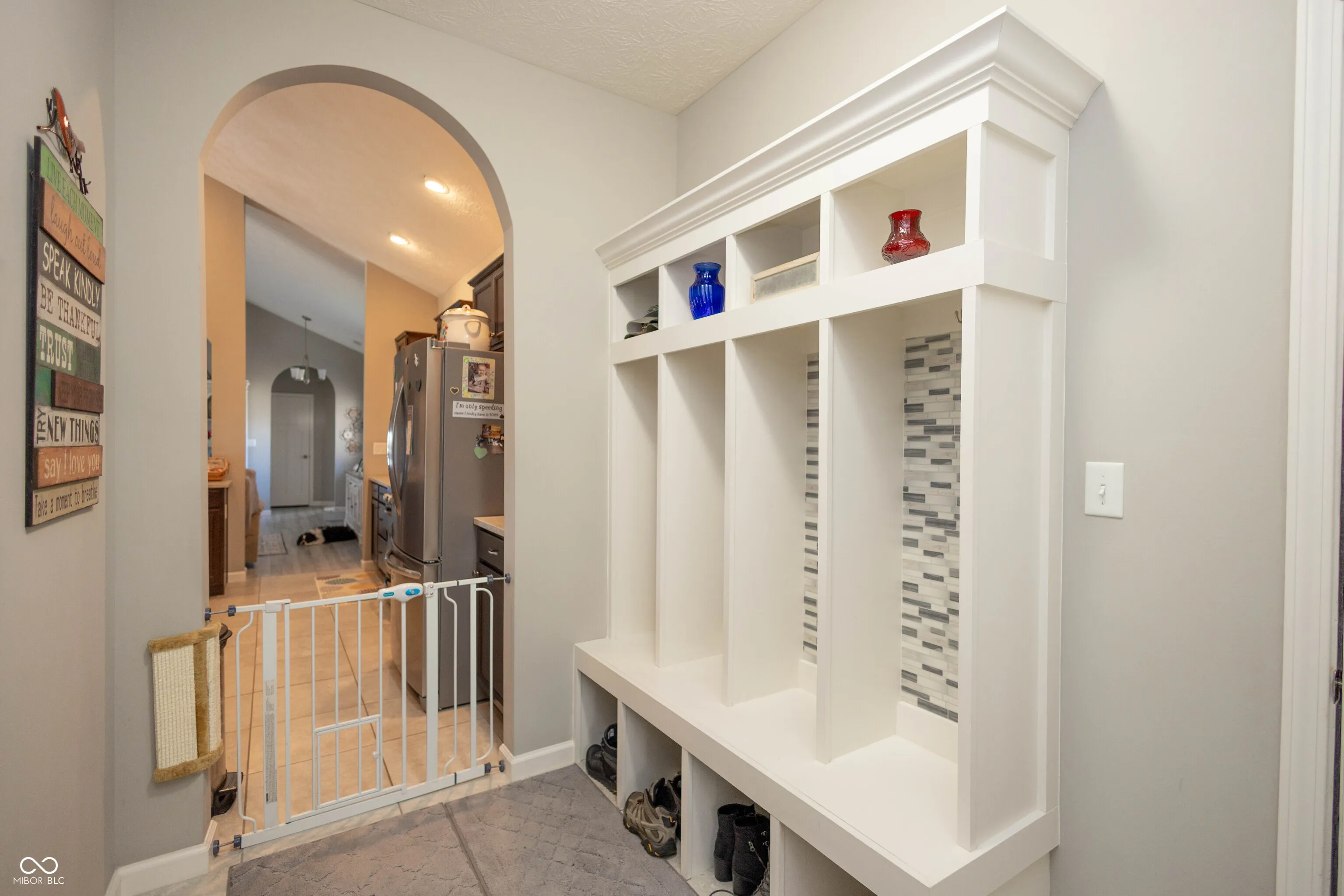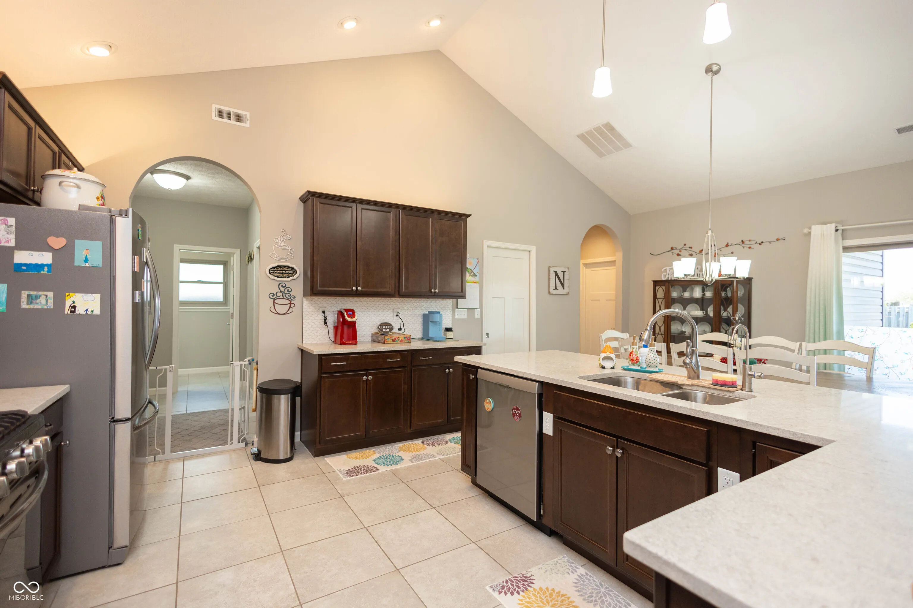 Welcome home to this beautifully designed 4-bedroom, 2.5-bath residence that perfectly combines comfort, functionality, and timeless character. Step inside to a spacious open floor plan featuring soaring vaulted ceilings that extend from the living room into the kitchen, creating a bright and inviting atmosphere. Unique architectural touches like arched openings in the hallways and kitchen add warmth and charm throughout. The living room is finished with durable luxury vinyl tile, while the bedrooms offer plush carpeting and the kitchen, mudroom, and baths feature stylish 18-inch tile. The kitchen is a standout, offering generous space with granite countertops, staggered cabinetry with crown molding, a subway tile backsplash, and stainless steel appliances. A separate built-in counter and cabinet area provides the perfect spot for a coffee bar, extra prep space, or additional storage. The eat-in kitchen layout makes both everyday living and entertaining a breeze. The thoughtfully designed mudroom includes built-in storage, a convenient half bath, and a large laundry room complete with its own counter space and sink. Pocket doors throughout the home enhance both functionality and space efficiency. The split floor plan offers added privacy, with a spacious primary suite featuring tray ceilings, a large en-suite bath with double vanities, a custom tiled shower, and a walk-in closet. Bedrooms three and four share a Jack-and-Jill bathroom, ideal for family or guests. Step outside to enjoy a fully fenced backyard, perfect for privacy and relaxation, along with a large covered patio for entertaining. Additional features include a 3-car garage, a sprinkler system in the front yard, a reverse osmosis water system, and recently installed new windows that add both energy efficiency and peace of mind. Situated on a corner lot in a desirable, established neighborhood, this home offers the space, style, and upgrades you’ve been looking for.