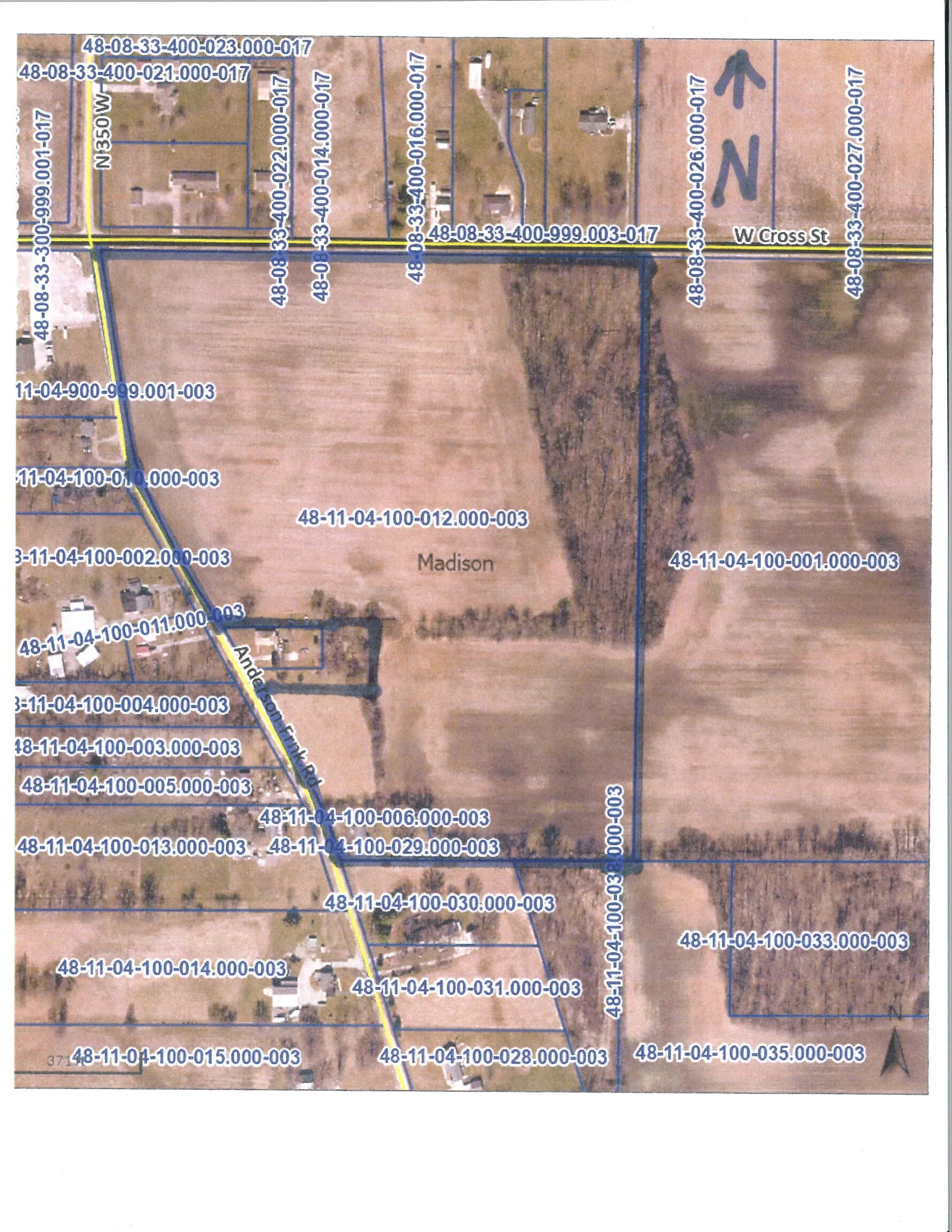 34+- acre farm that is mostly tillable located at the southeast corner of west Cross Street (200 N) and Anderson-Frankton Road (350 W). Lots of road frontage and several acres of woods.