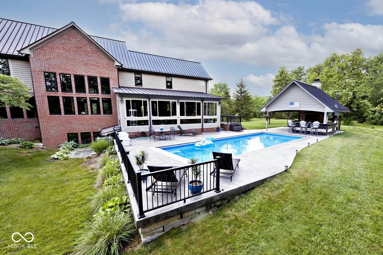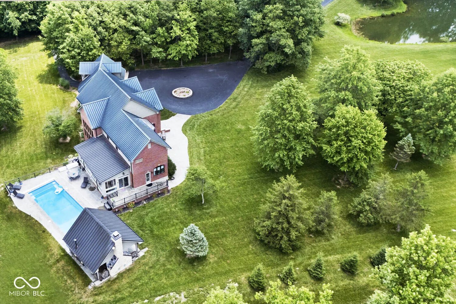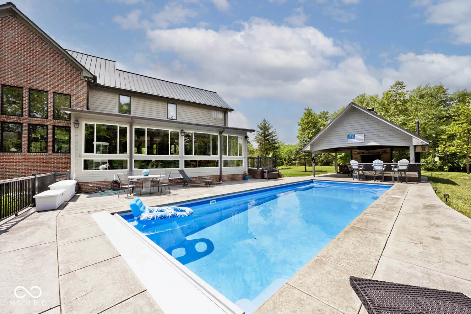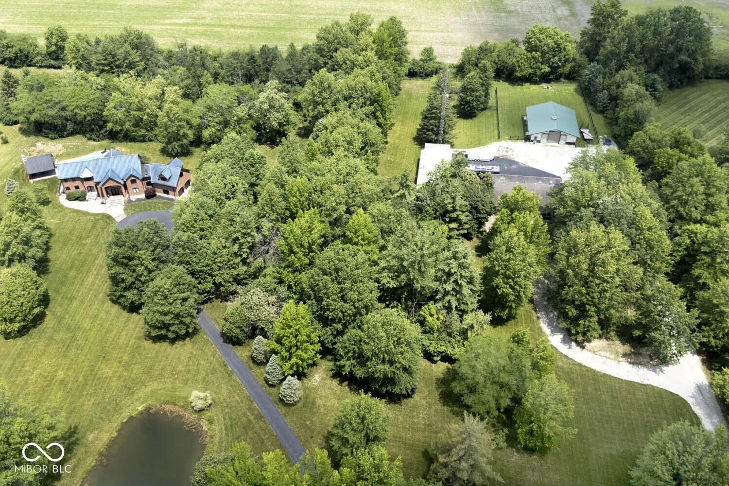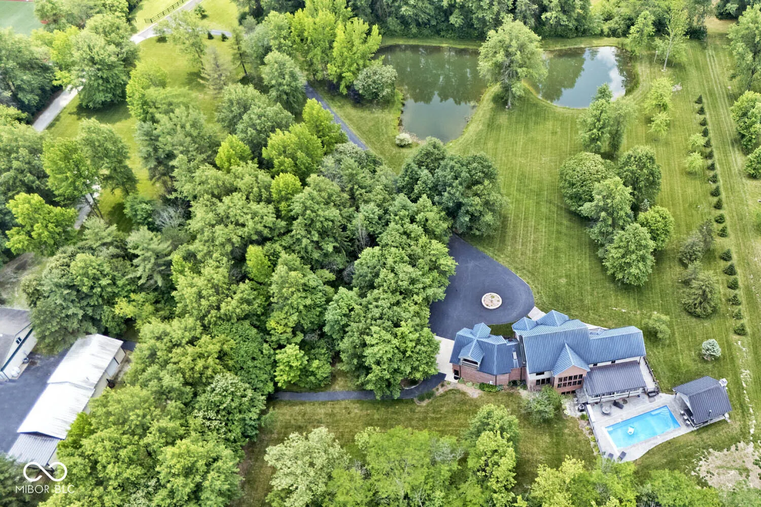 Serenity in the country on nearly 12 acres in New Palestine with no HOA. This beautiful home offers warmth and personality at every turn. This home features a dramatic two-story foyer and great room. The kitchen features quartz countertops, a large pantry and it opens up to inviting living areas designed for everyday living and hosting. Multiple gathering spaces throughout the home create the perfect setting for relaxing, socializing and play. Discover a luxurious primary suite offering a spa-style bath with a spacious walk-in shower creating an atmosphere of sophisticated comfort and personal sanctuary on the upper level. While upstairs you will find two additional bedrooms and versatile bonus room. The basement offers a dedicated exercise room and play room. The outdoor living spaces are absolutely unmatched featuring an in-ground pool with automatic cover. The large pavilion has an outdoor kitchen with a cozy fireplace. The multiple lounge areas capture the beauty of this private homesite. As you walk the property, you will find a man cave with full apartment, horse barn with stable and tack room and a horse pasture. The outbuildings provide indoor parking for your RV. This exceptional residence offers a lifestyle of unparalleled comfort and refined elegance.